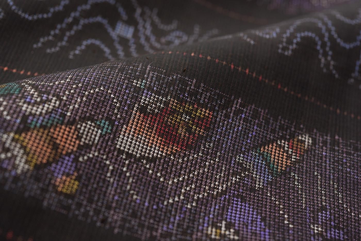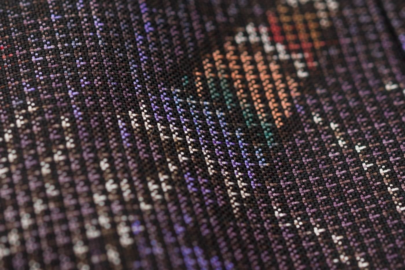 シックな地色に柄の赤や紫などが浮かび上がる洒落たデザインです。
