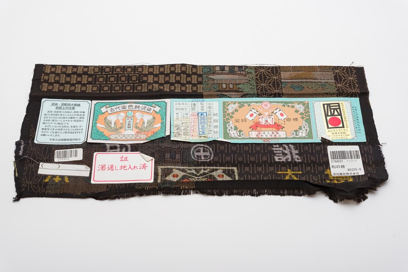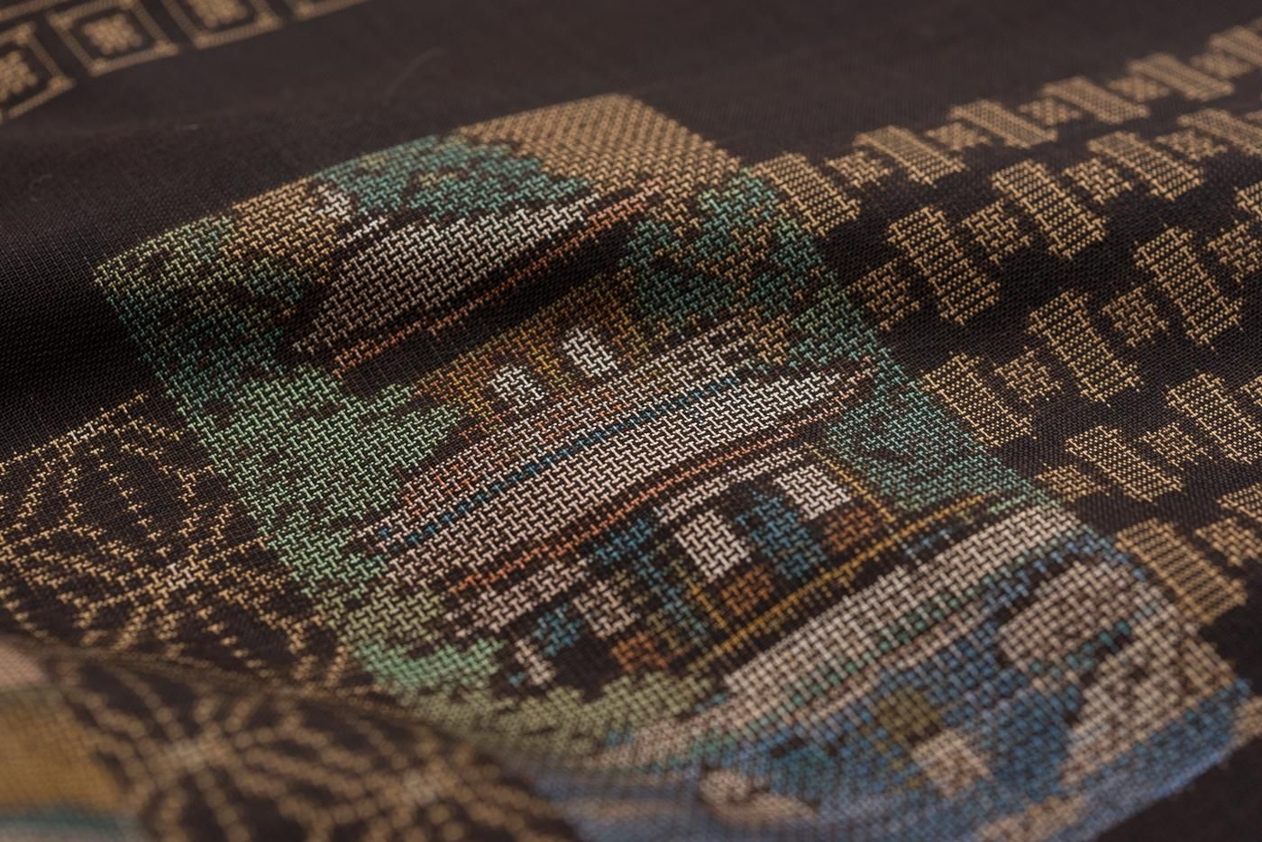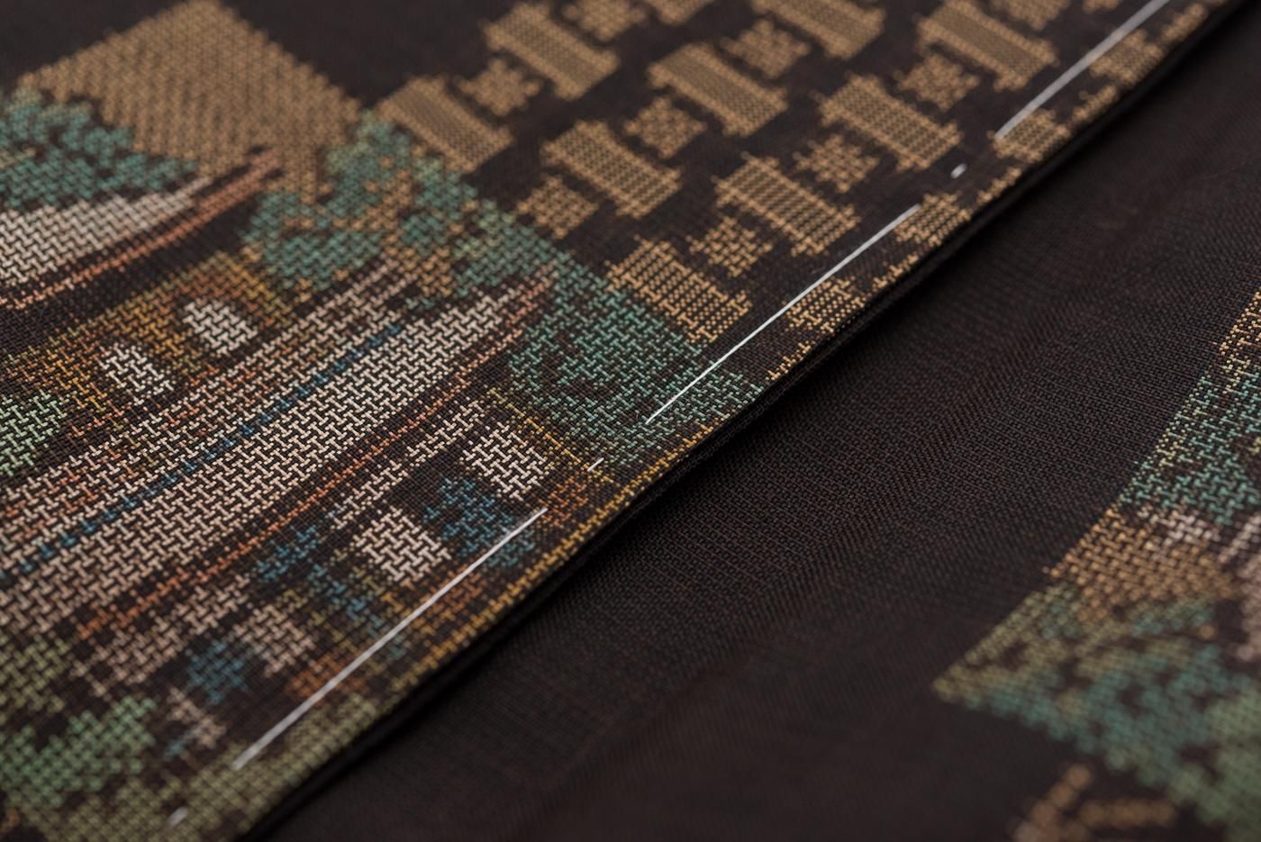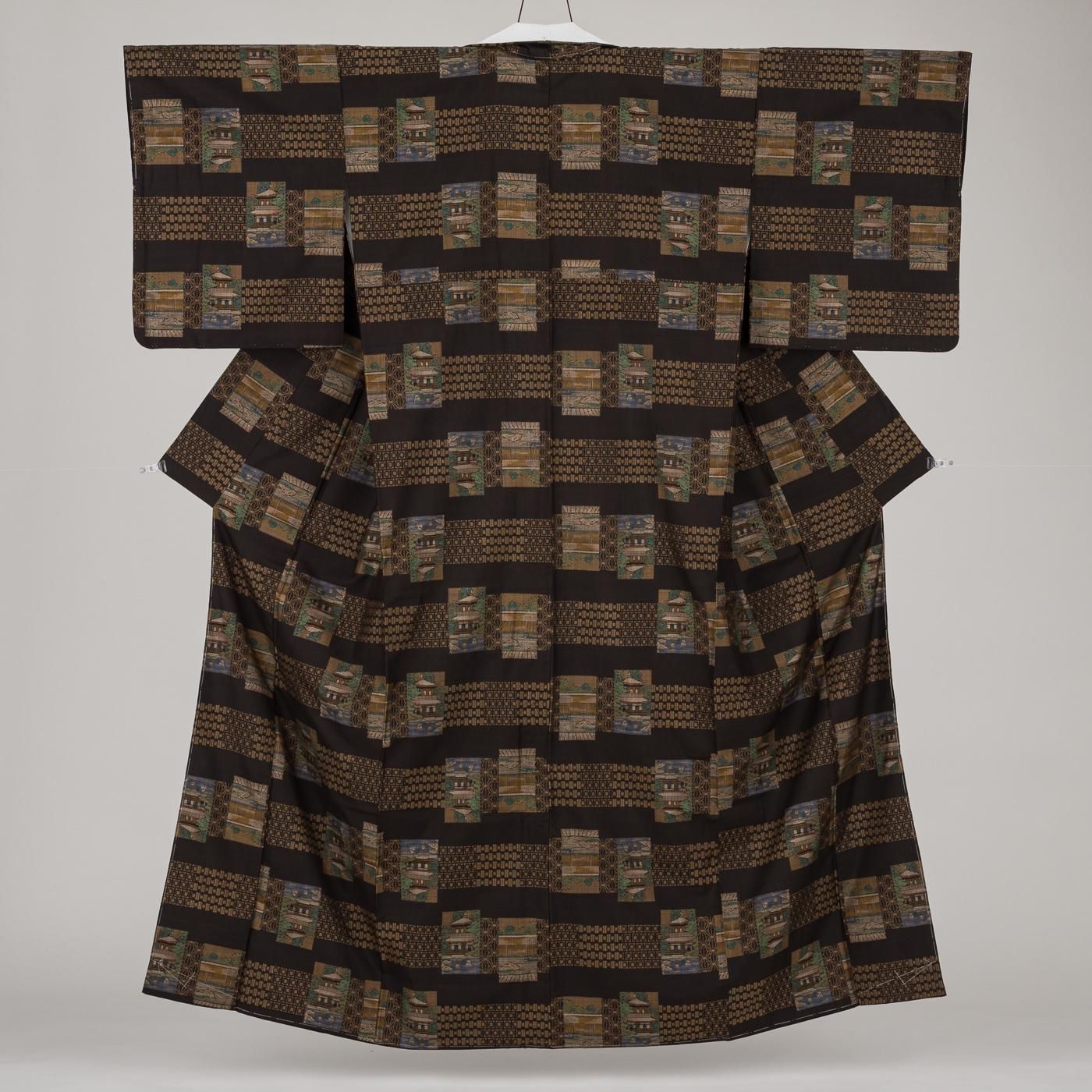 寺院柄の絵札模様を織り出した大島紬の着物です。