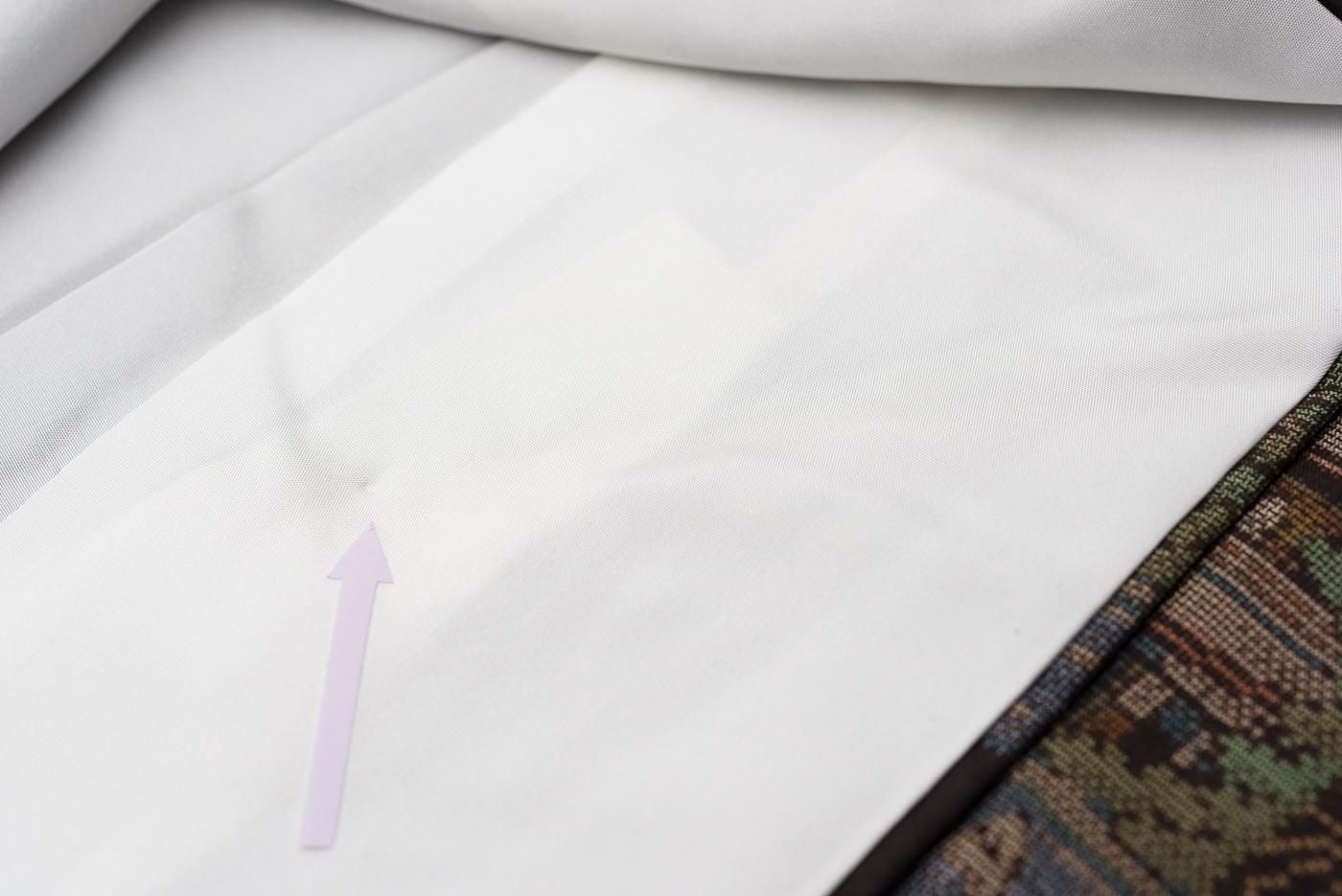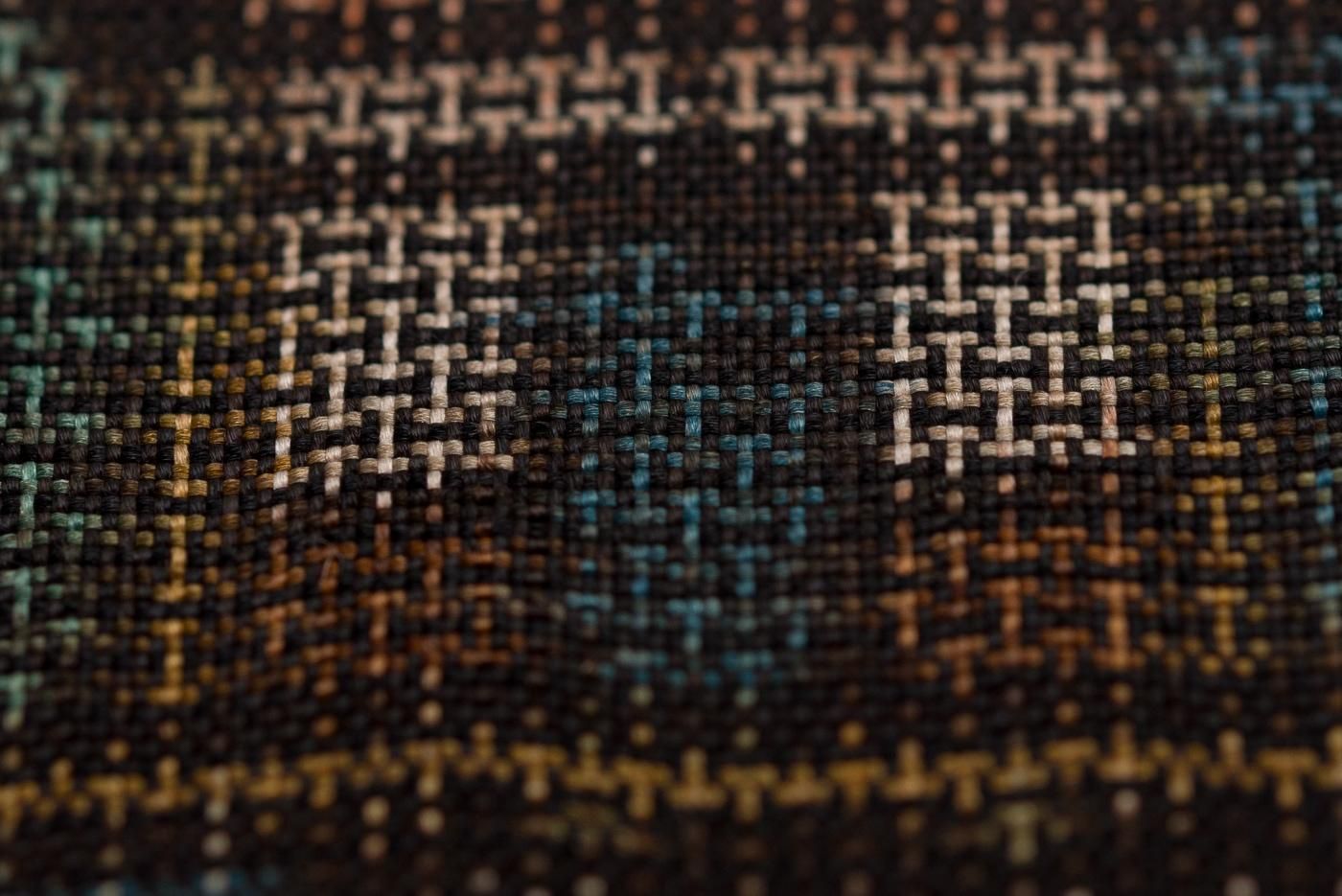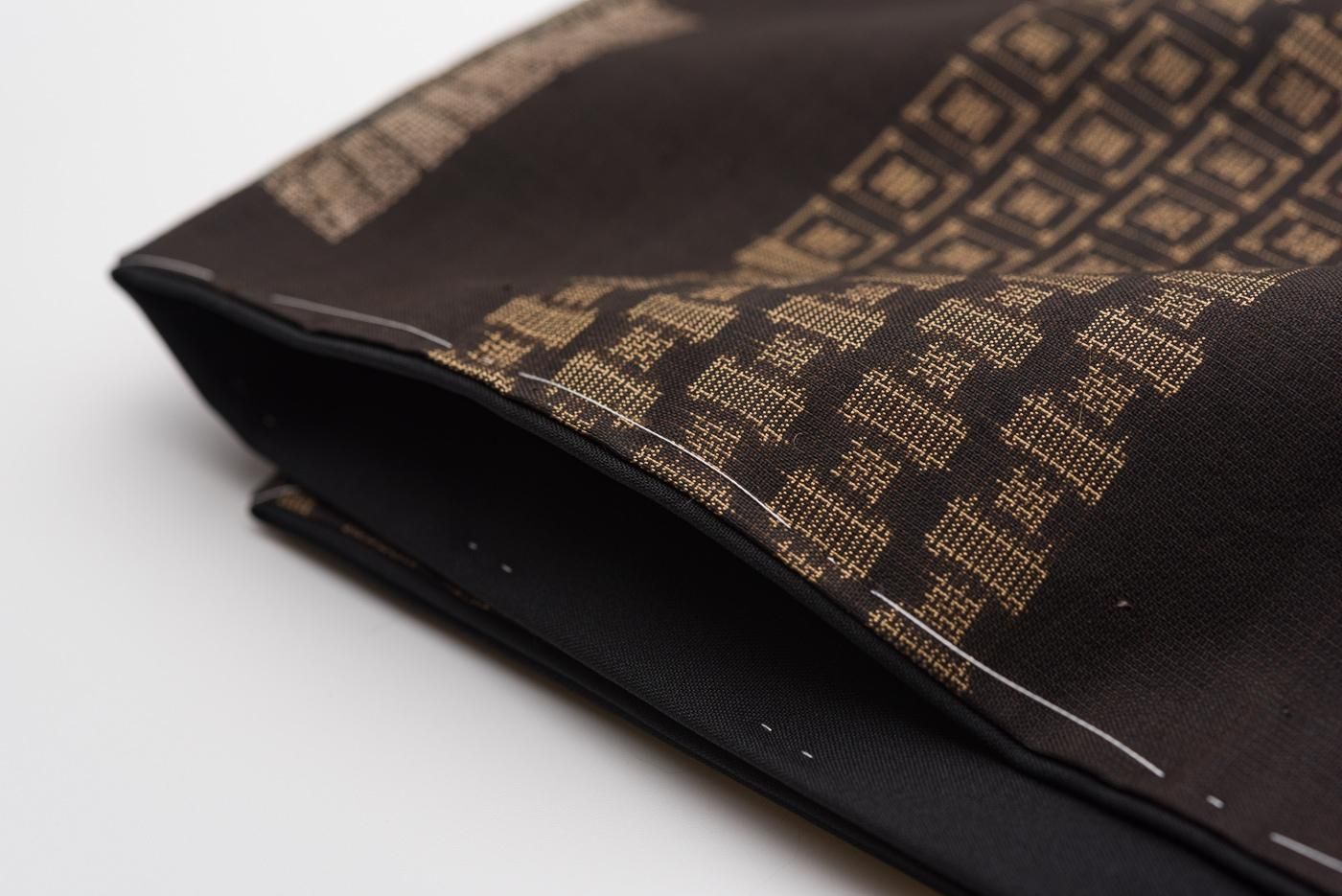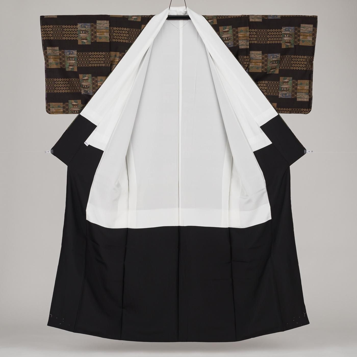 寺院柄の絵札模様を織り出した大島紬の着物です。
