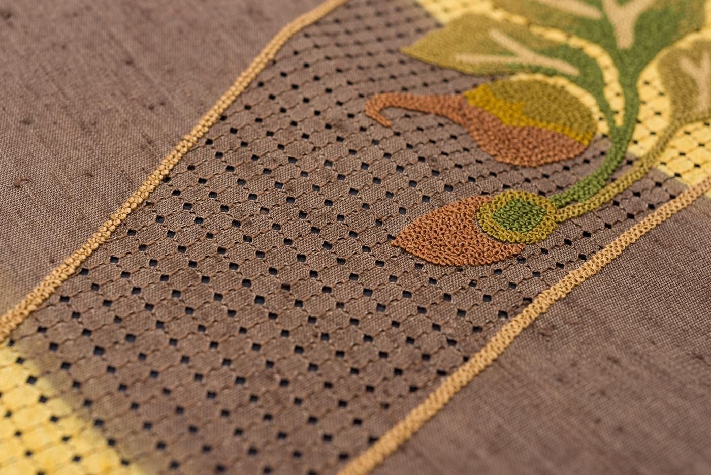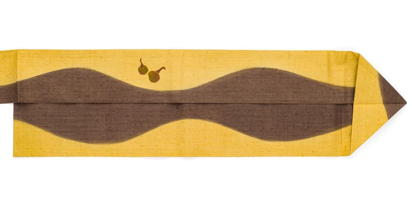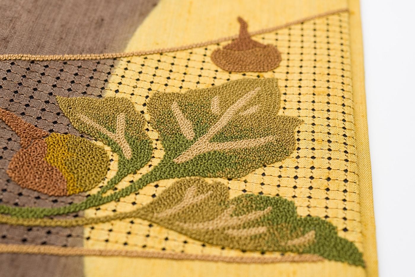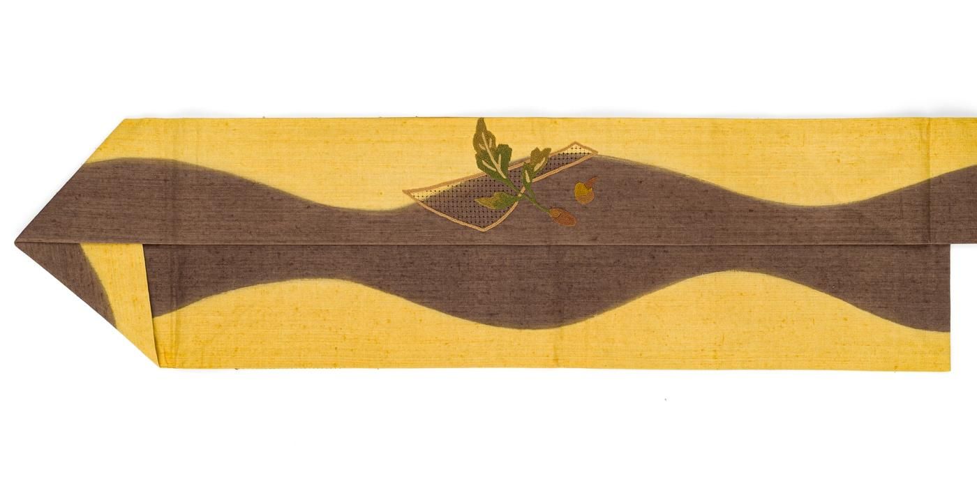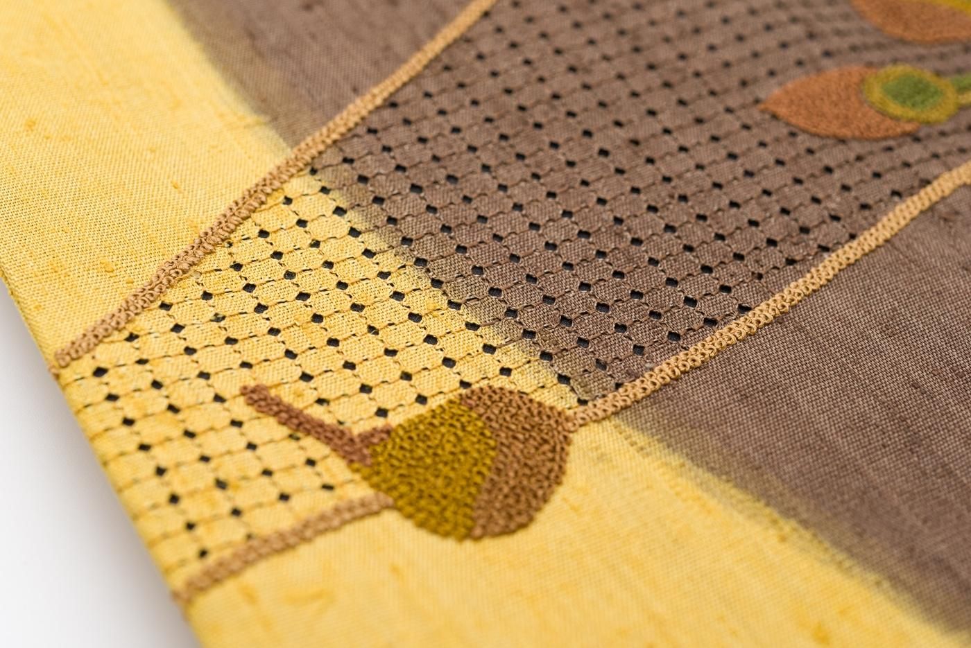 ゆらりと伸びる曲線に相良刺繍で野菜模様を表した紬地の九寸名古屋帯です。