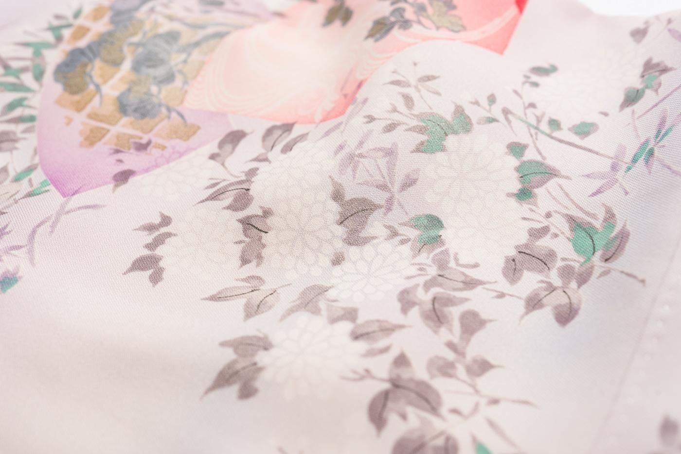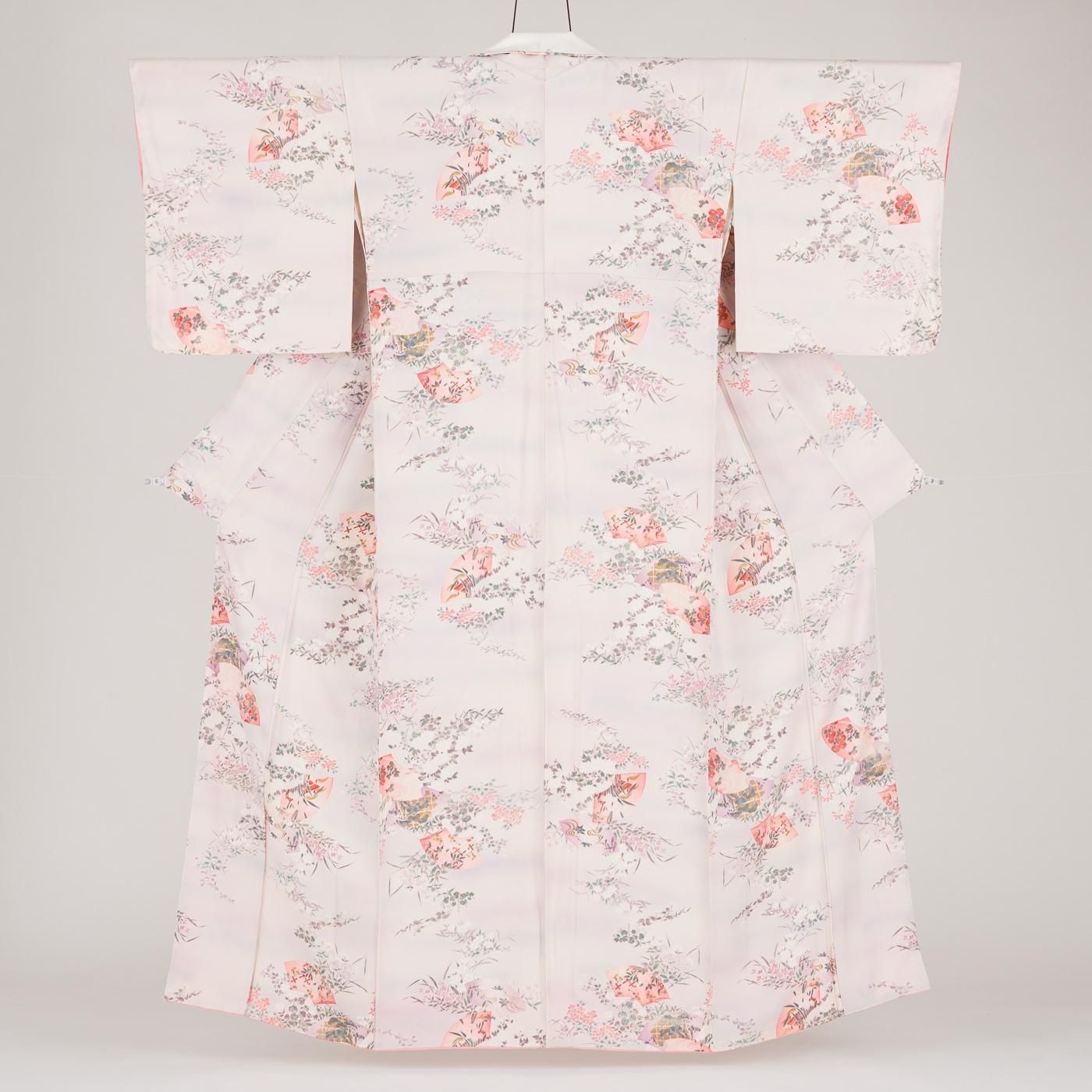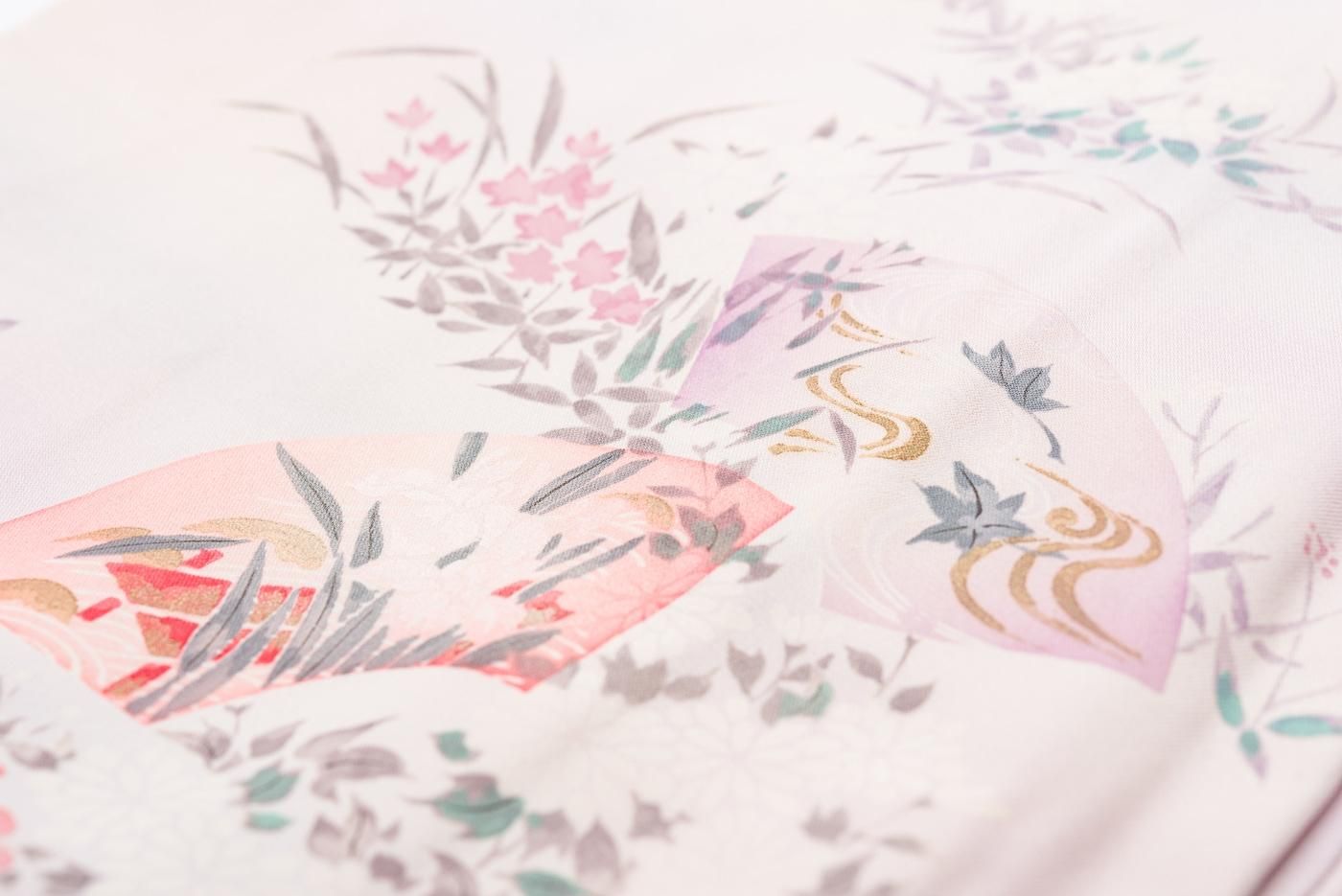 淡い桃色を基調にした暈し地に地紙と花を染めた小紋の着物です。