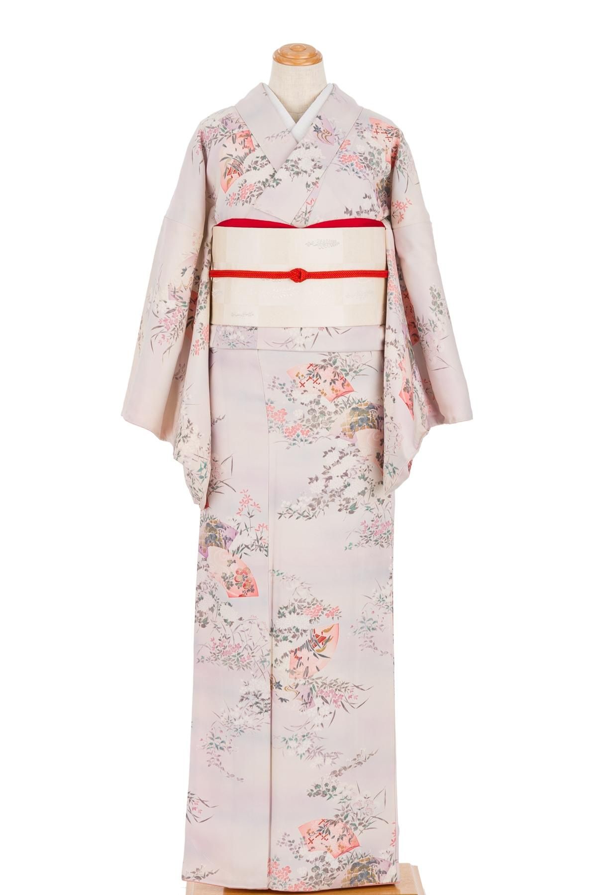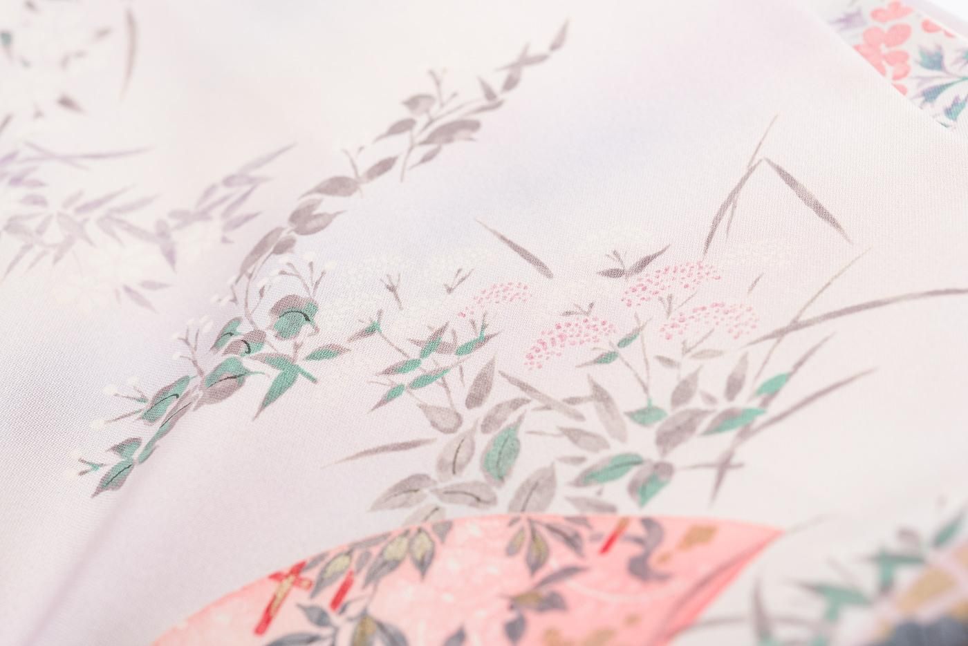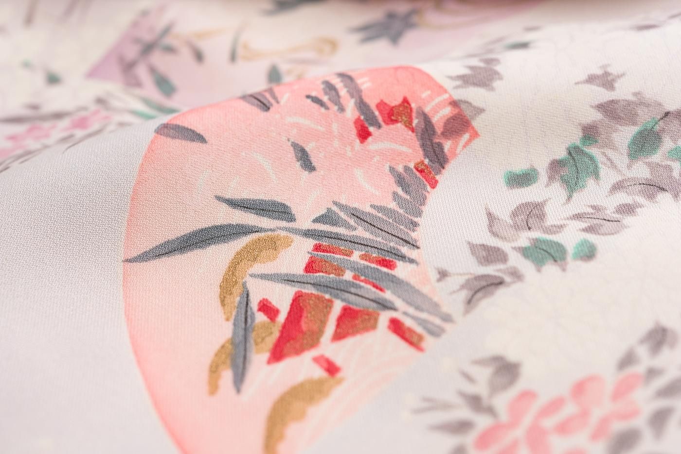 淡い桃色を基調にした暈し地に地紙と花を染めた小紋の着物です。