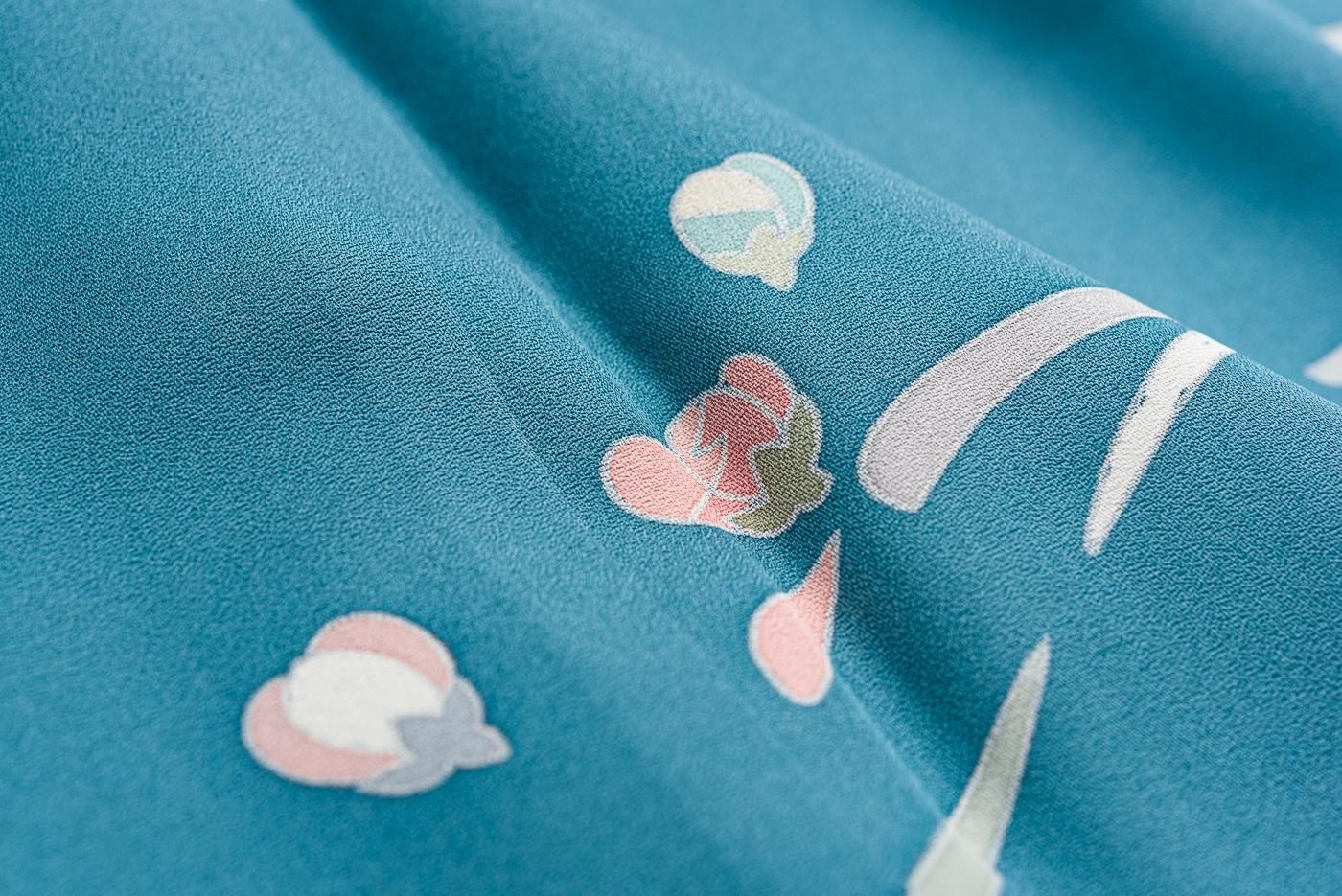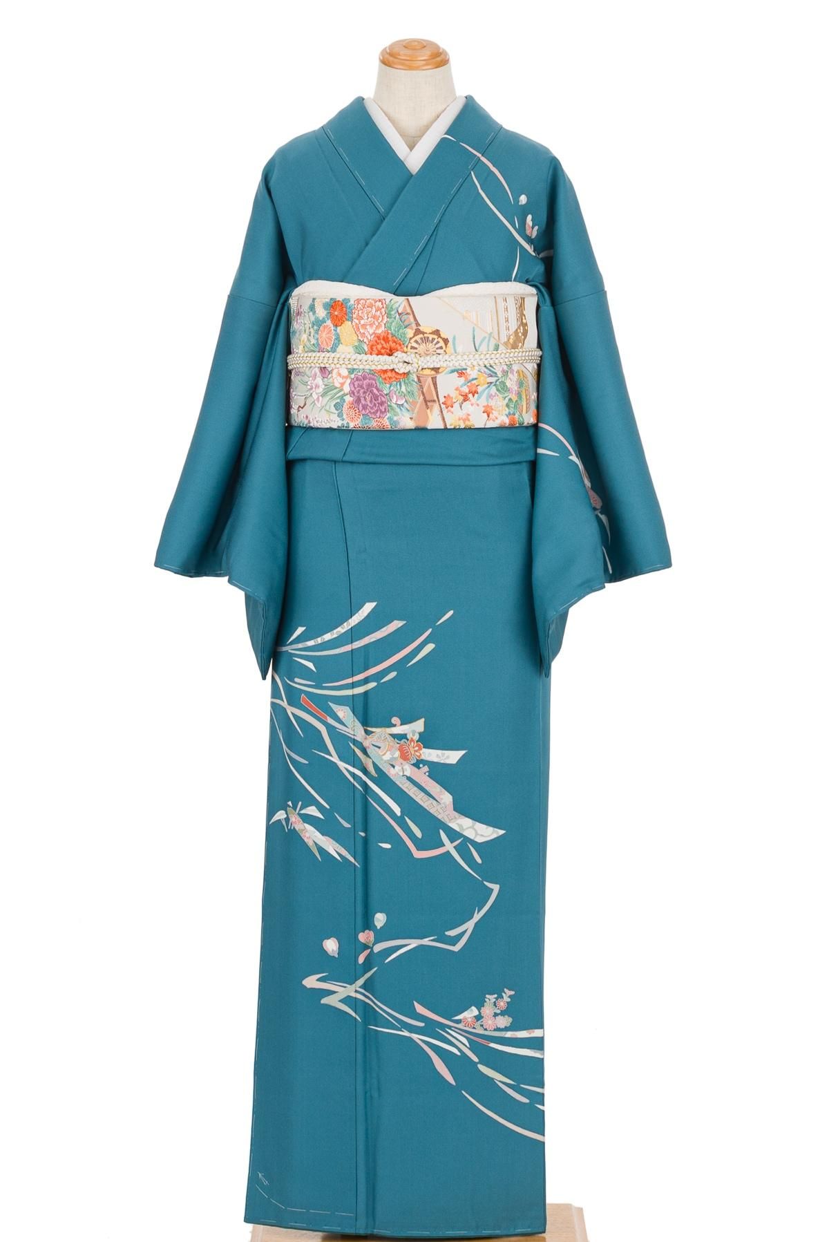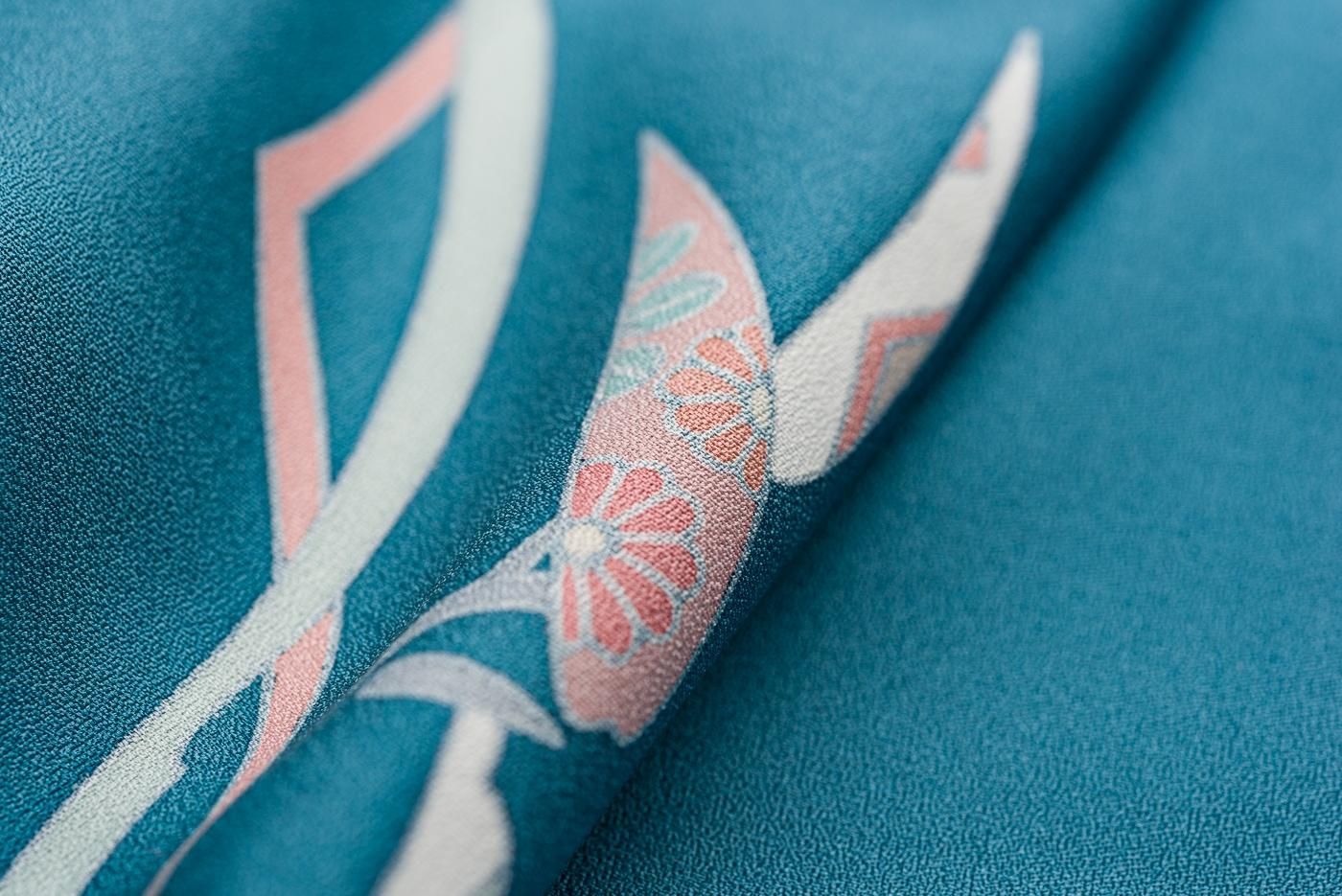 青緑色の地がすっきりとした印象で、またやや控えめの柄付けですので年齢を問わずお召しいただけるかと思います。