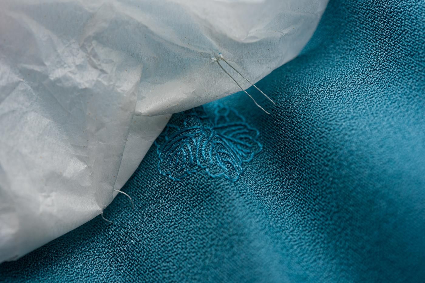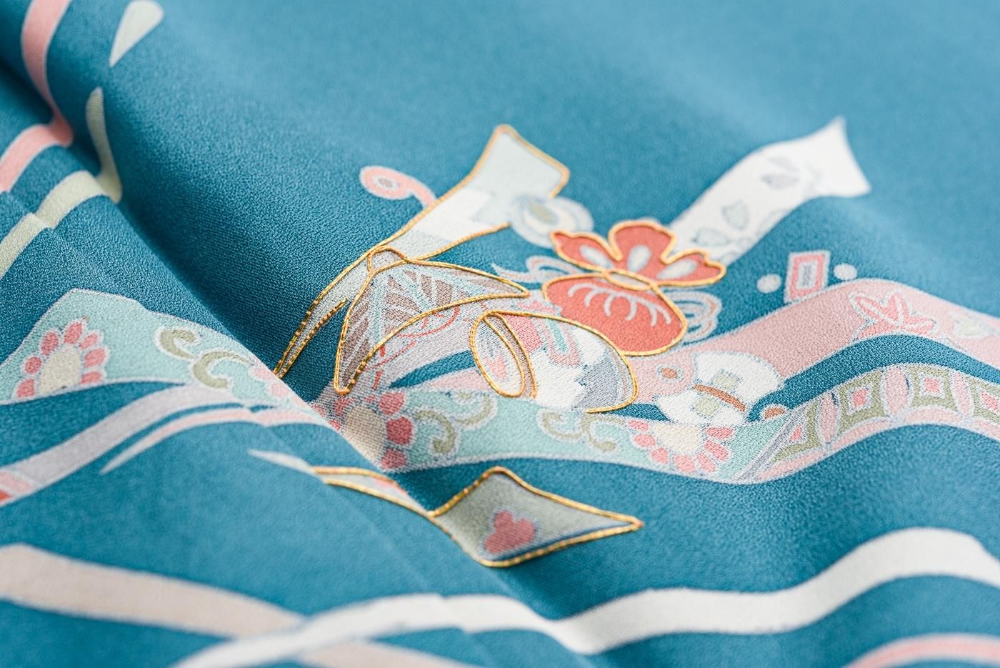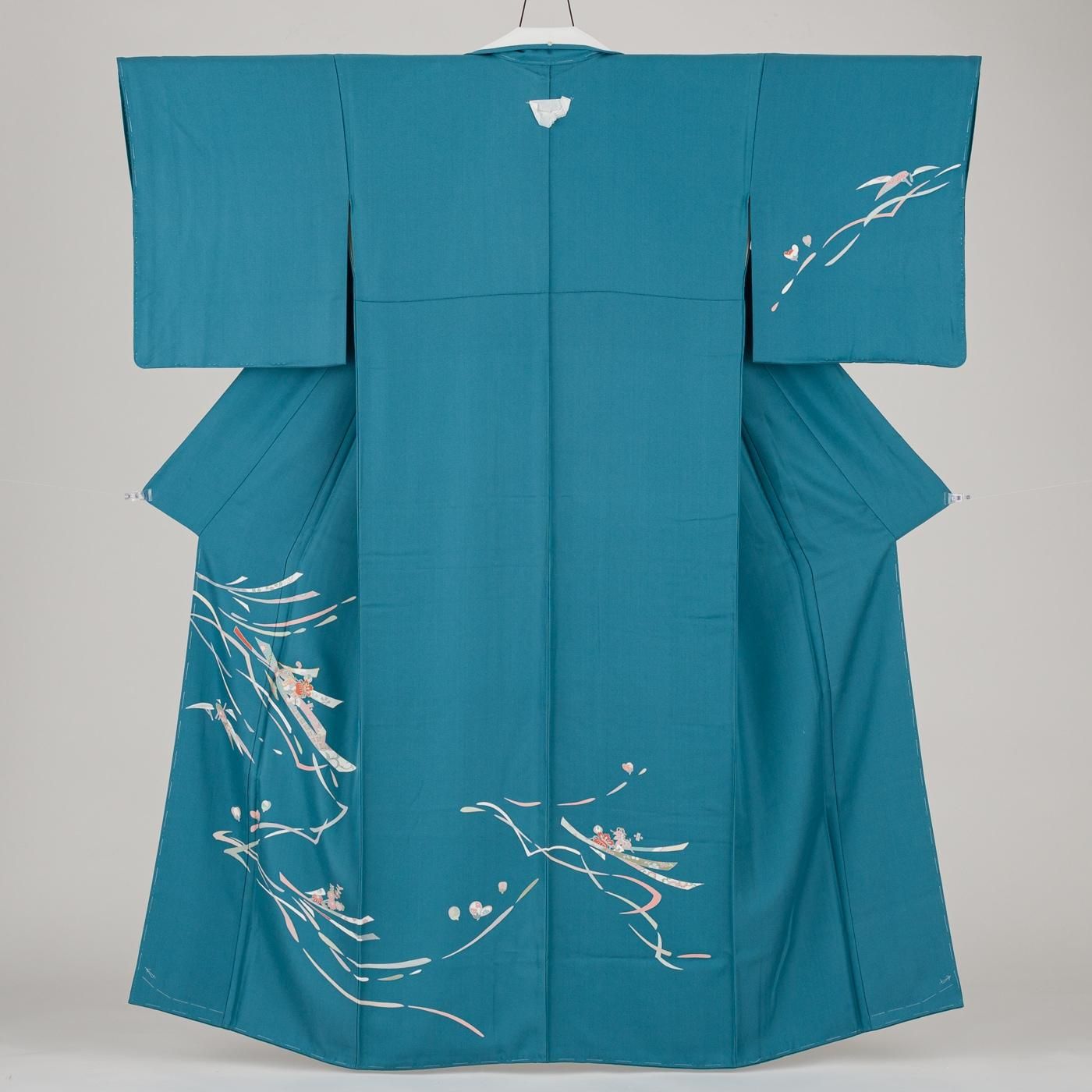 青緑色の地がすっきりとした印象で、またやや控えめの柄付けですので年齢を問わずお召しいただけるかと思います。