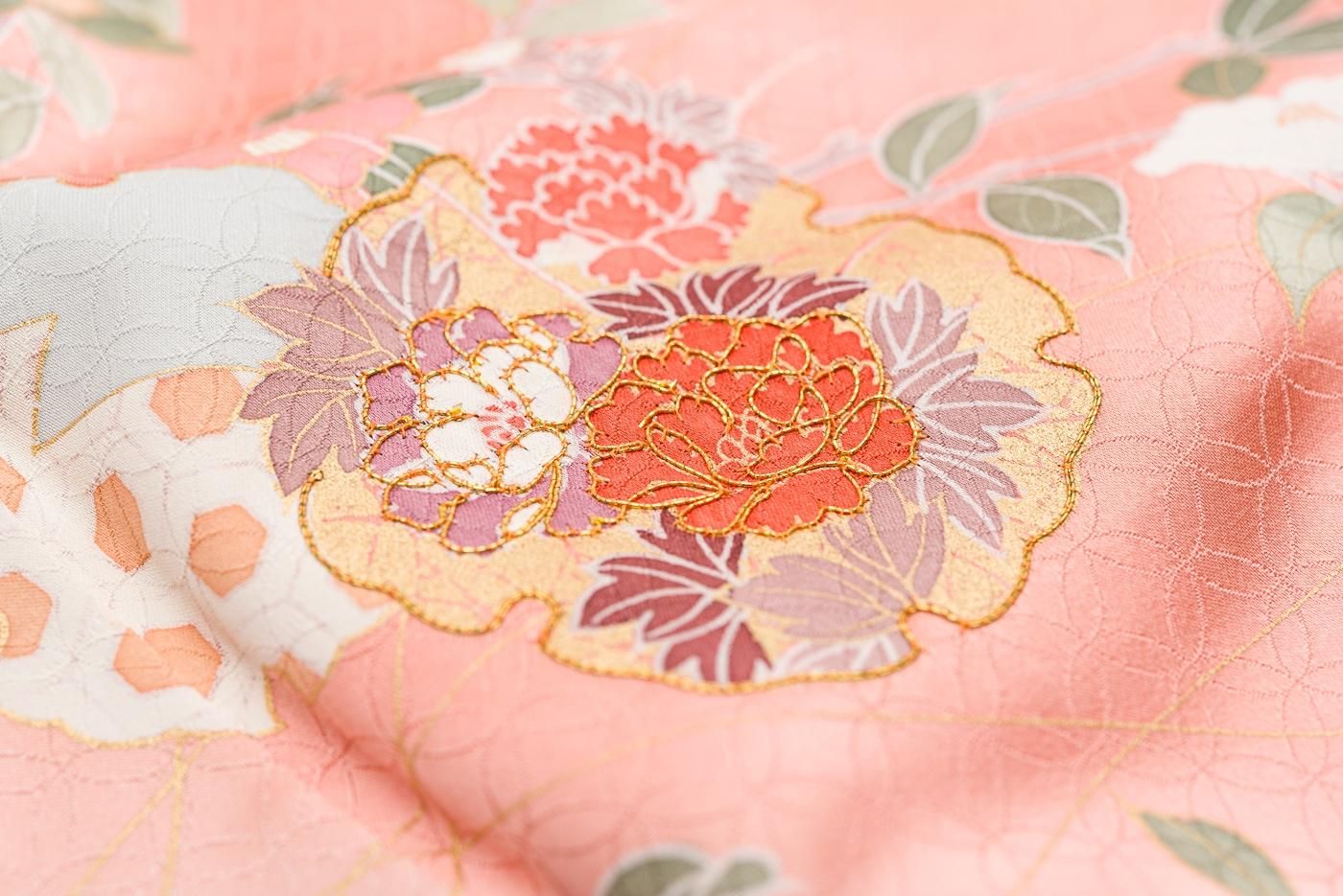 雪輪に牡丹、椿、菊、松などを添えた訪問着です。