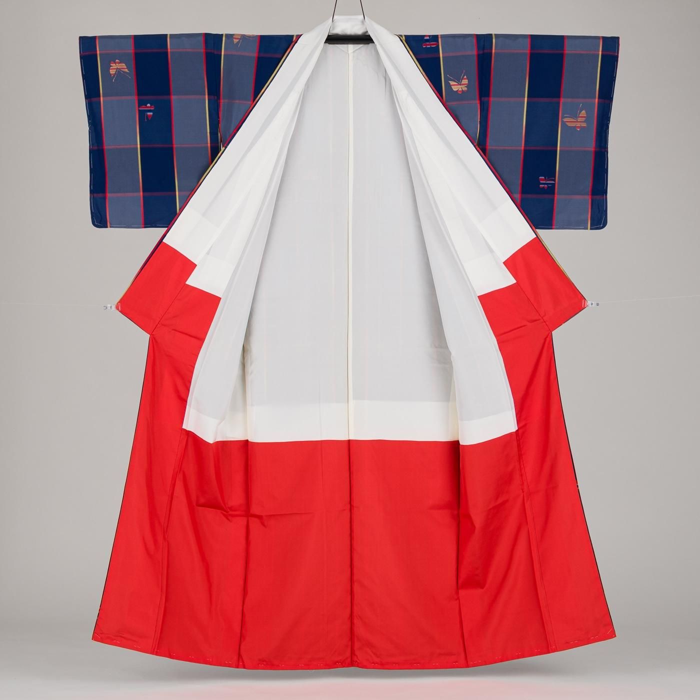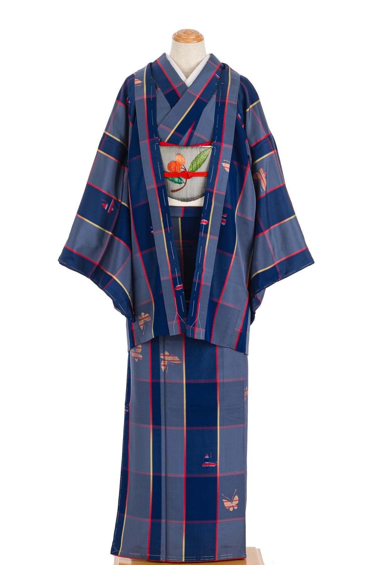 【売り切れ】 紬アンサンブル 紺地 格子に蝶々