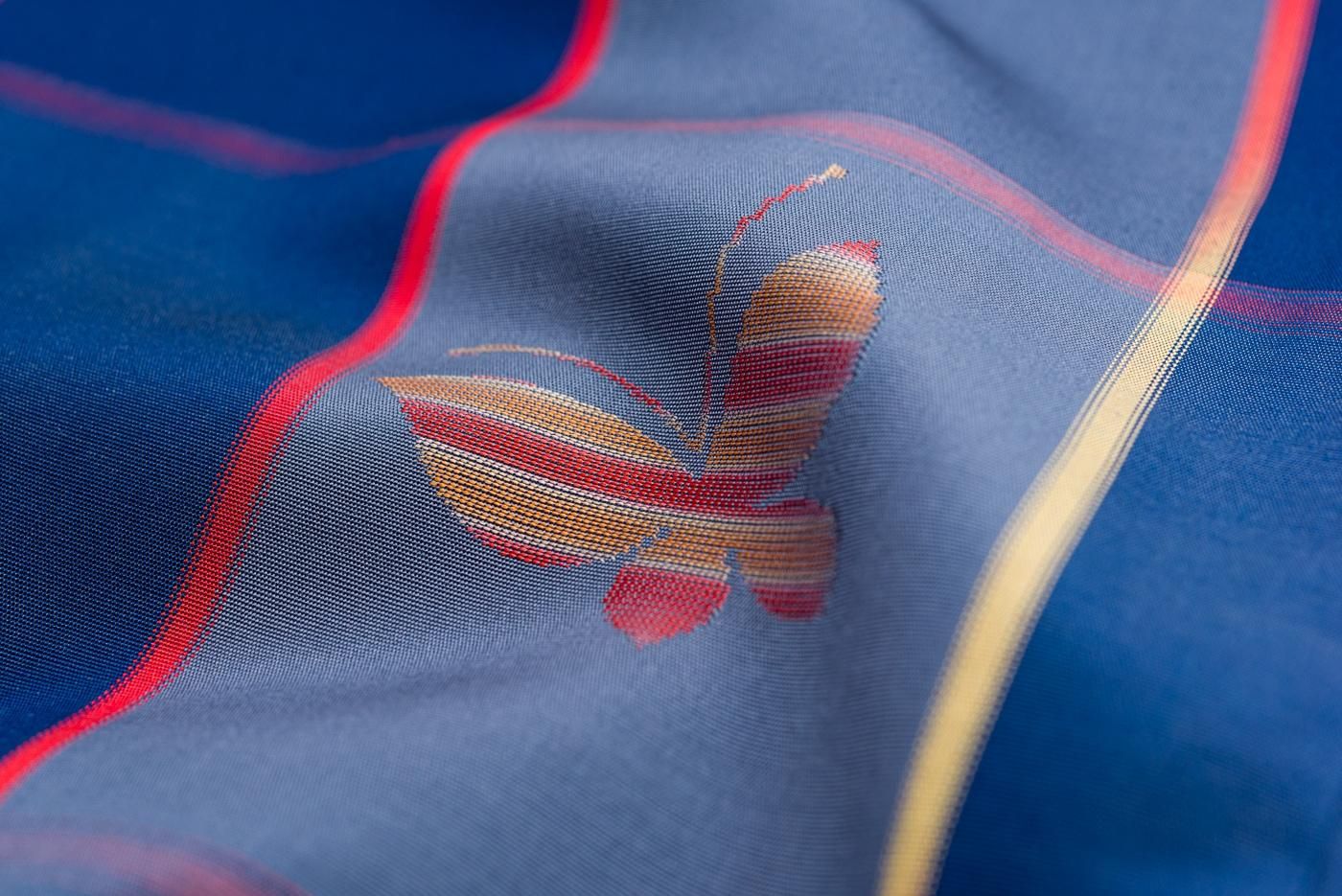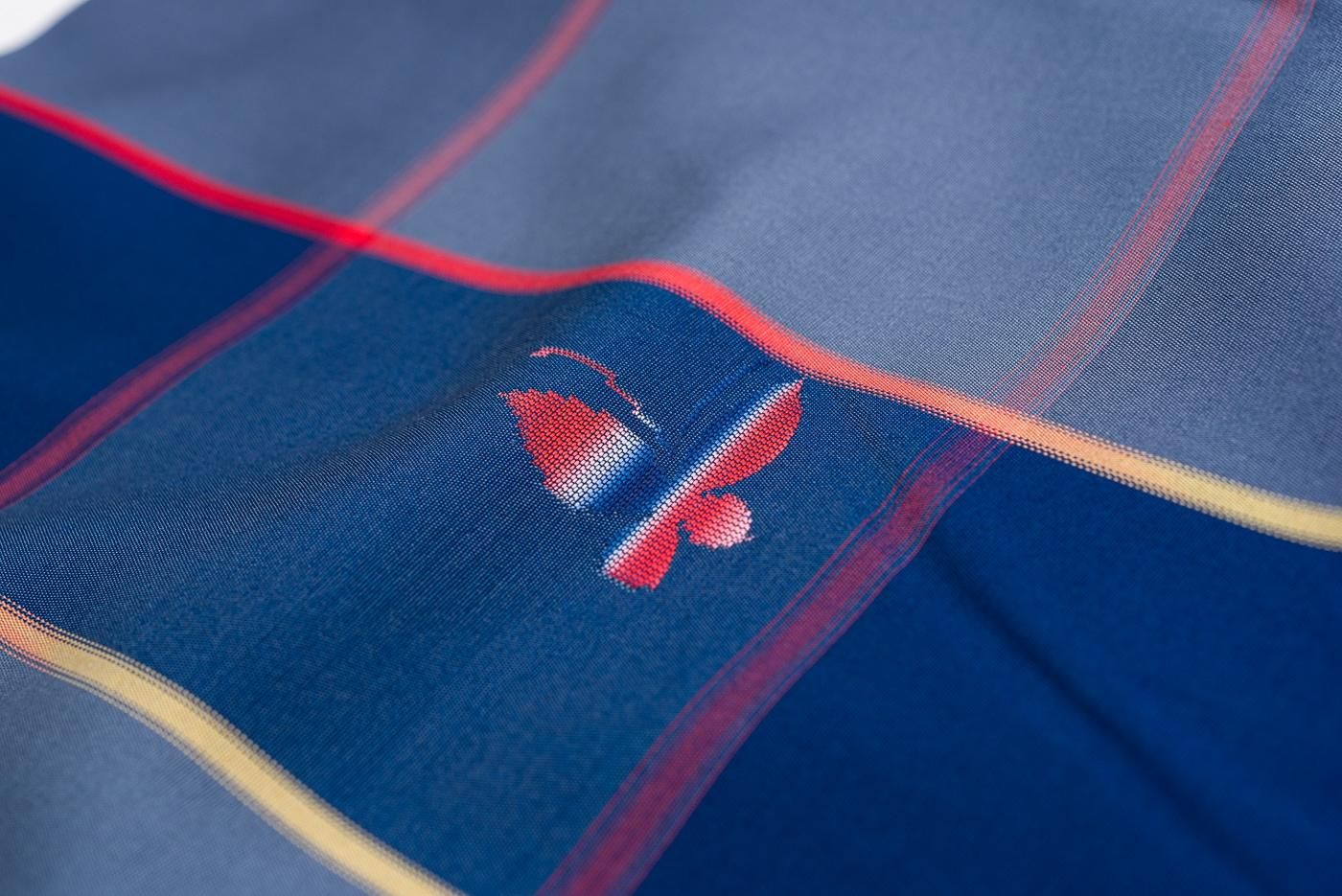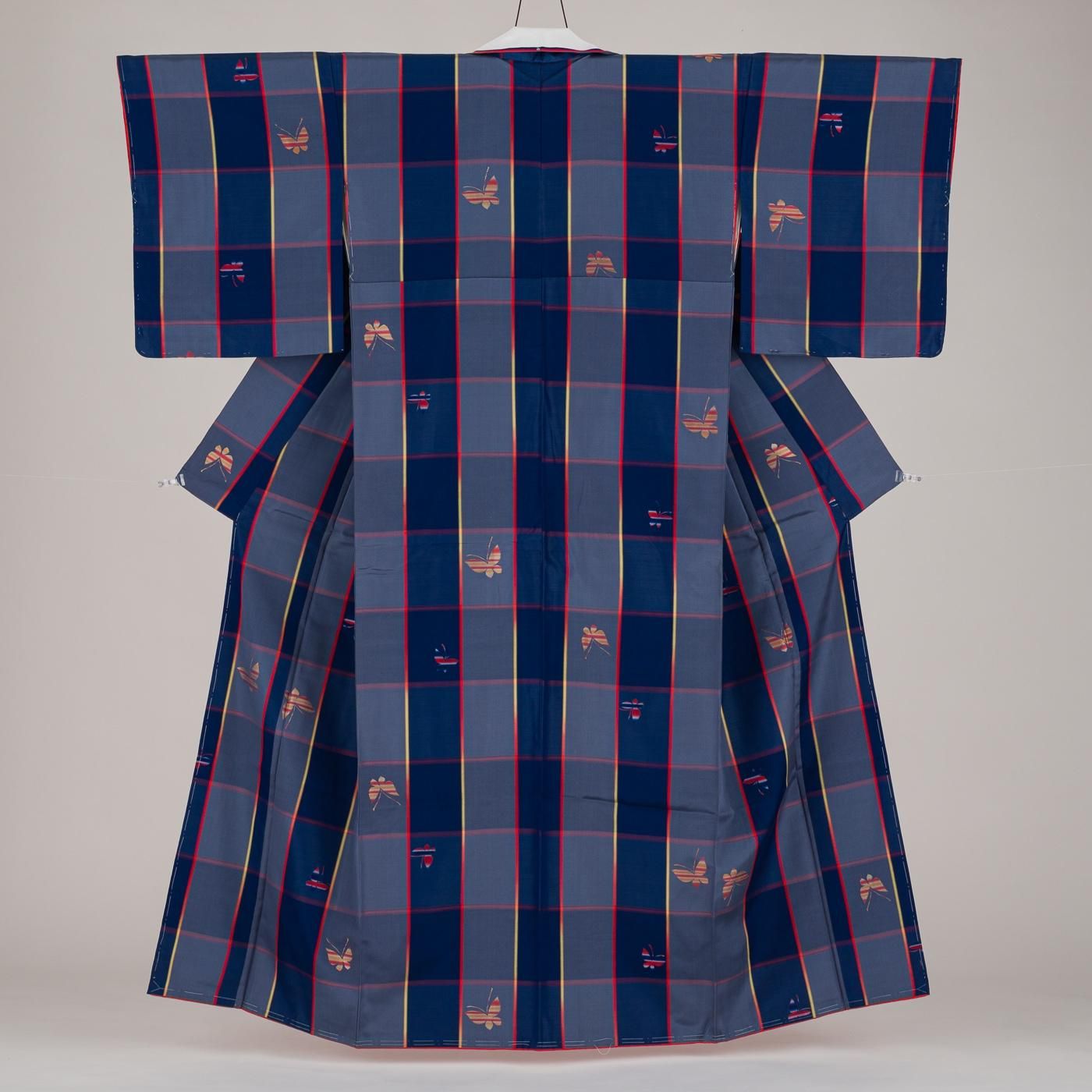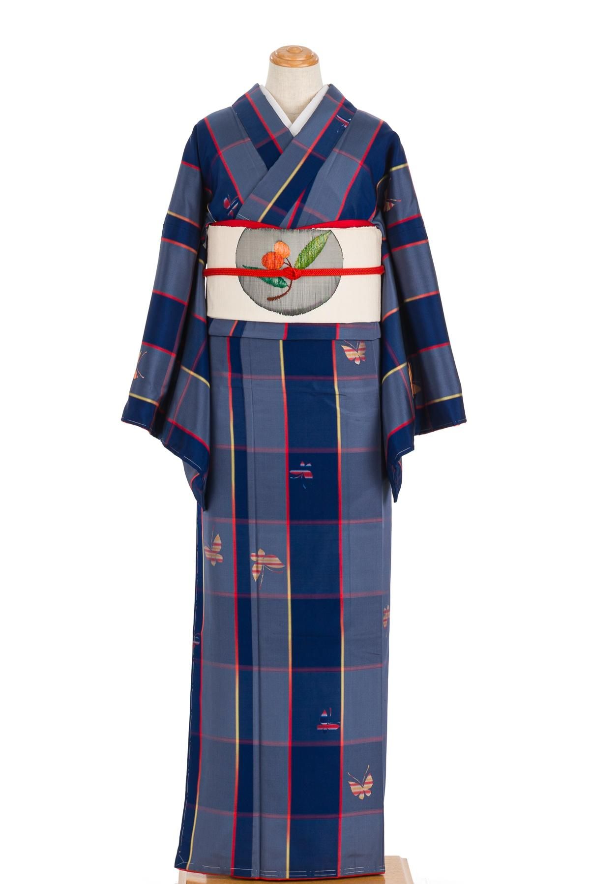 紺地に細い格子と蝶々を織り出した紬着物のアンサンブルです。