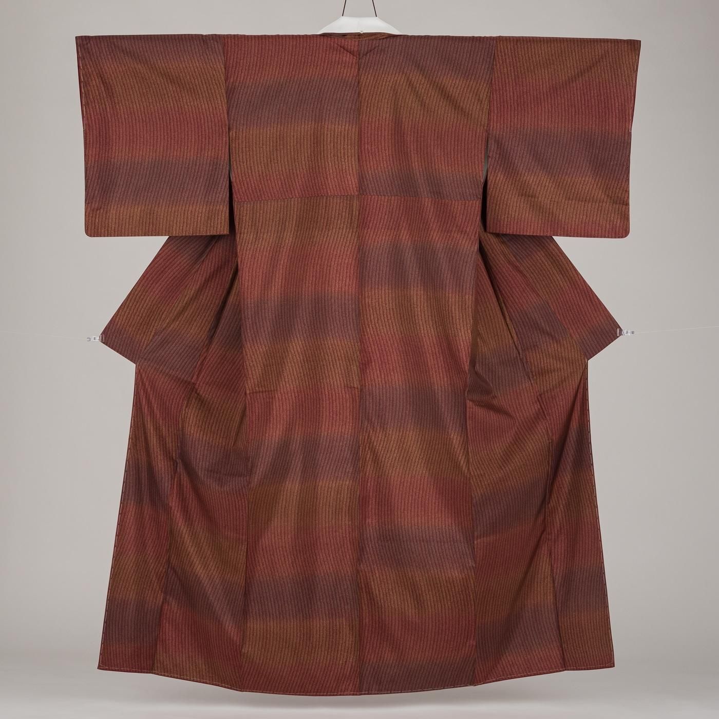 暈しの横段によろけ縞模様を重ねた染め大島の着物です。