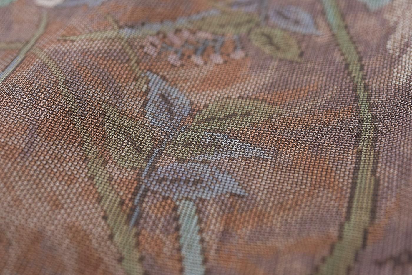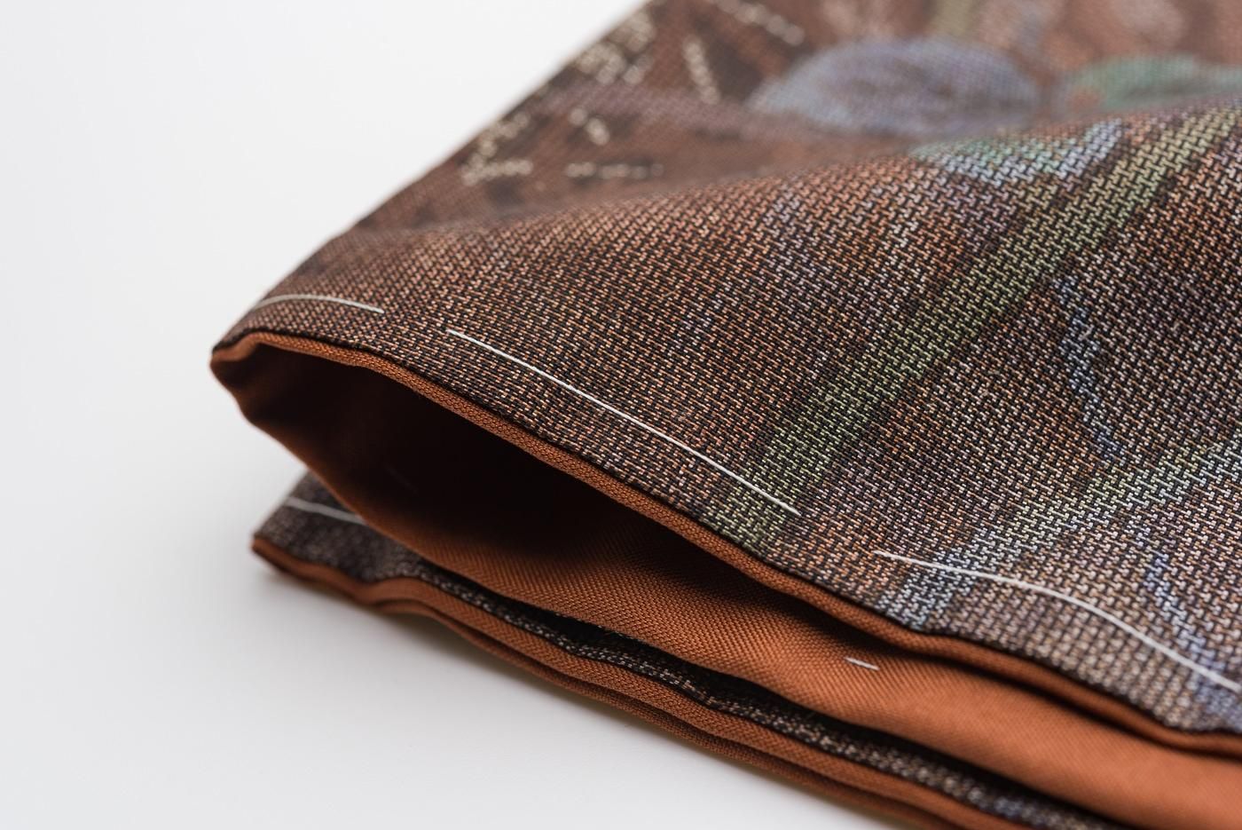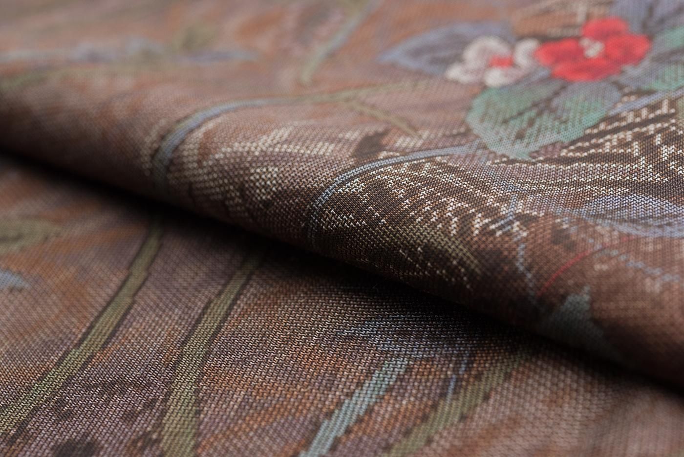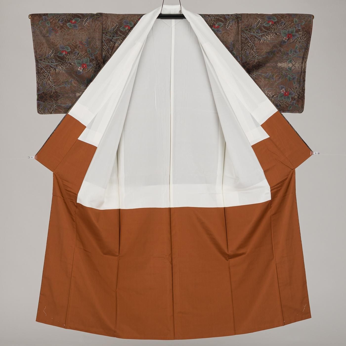 焦げ茶地に草花模様を織り出した大島紬の着物です。