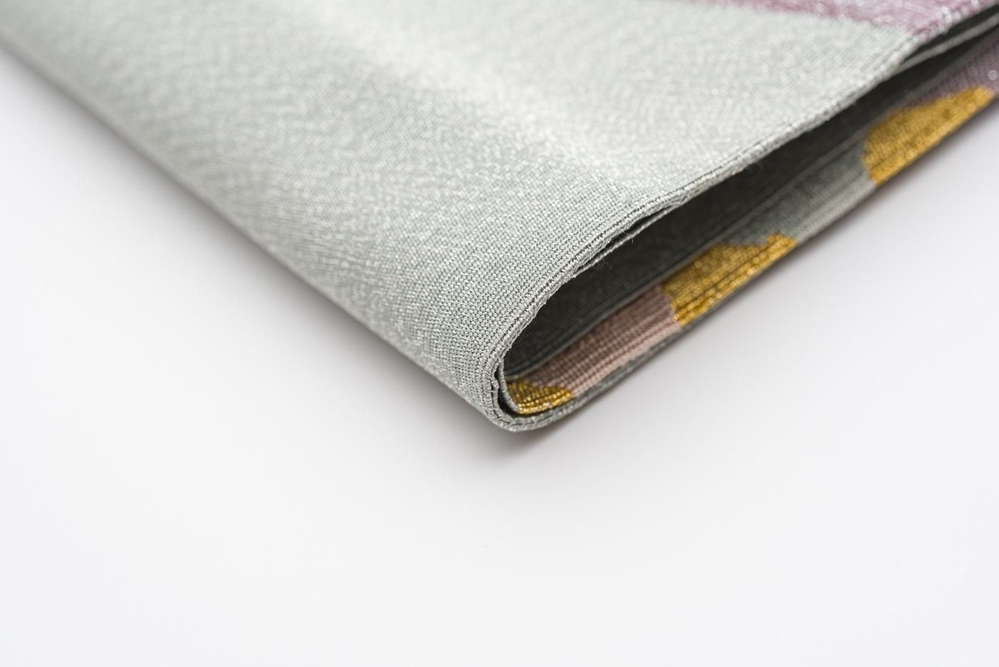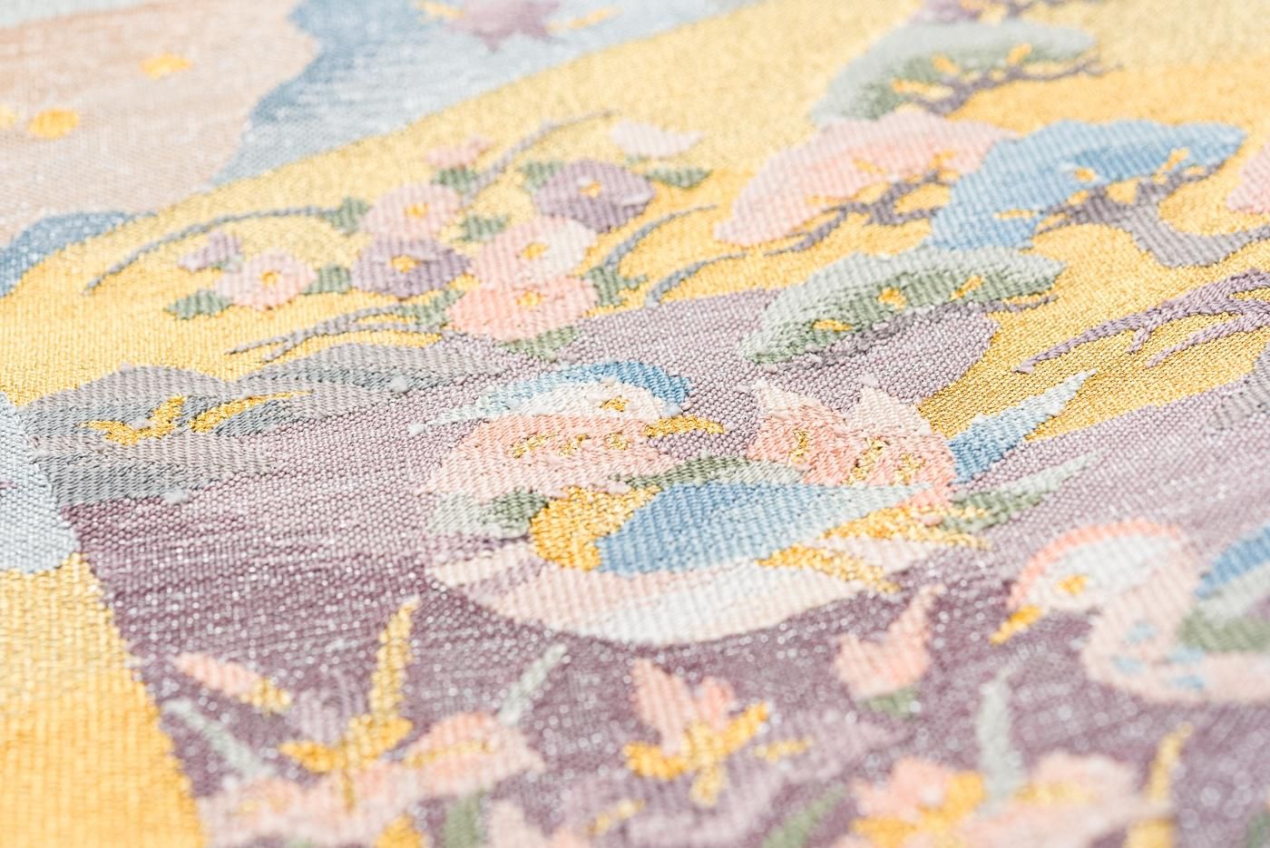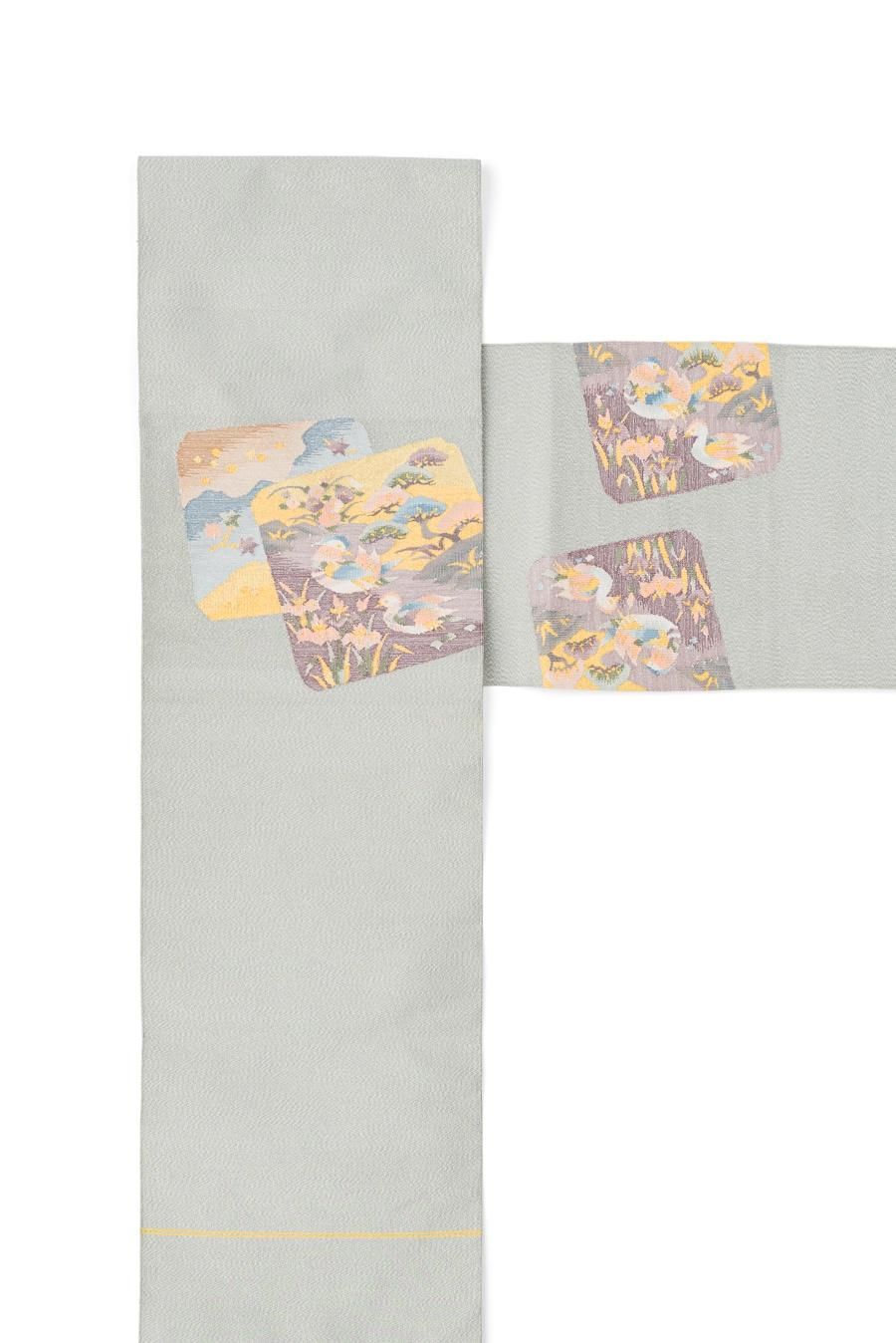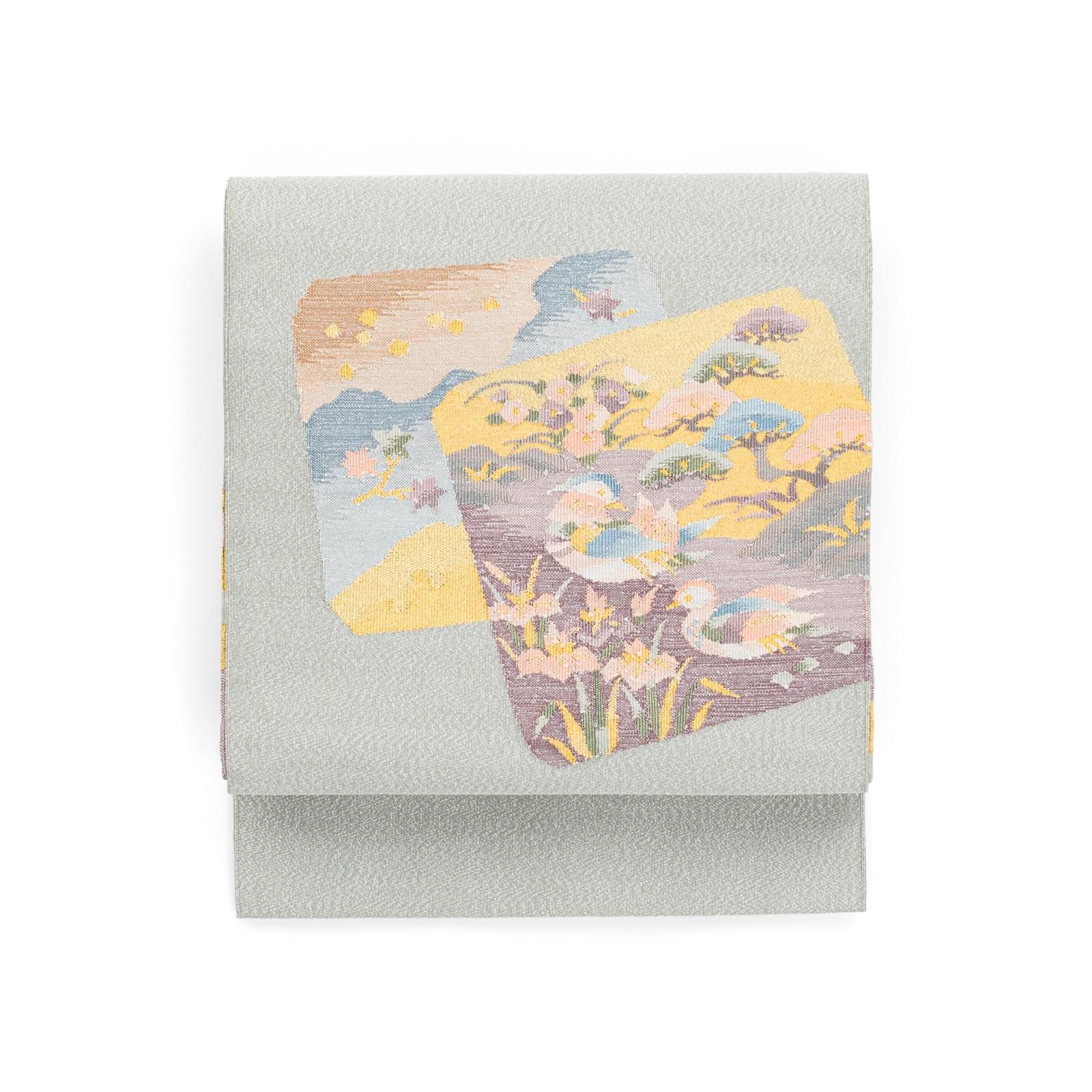 つがいの水鳥や四季の花などを閉じ込めた色紙模様が美しい本綴れの八寸名古屋帯です。