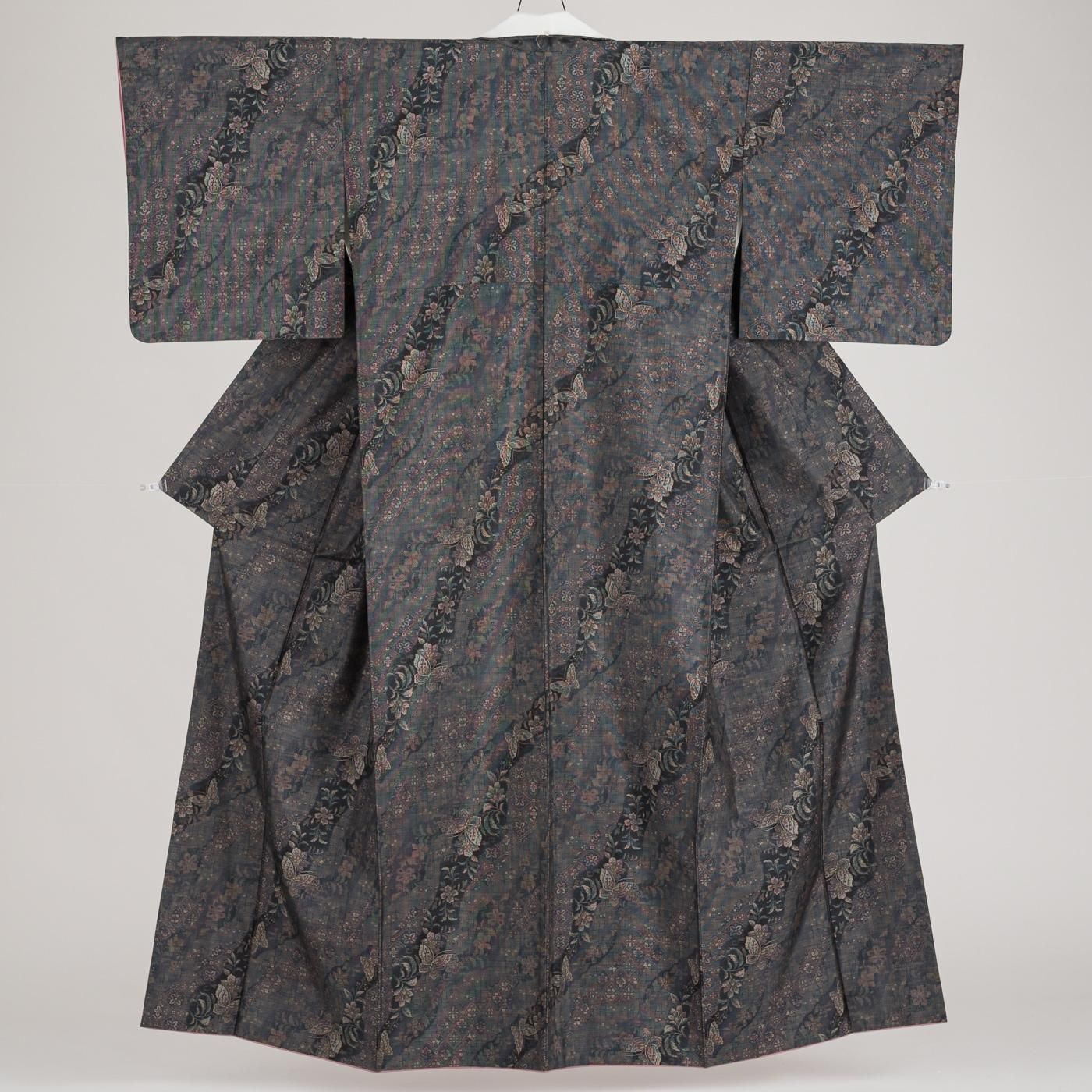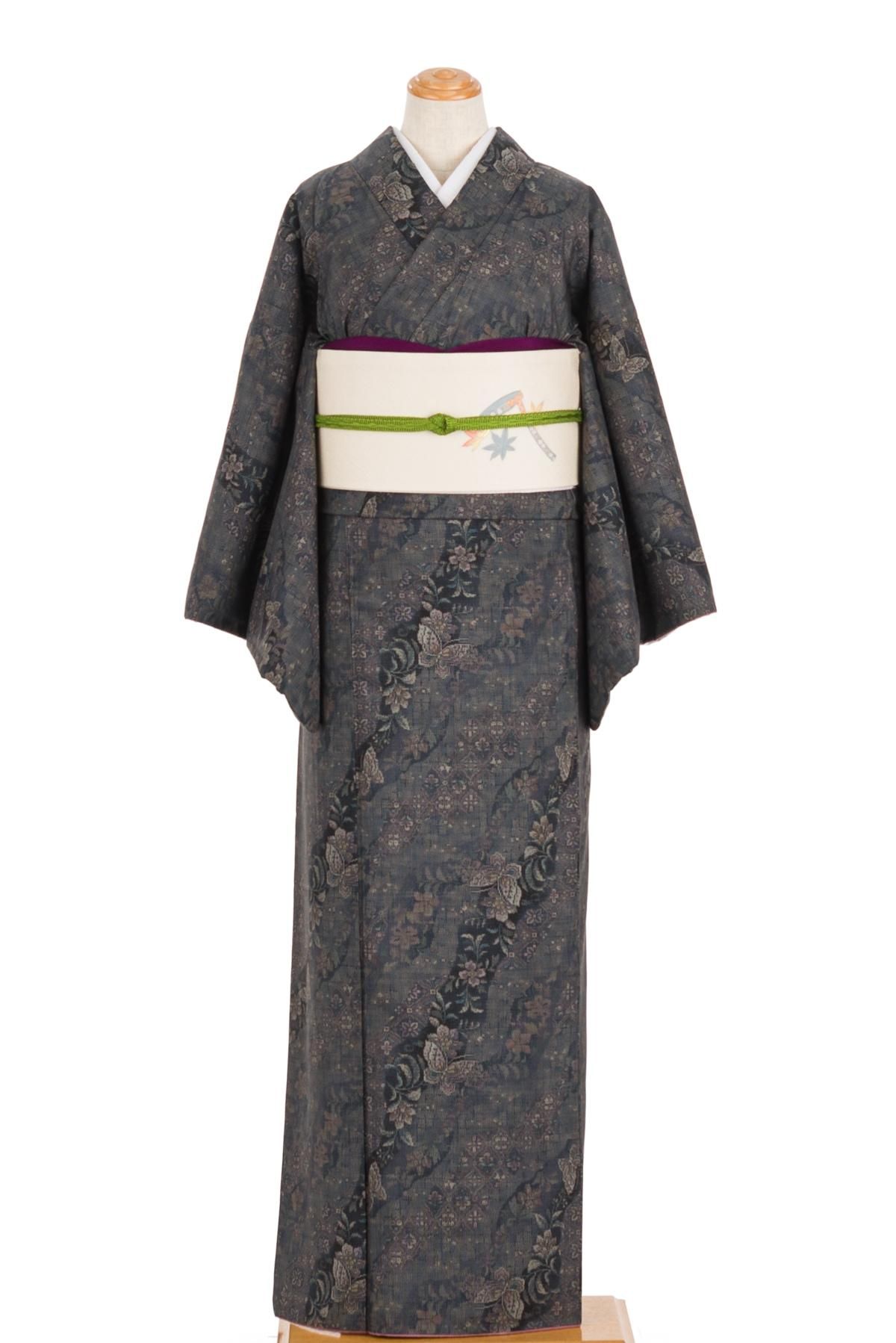道長取りに花や蝶などを添えた大島紬の着物です。