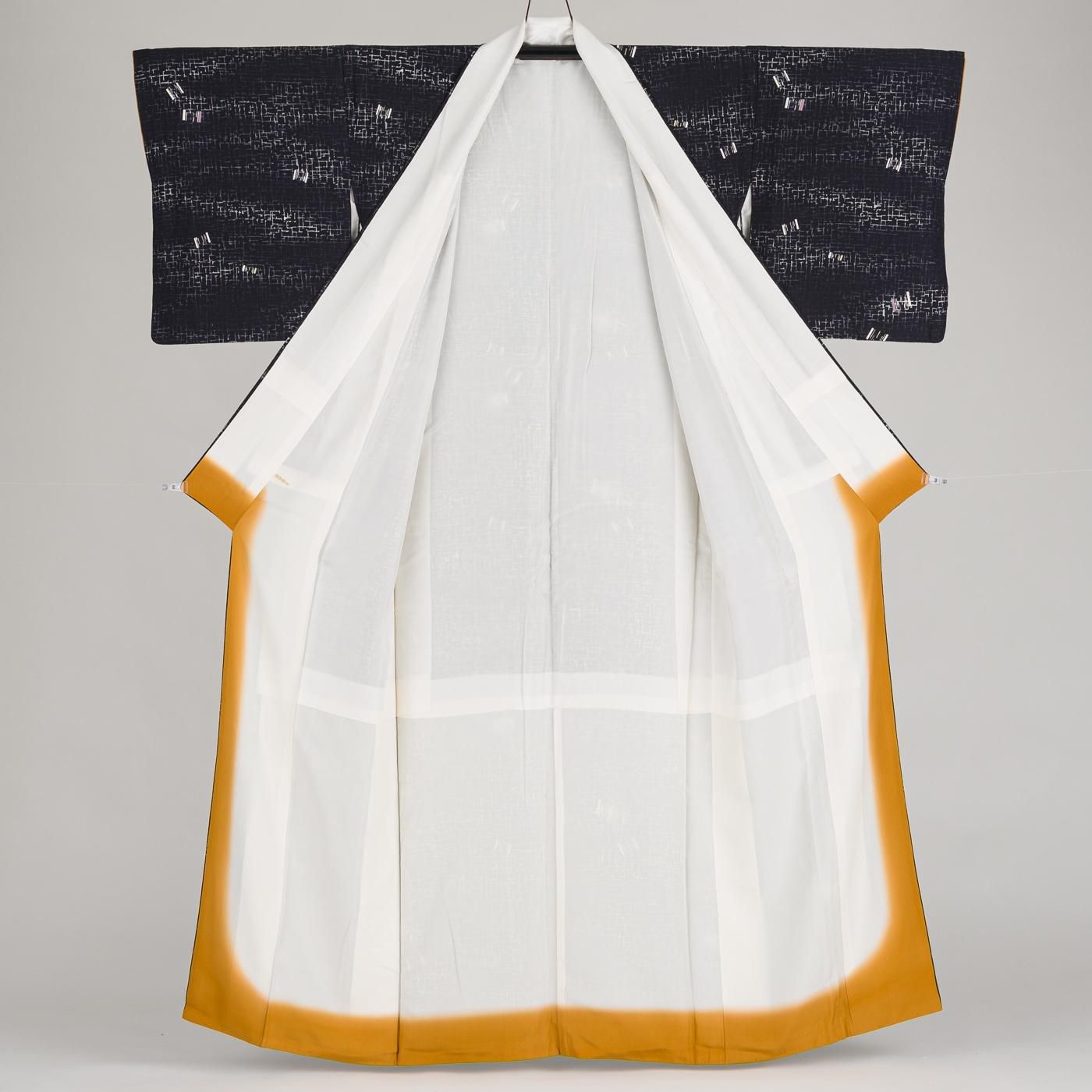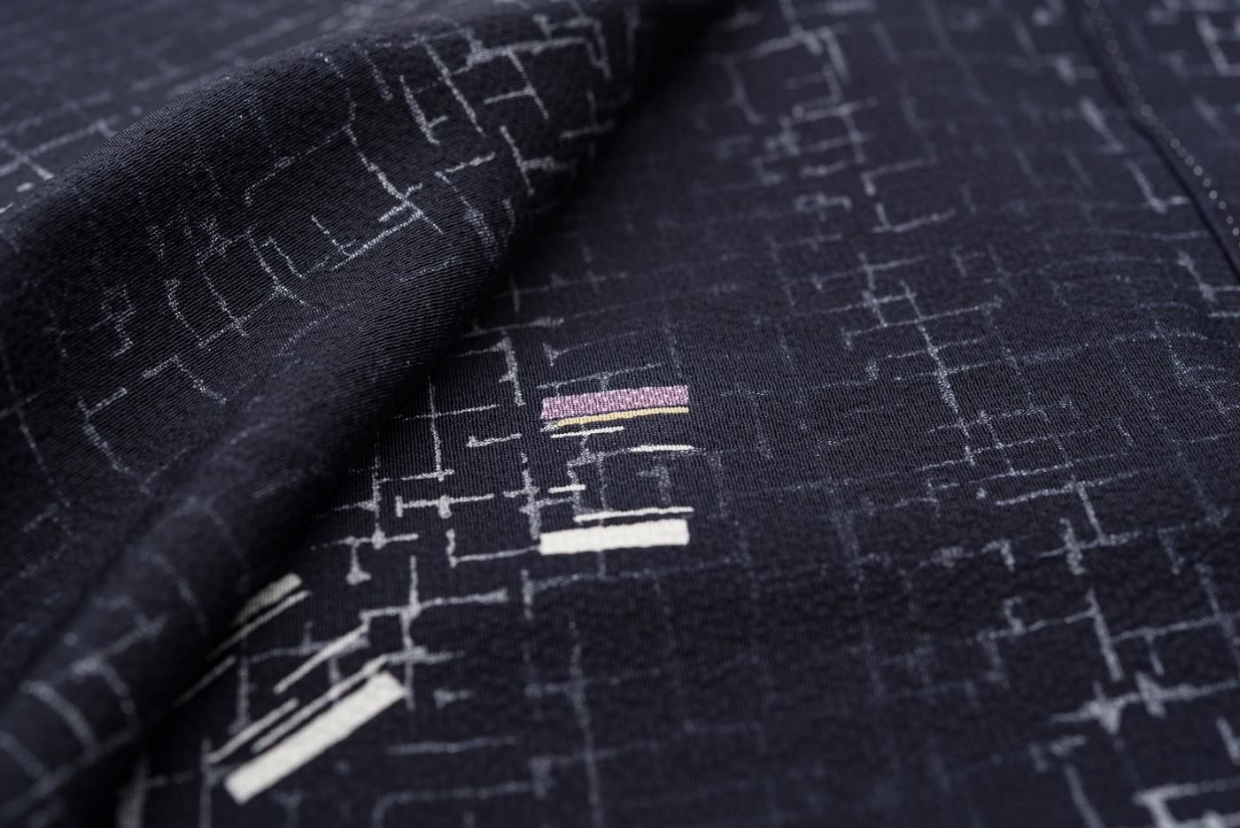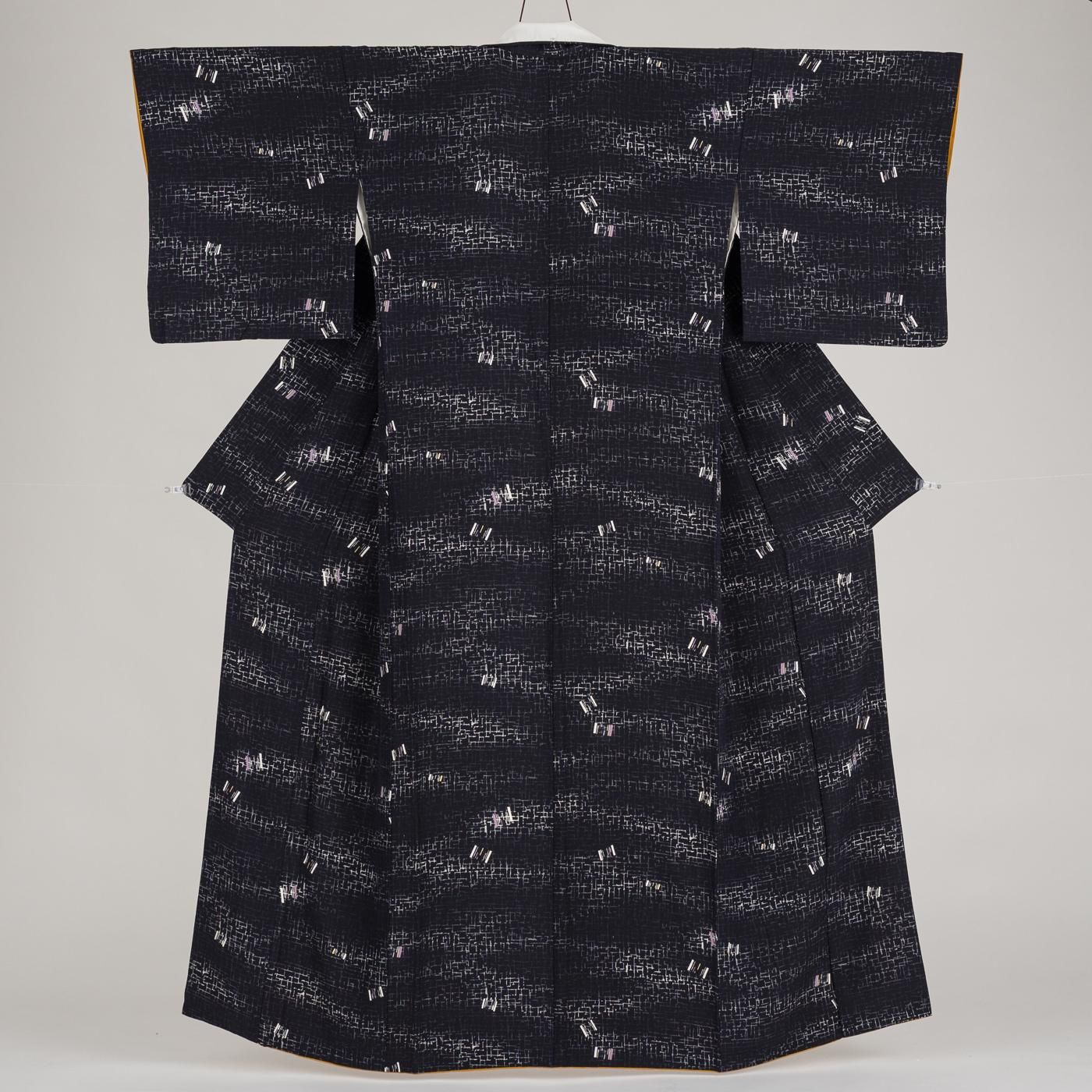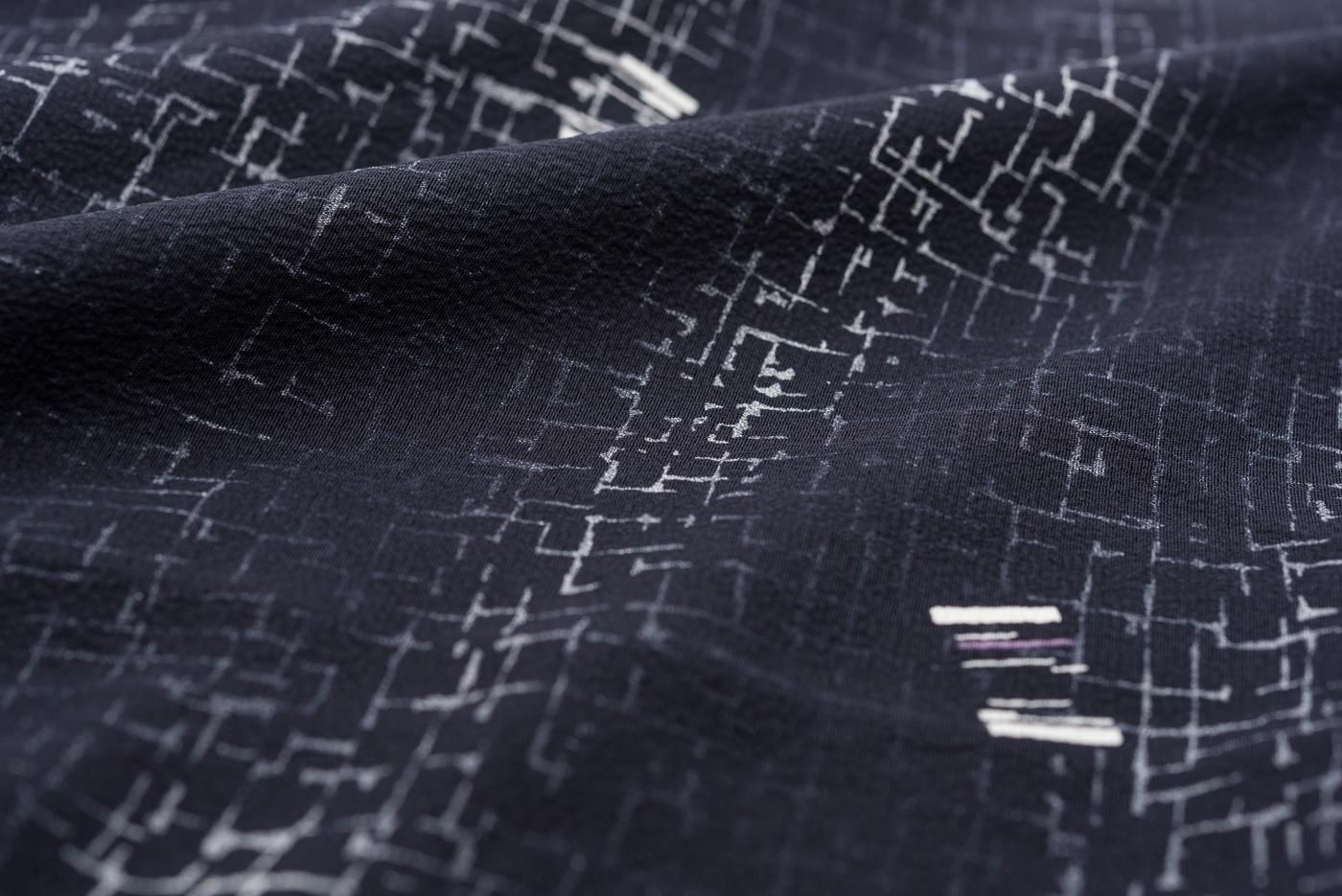 ほんのり藍がかった黒地に抽象模様を染めた小紋の着物です。
