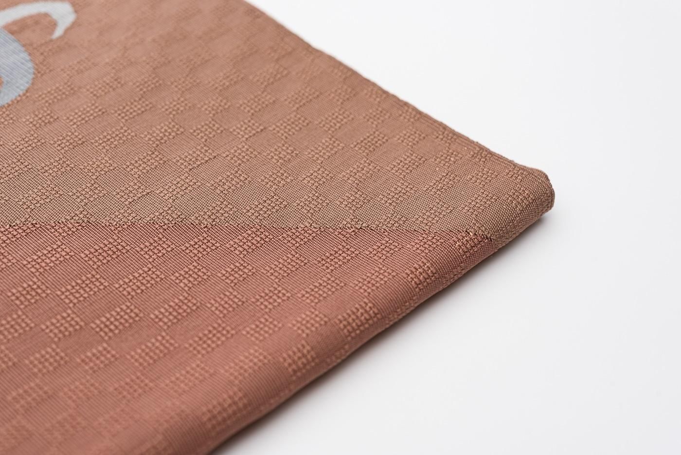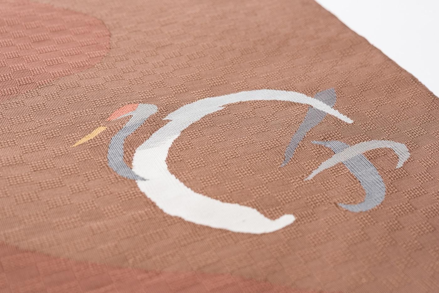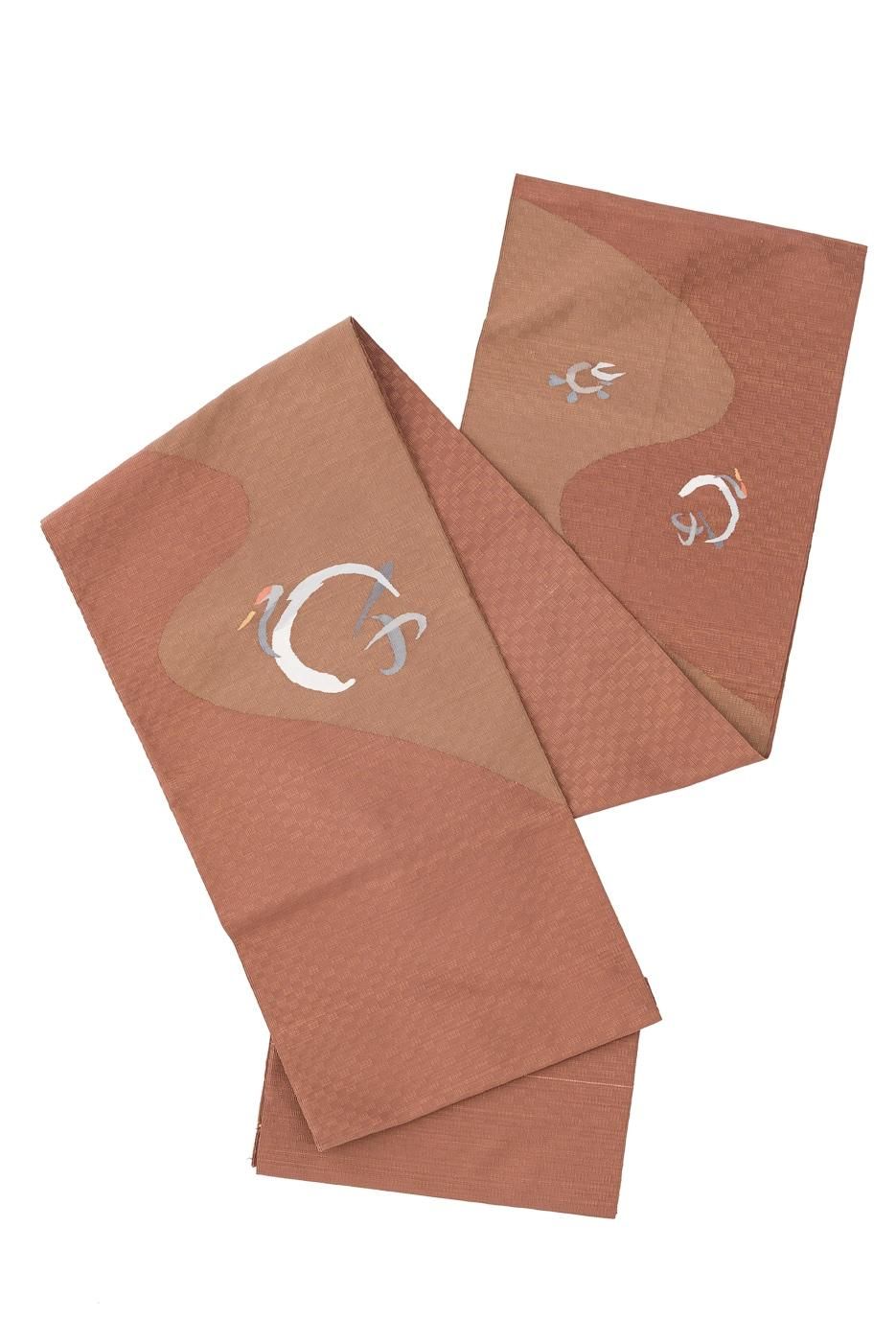 曲線で染め分けた赤茶の地に鶴の模様を織り出した八寸名古屋帯です。