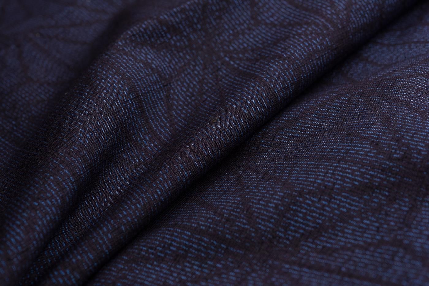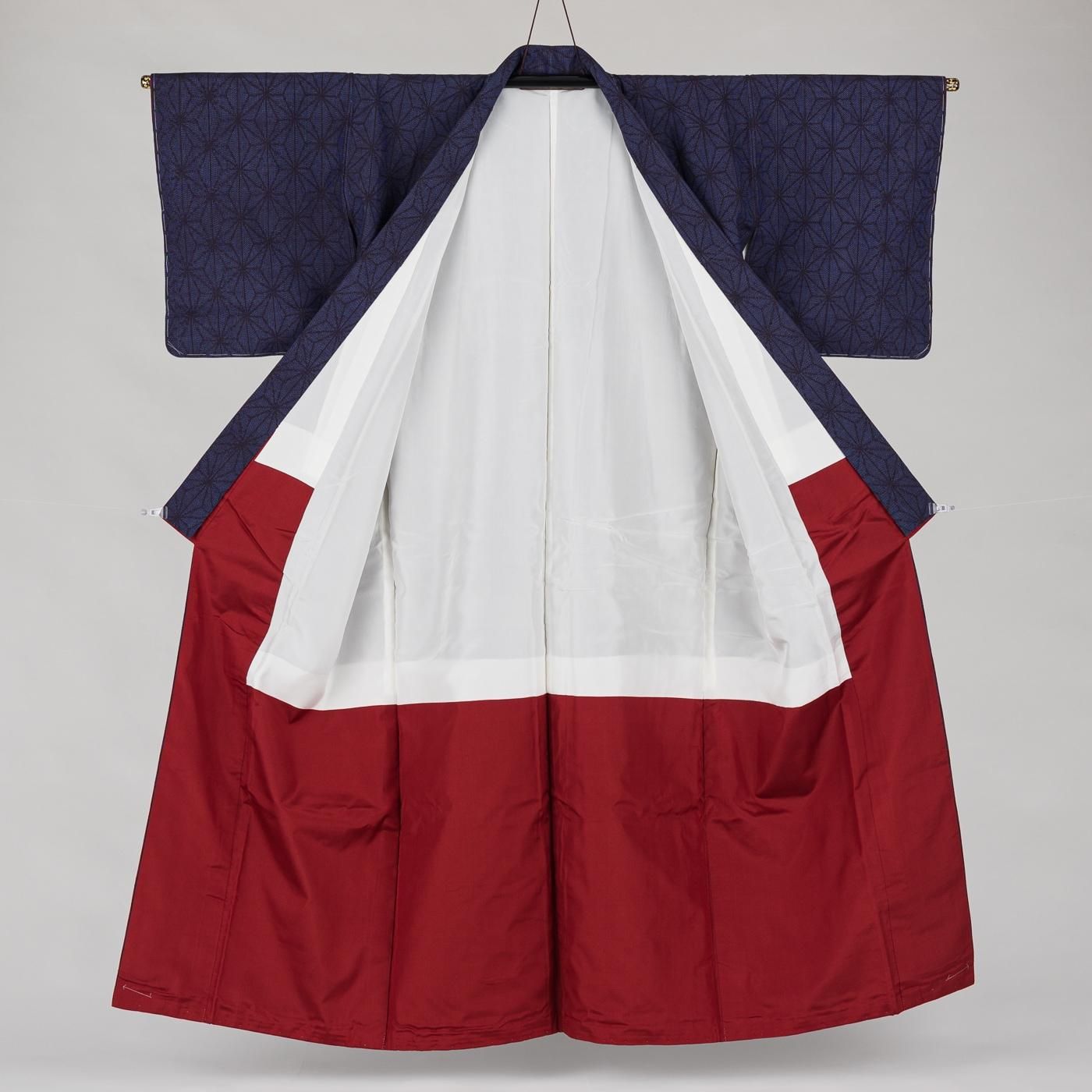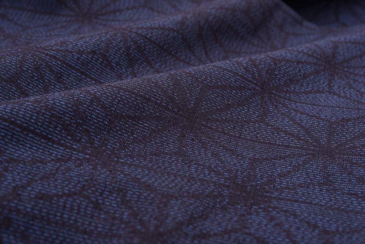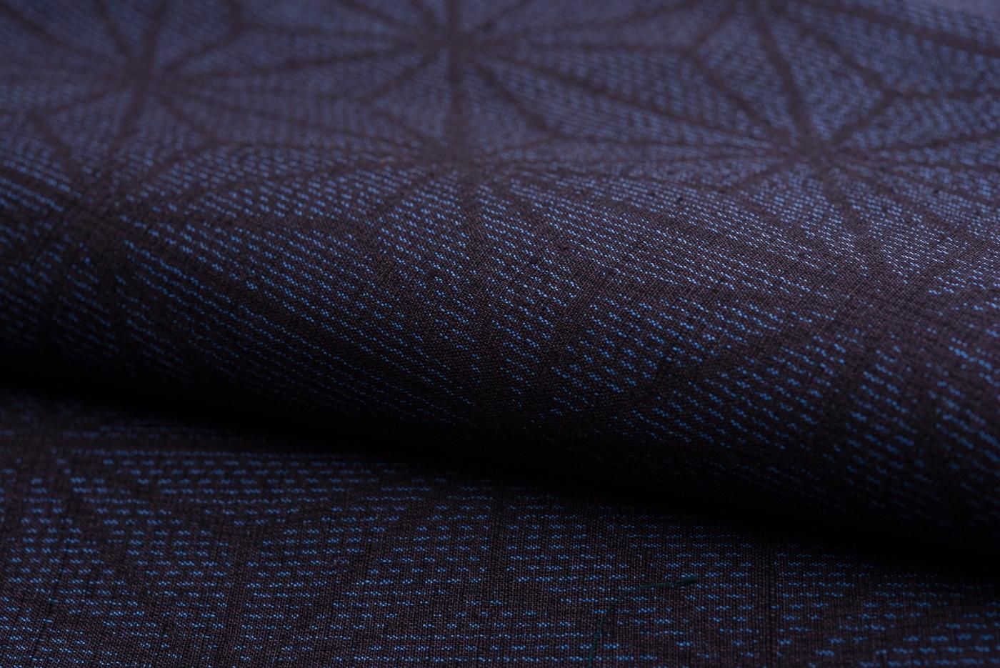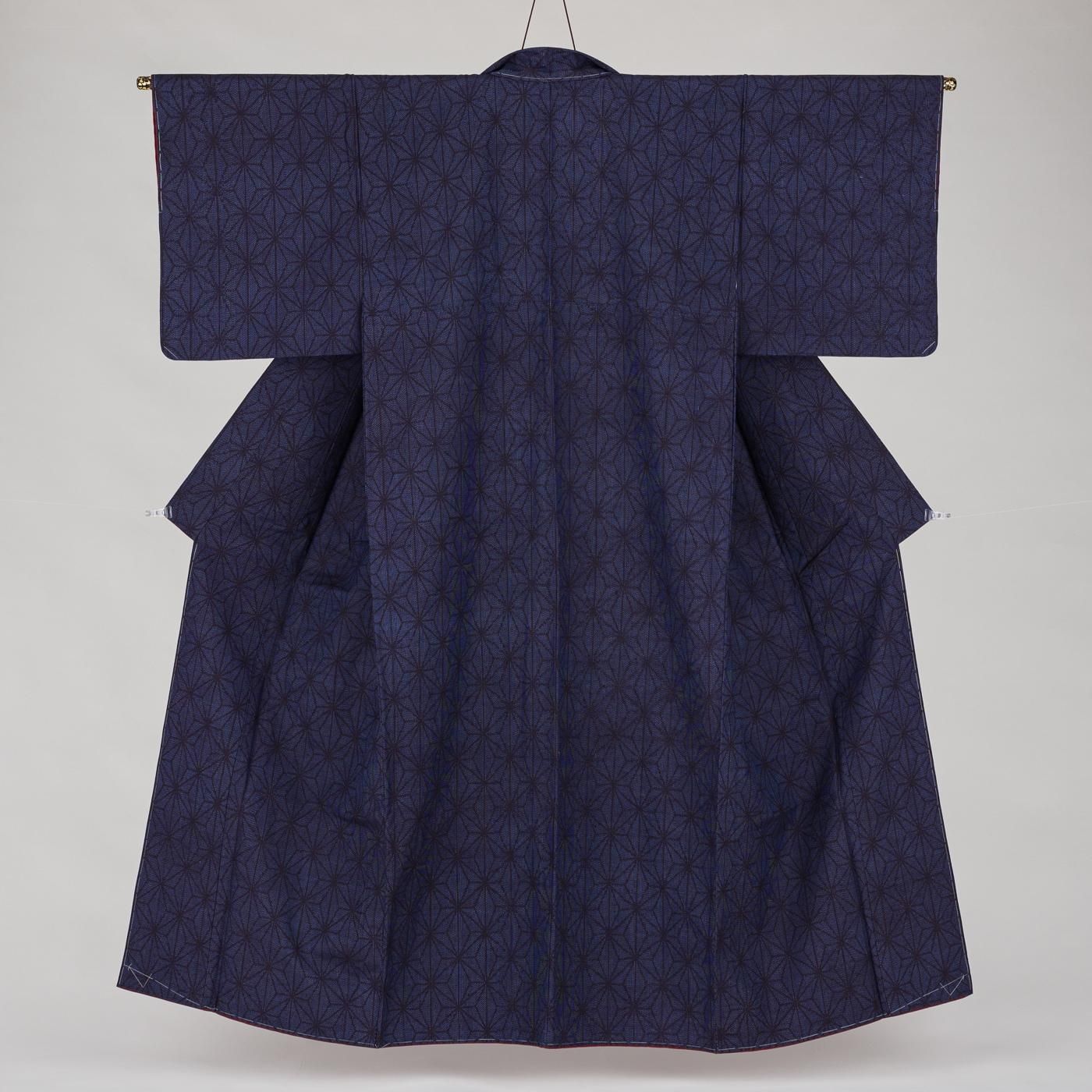 紺色の地に麻の葉模様を織り出した紬の着物です。