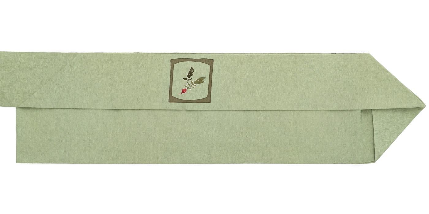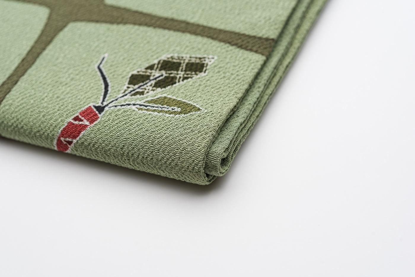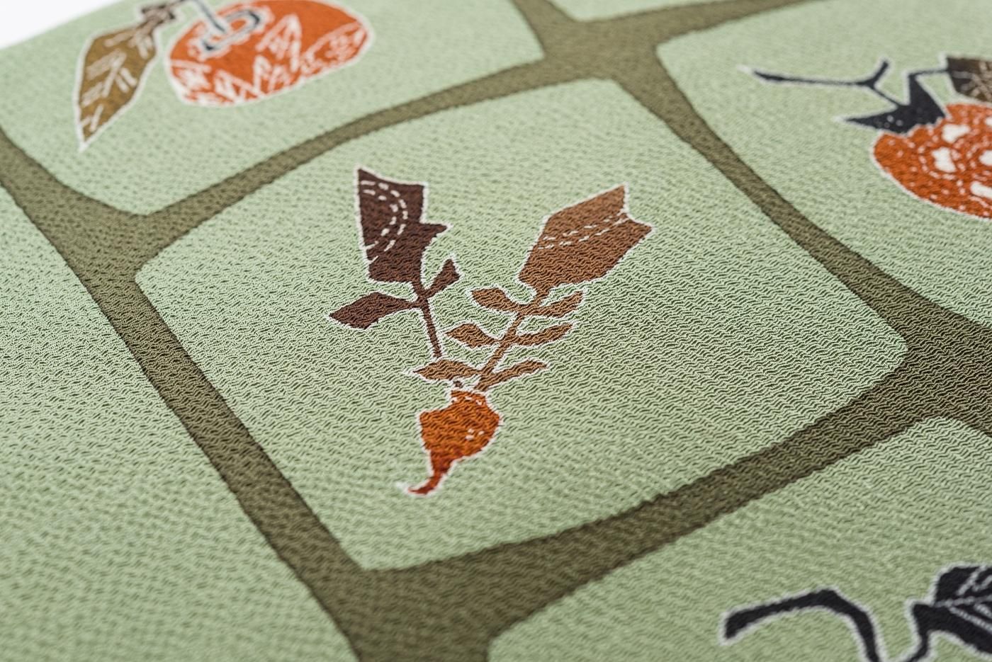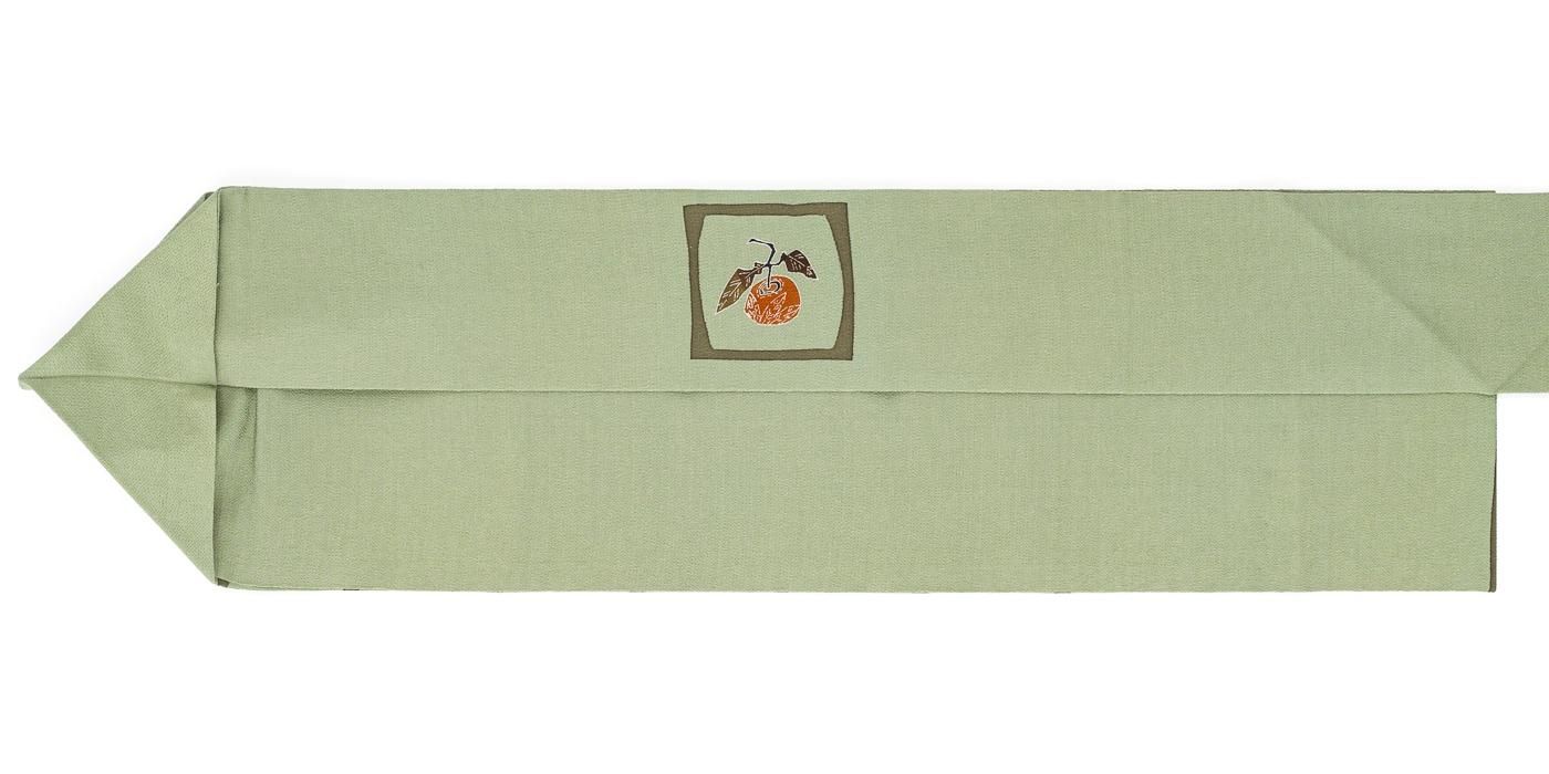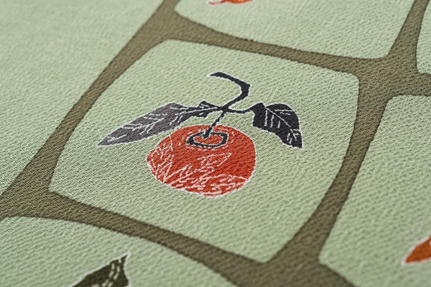 くすみ感のあるグリーンの縮緬地に人参、小カブ、柿、蜜柑などを染めた九寸名古屋帯です。