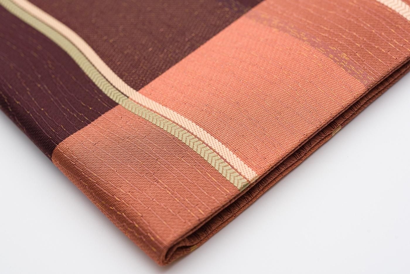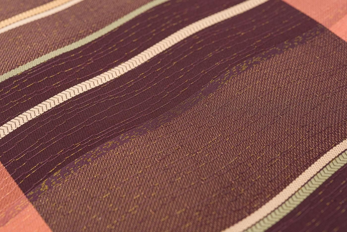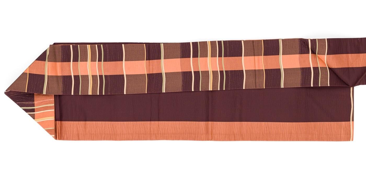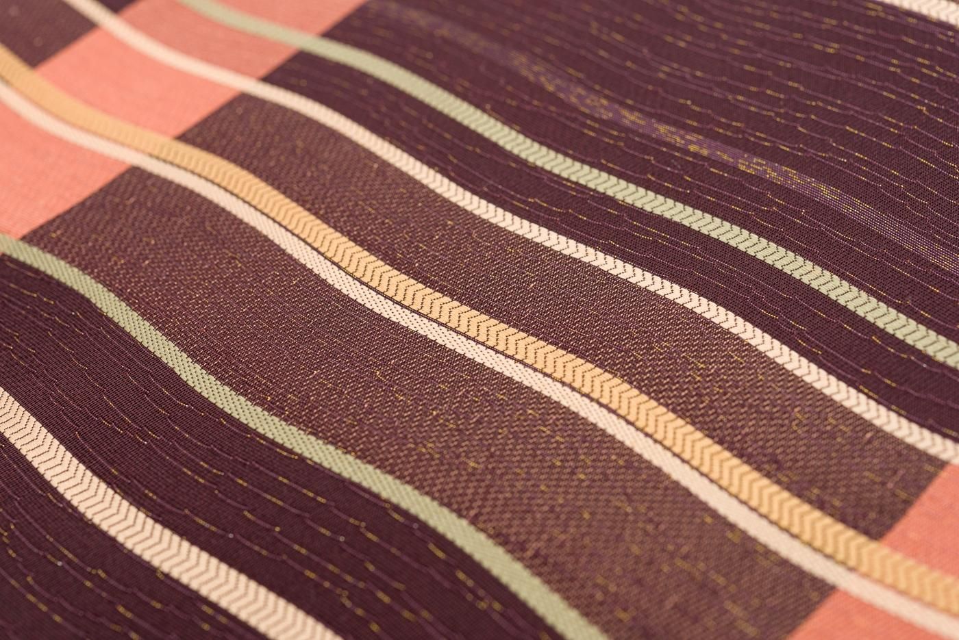 オレンジや茶の格子にゆらゆら揺れる曲線を重ねた九寸名古屋帯です。