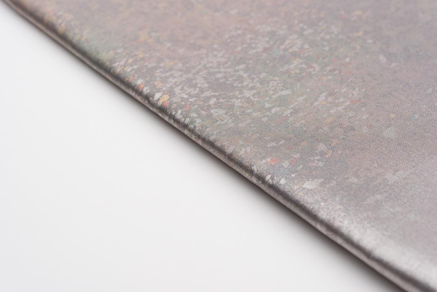 銀色の地に銀河のような抽象柄が広がる袋帯です。