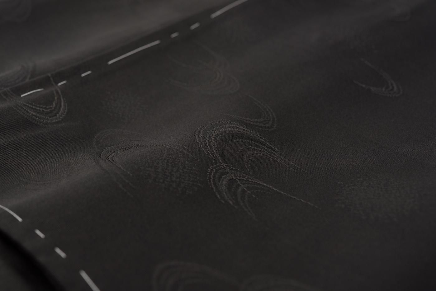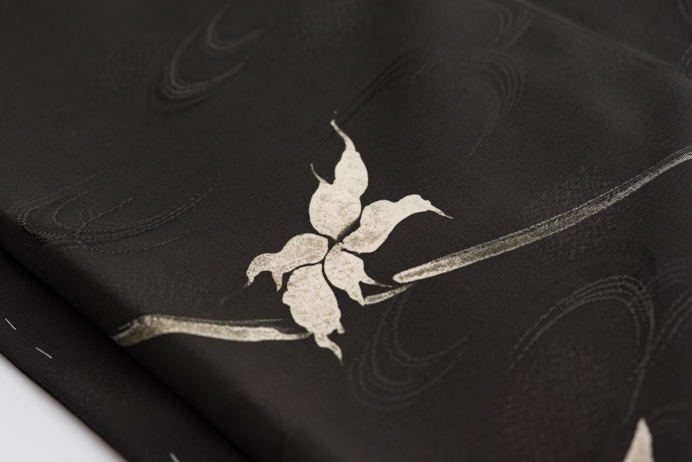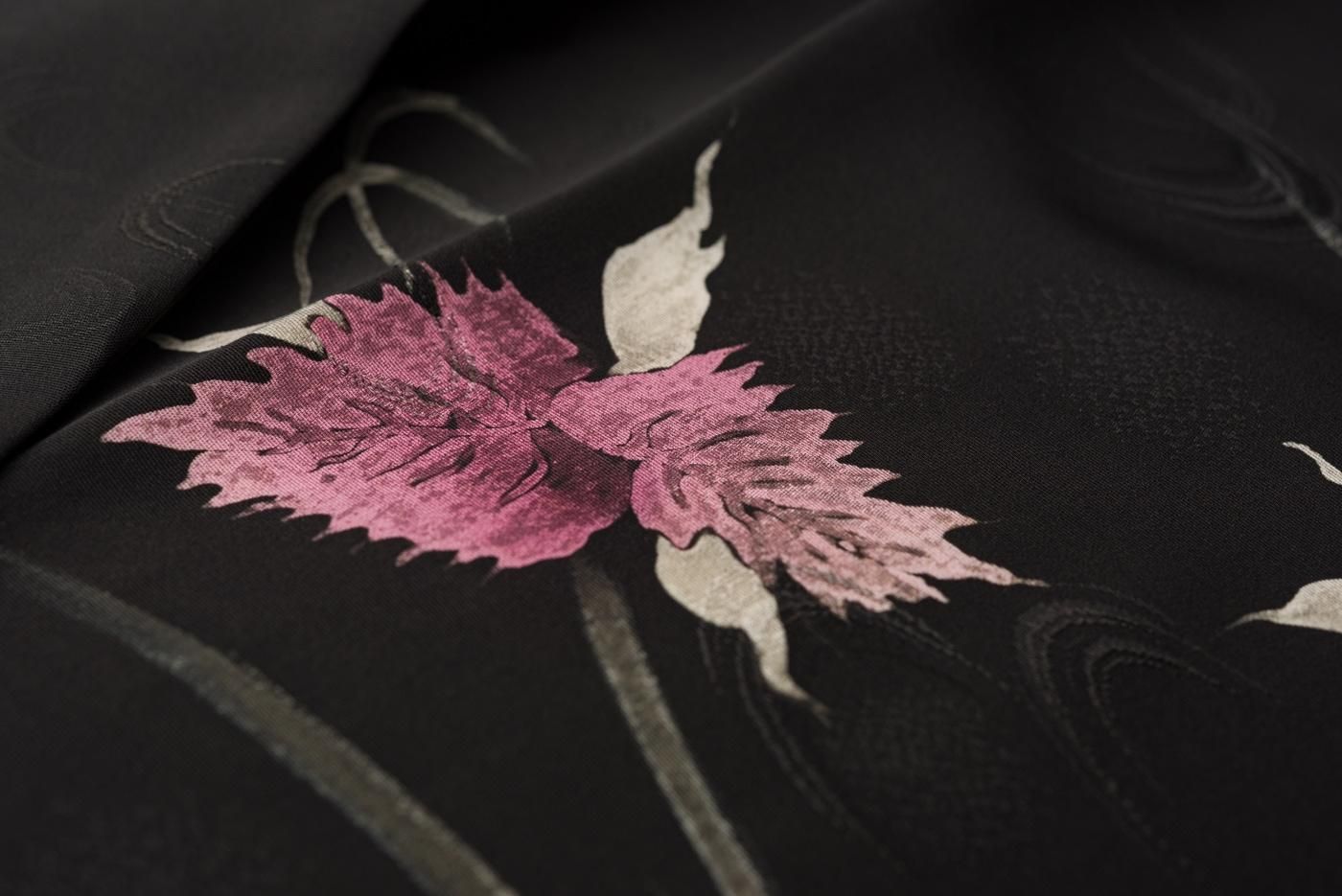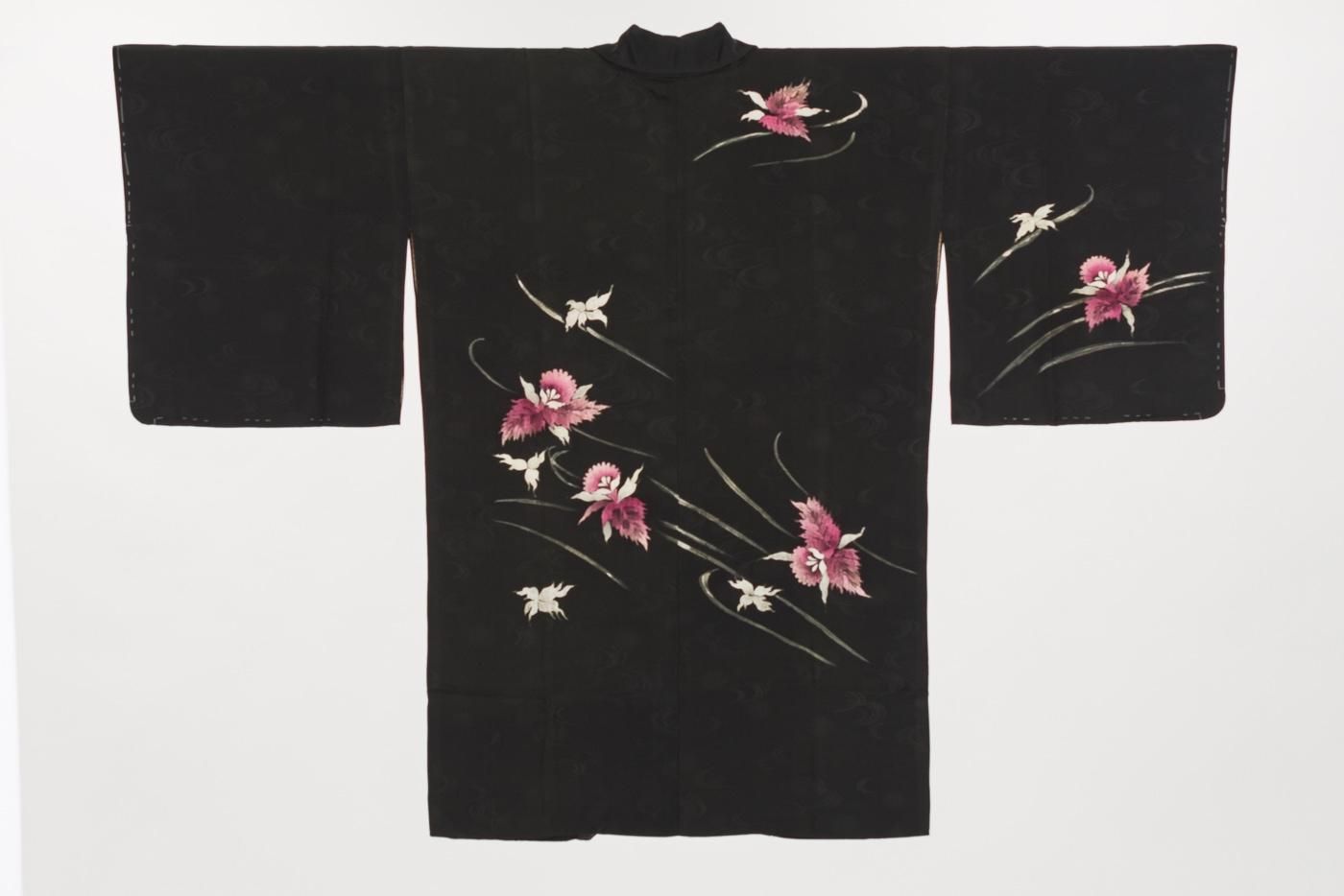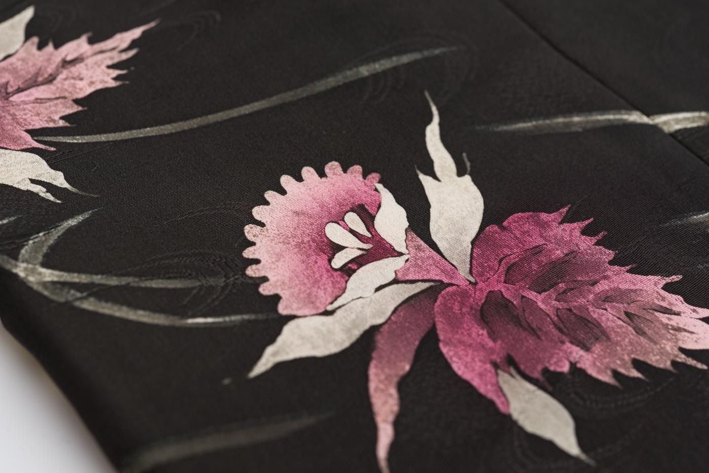 黒色の地に赤紫のカトレアを描いた道中着です。