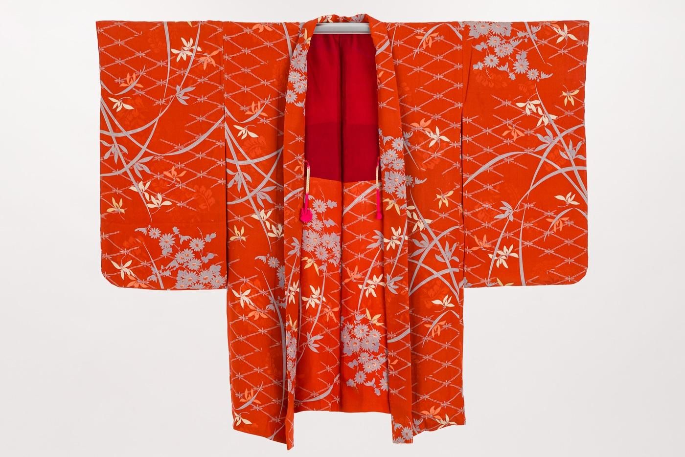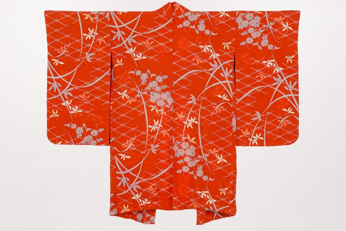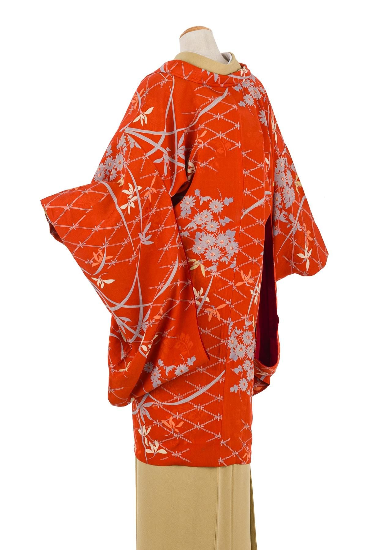 朱色の地に蘭と菊を染めたアンティークの長羽織です。