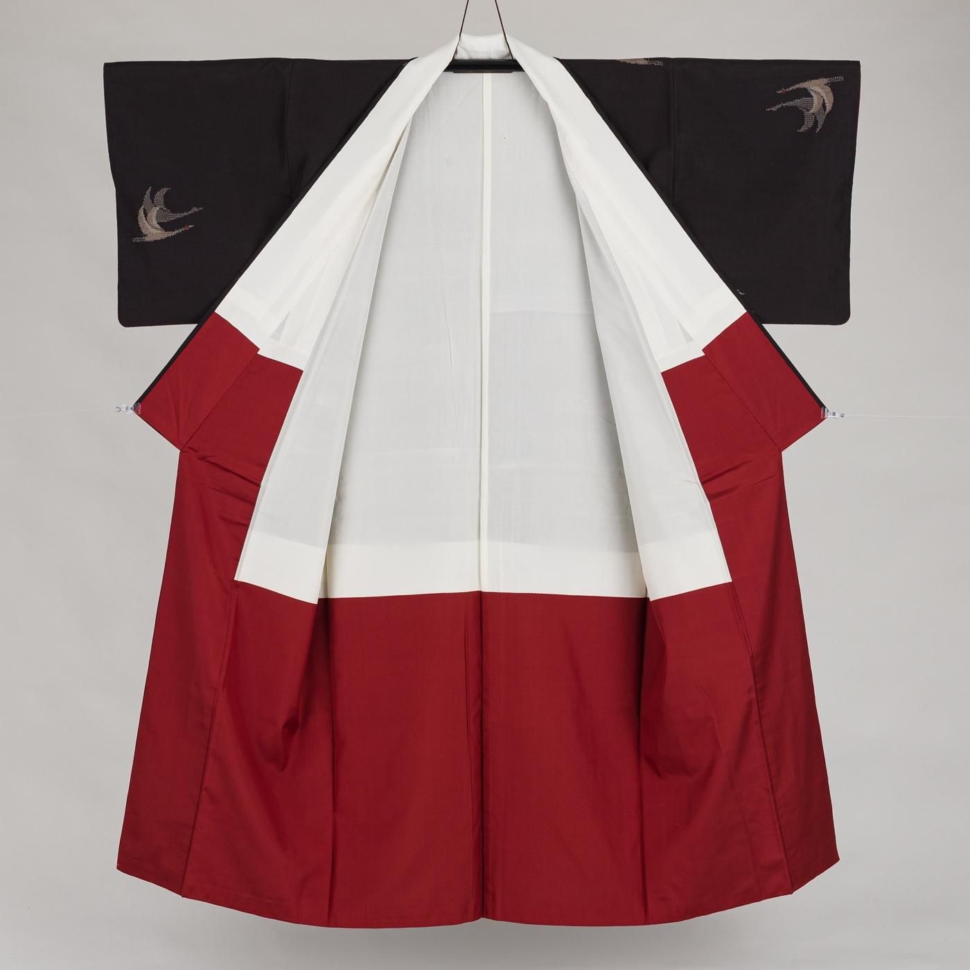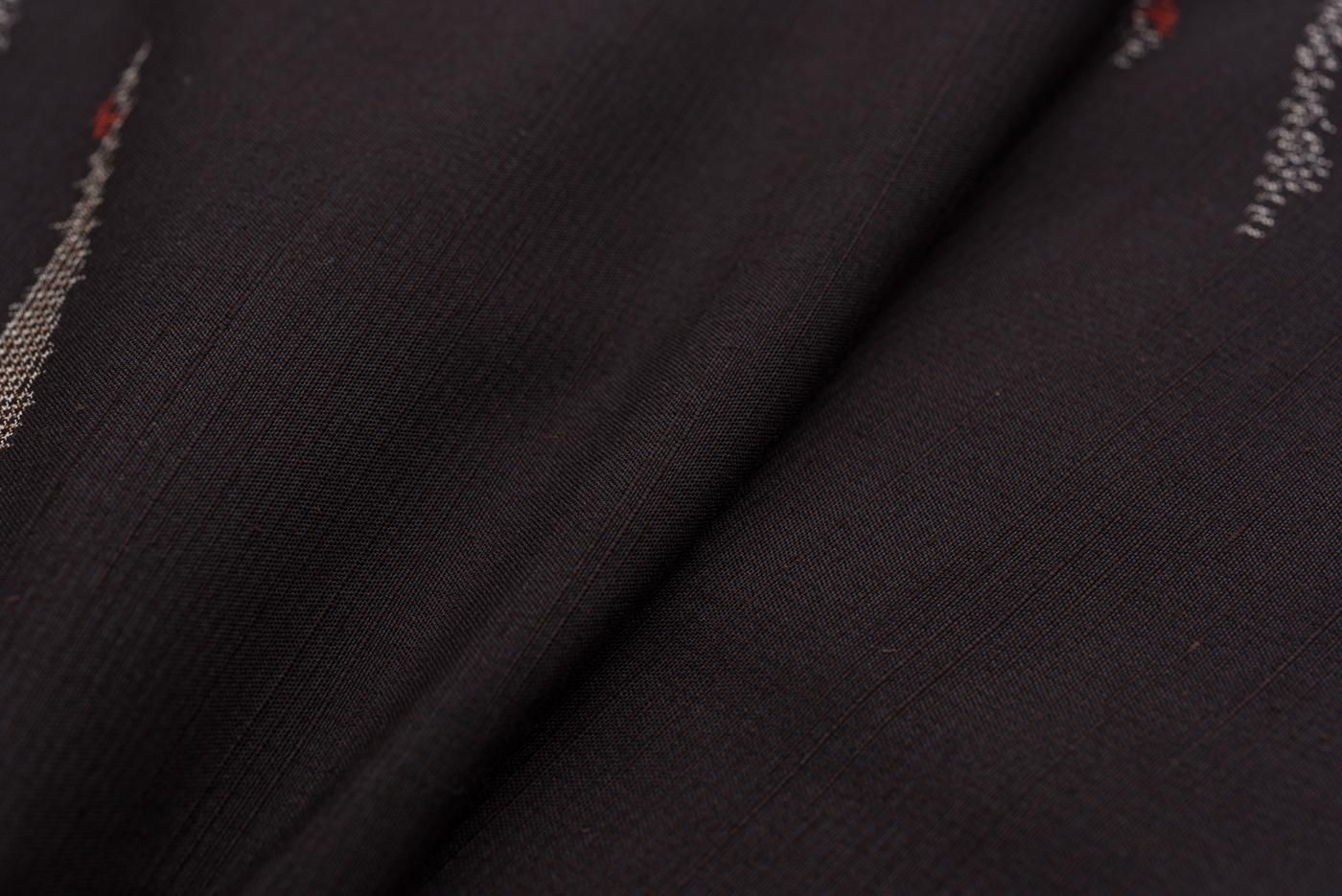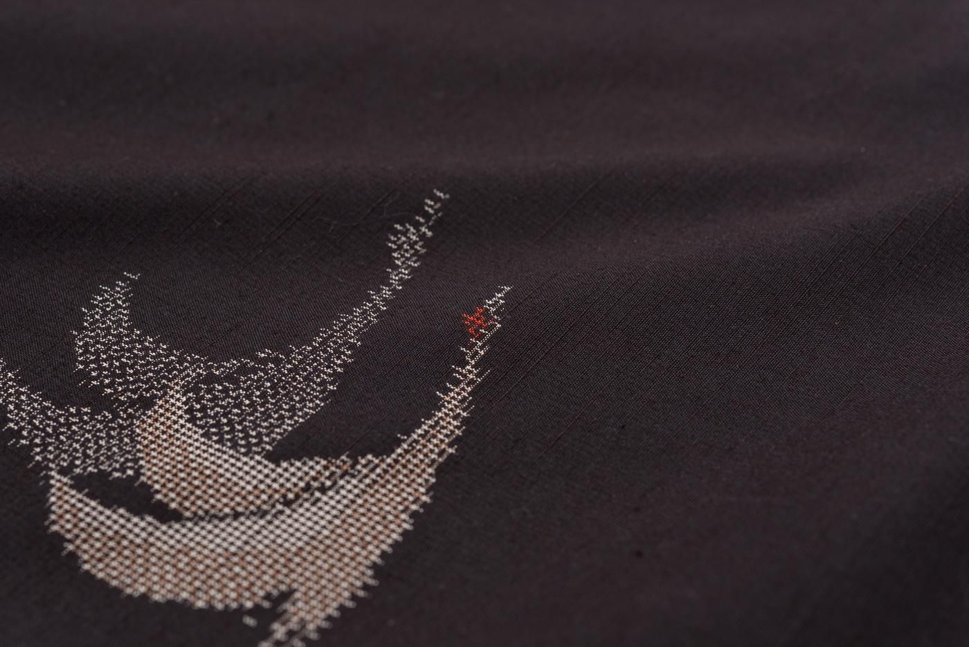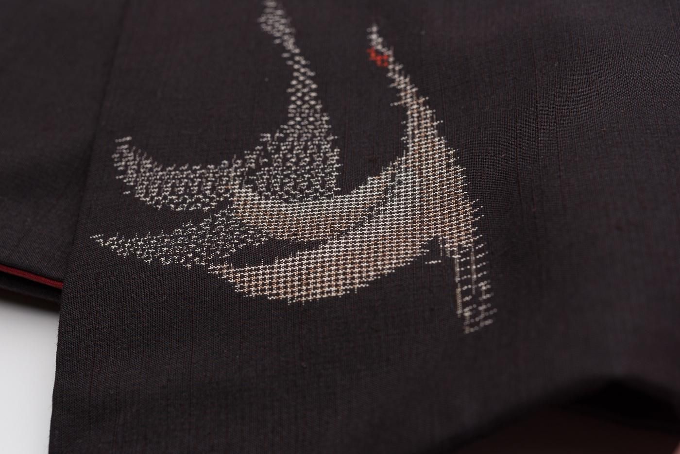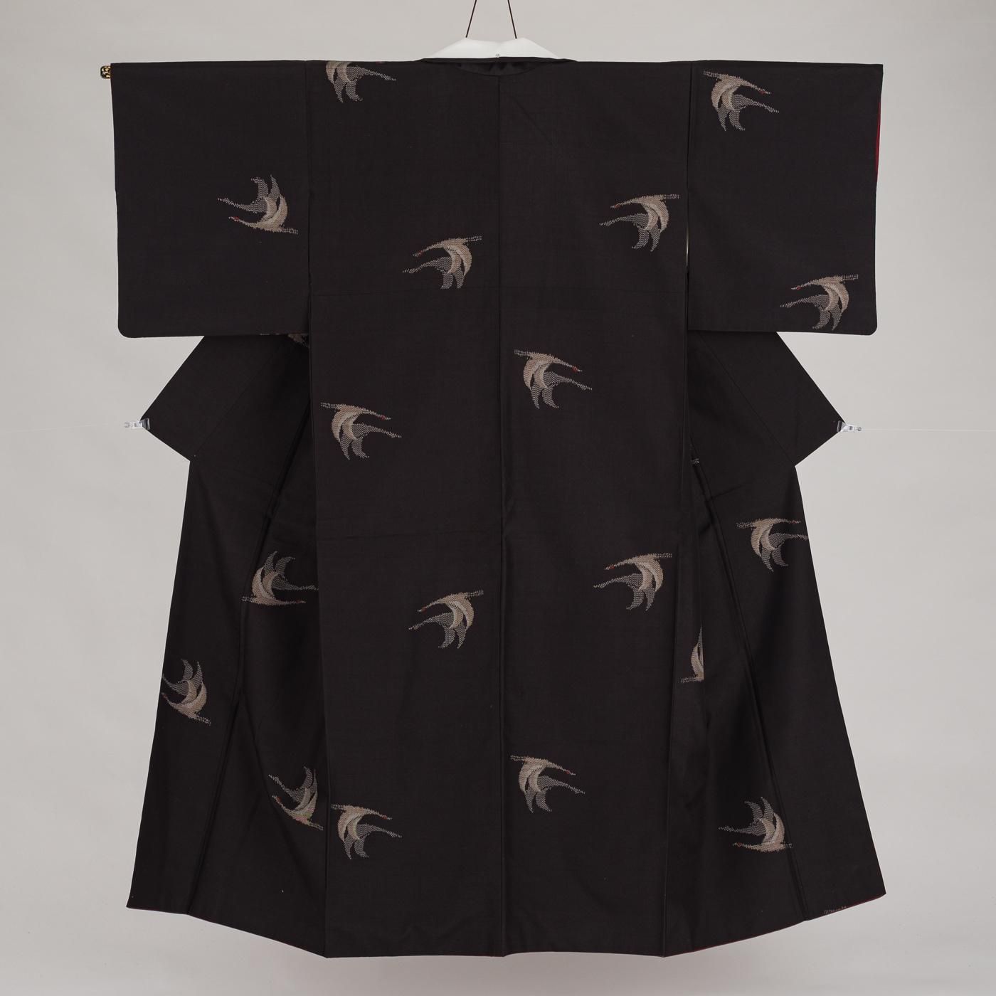 やや茶がかった黒地に鶴の姿を織り出した紬の着物です。