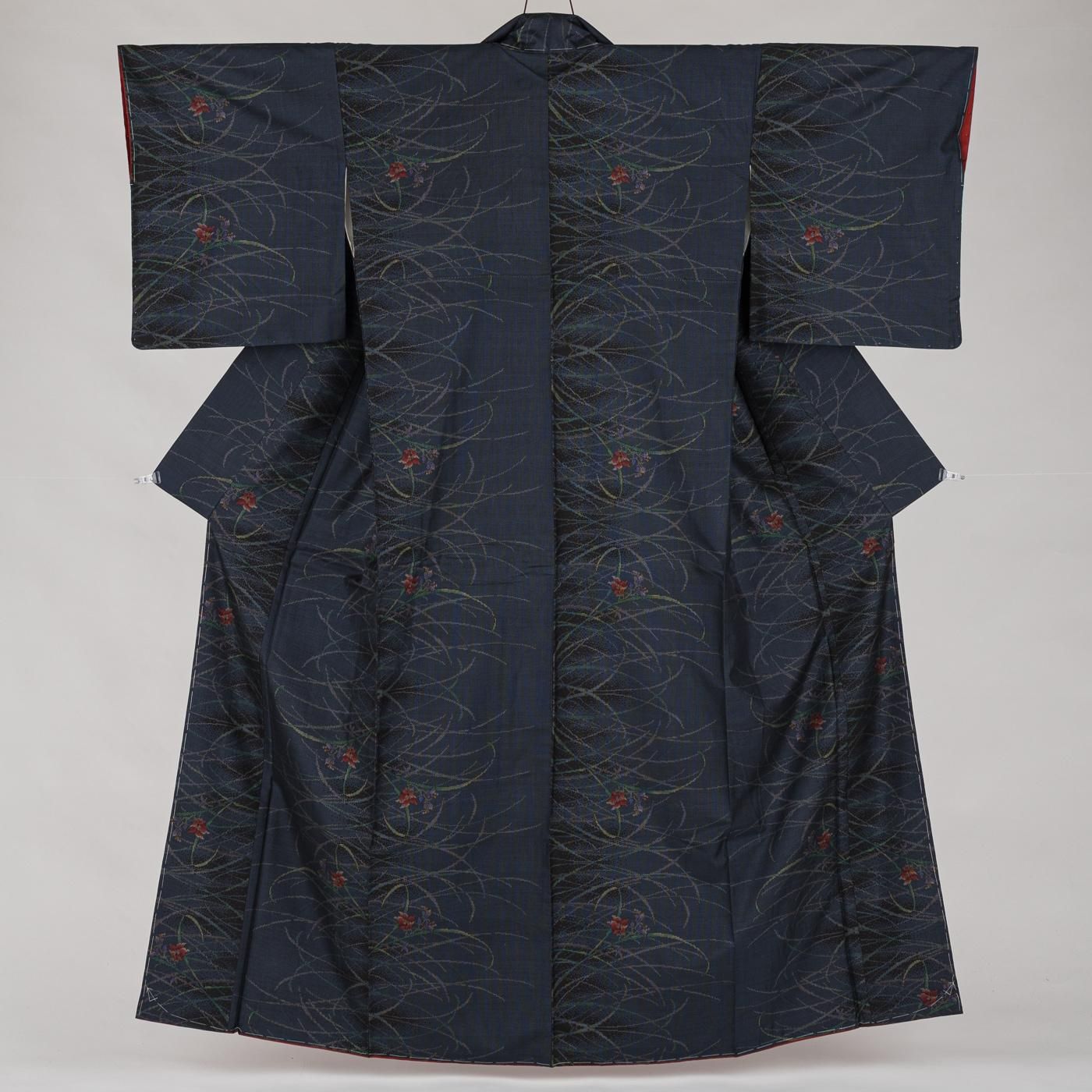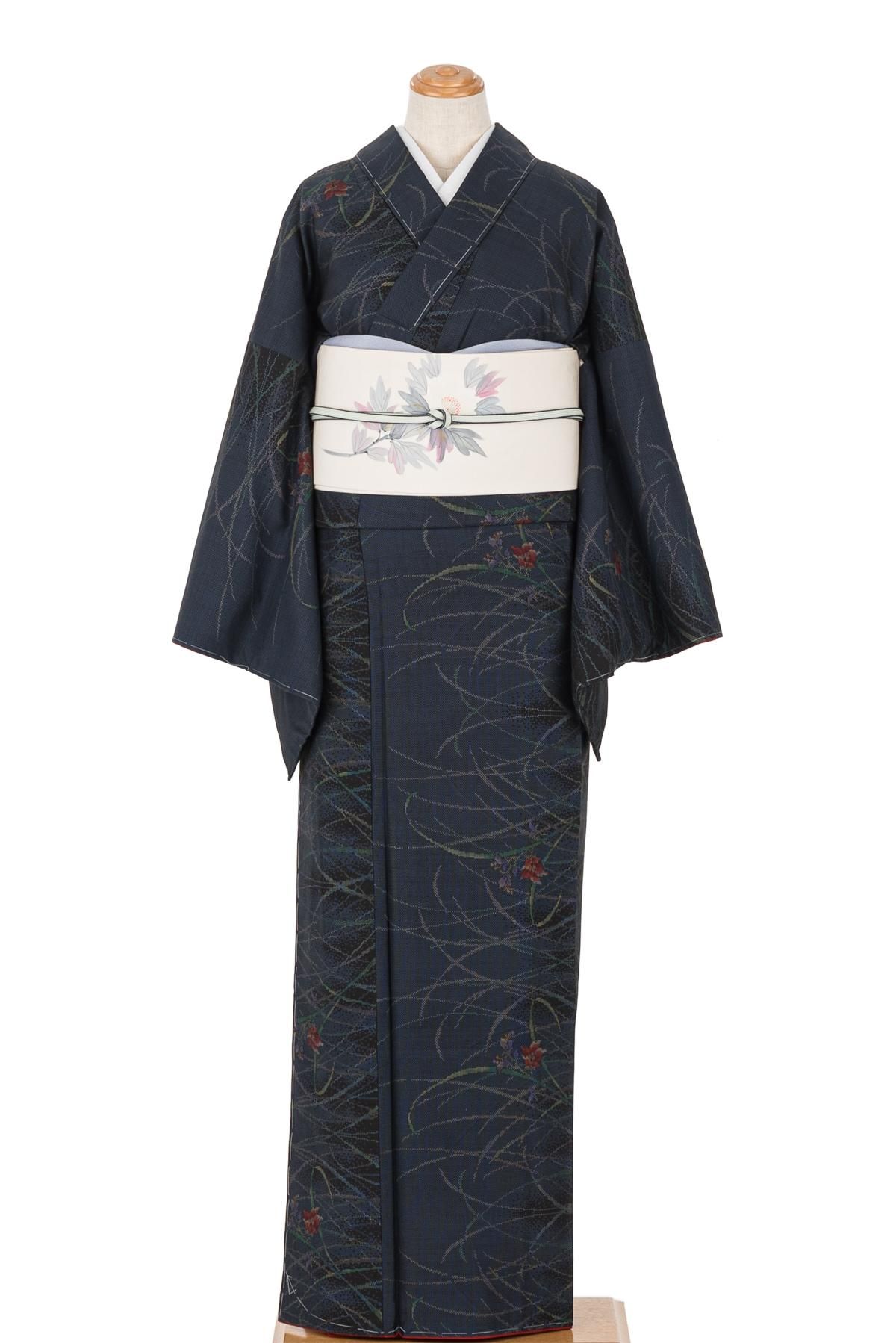 落ち着いた紺色の地に草花模様を織り出した大島紬の着物です。