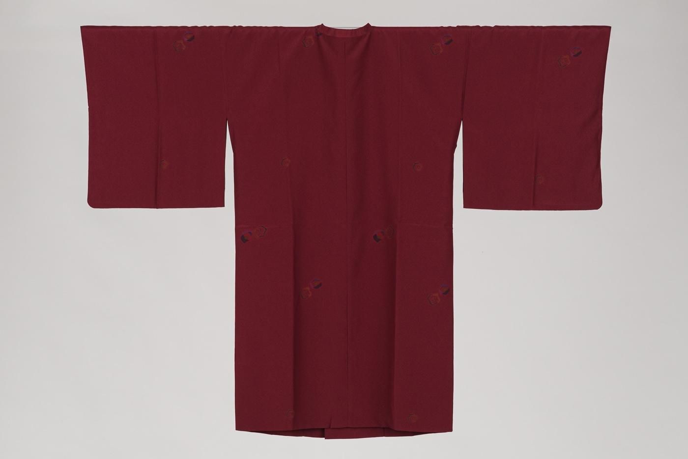 蘇芳色の地に飛び柄で小花を染めたロング丈の道行コートです。