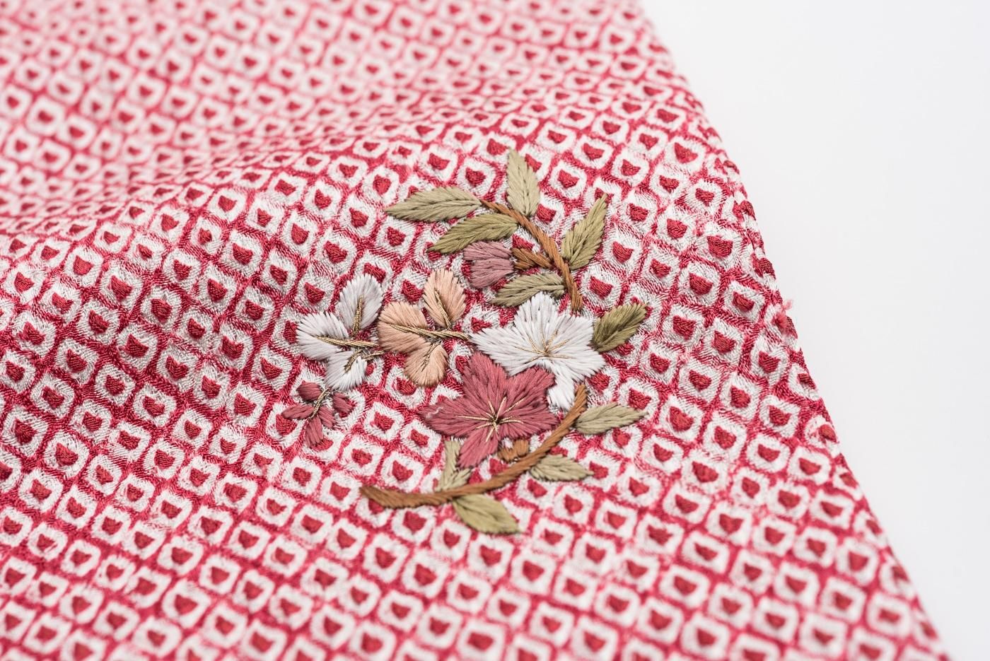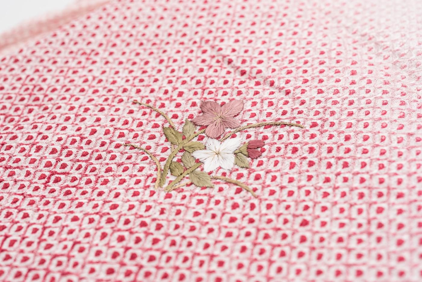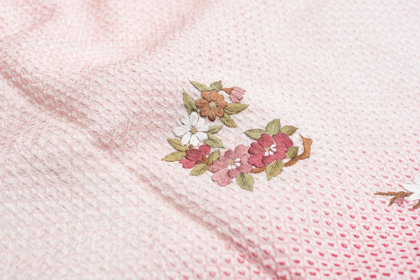 淡いピンクから赤へとグラデーションする地に小花をそっと刺繍した可憐なデザインです。