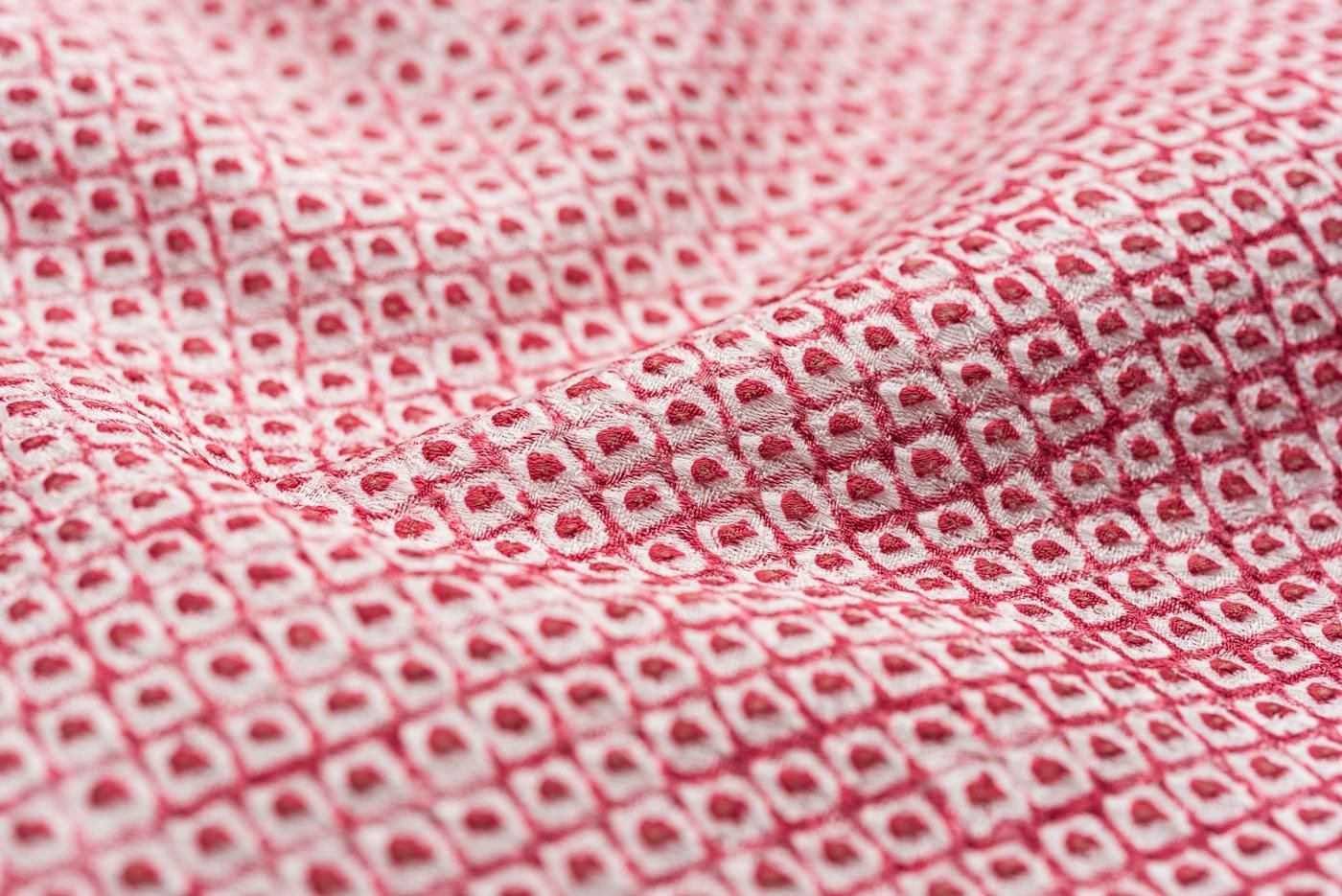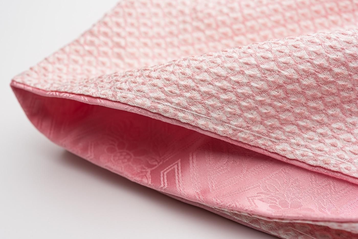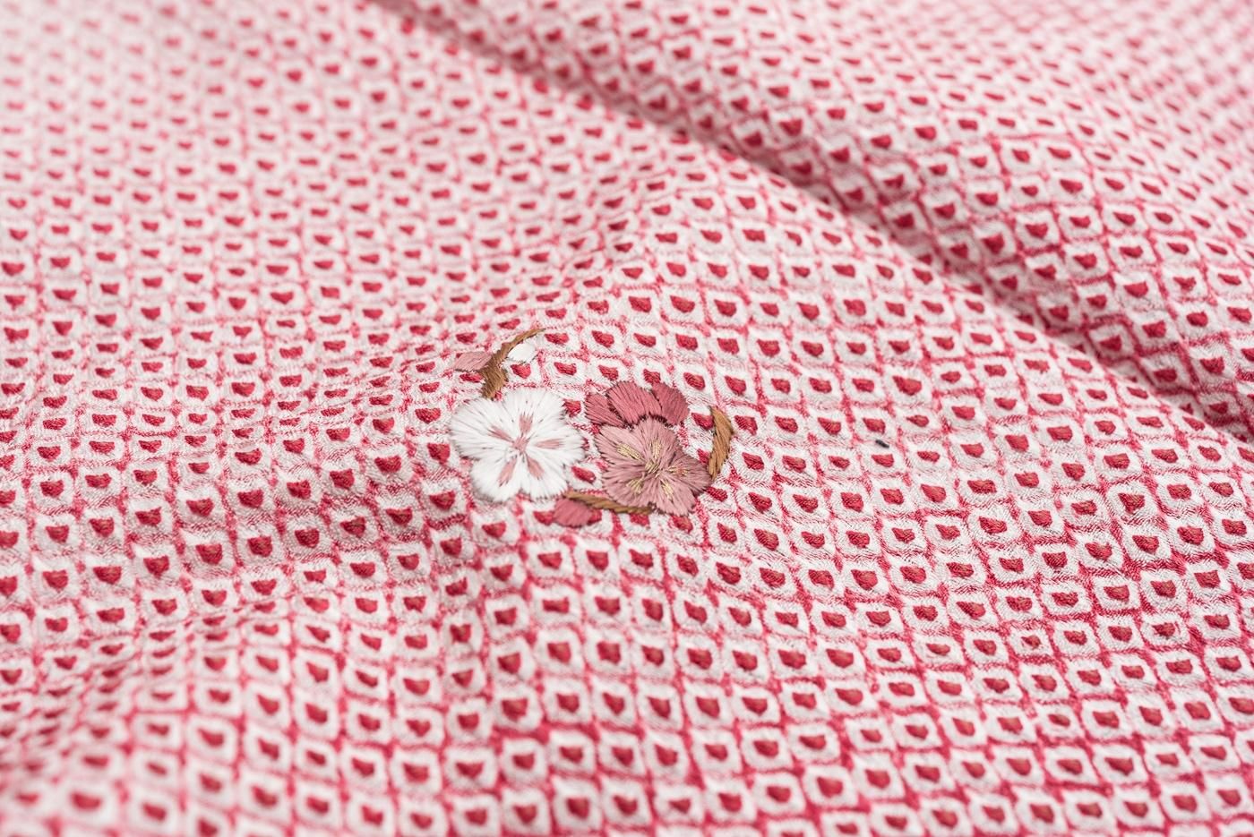 淡いピンクから赤へとグラデーションする地に小花をそっと刺繍した可憐なデザインです。