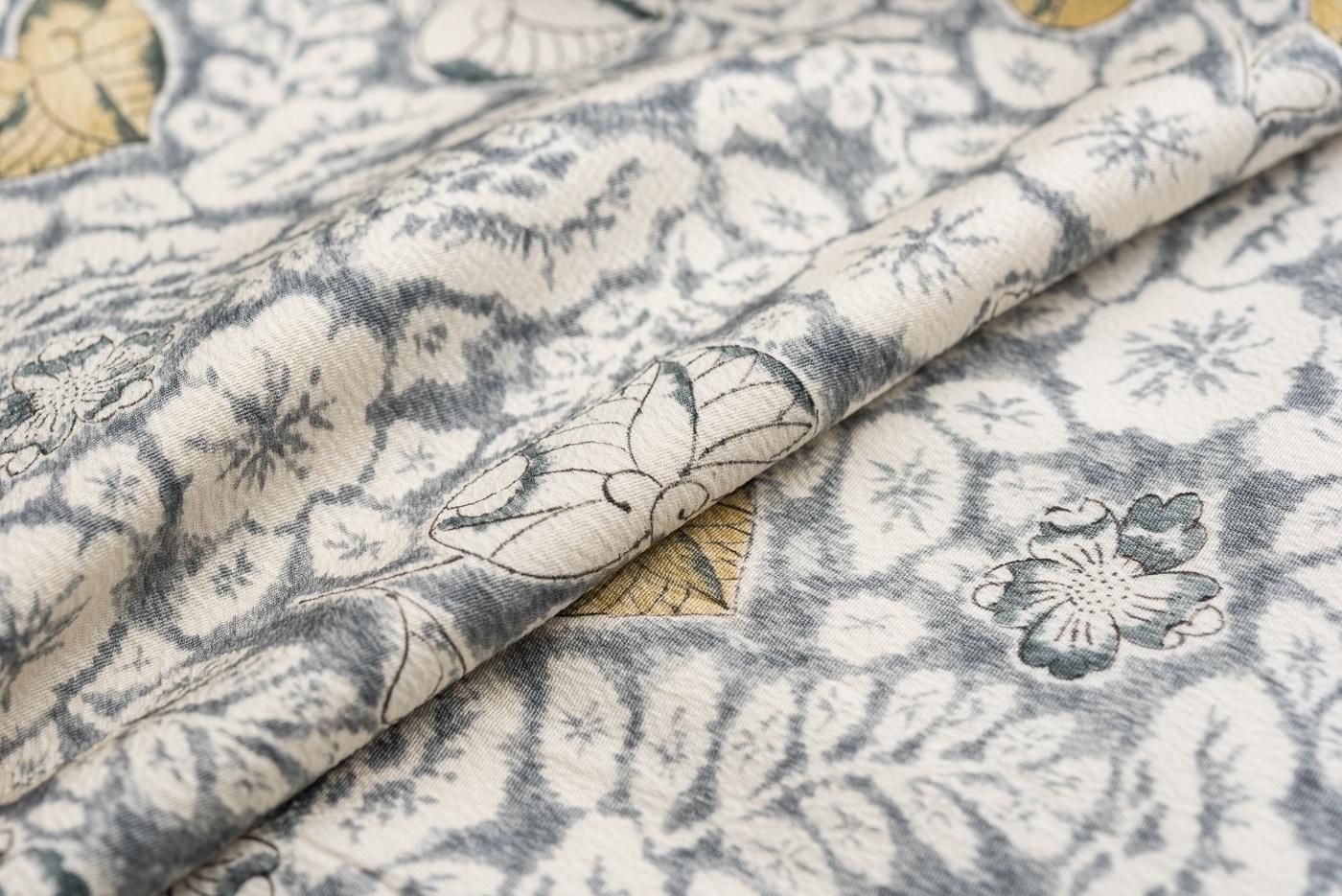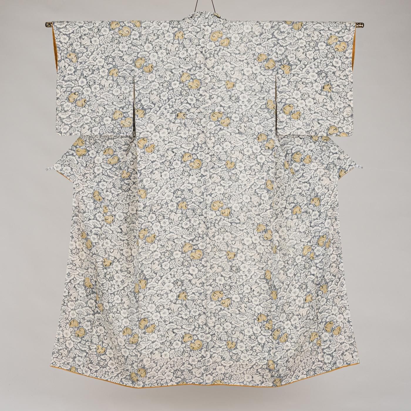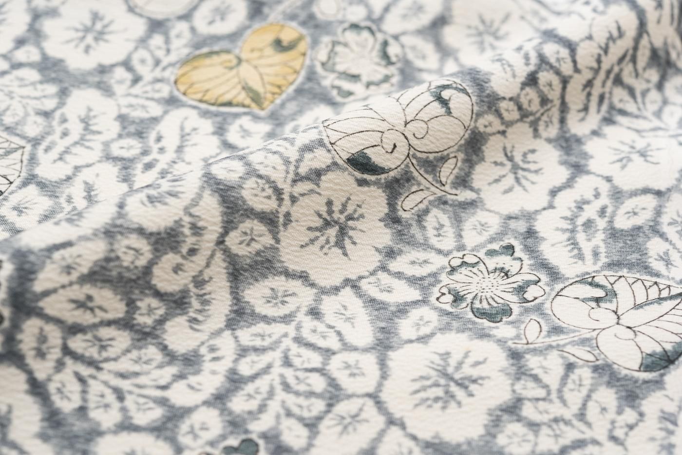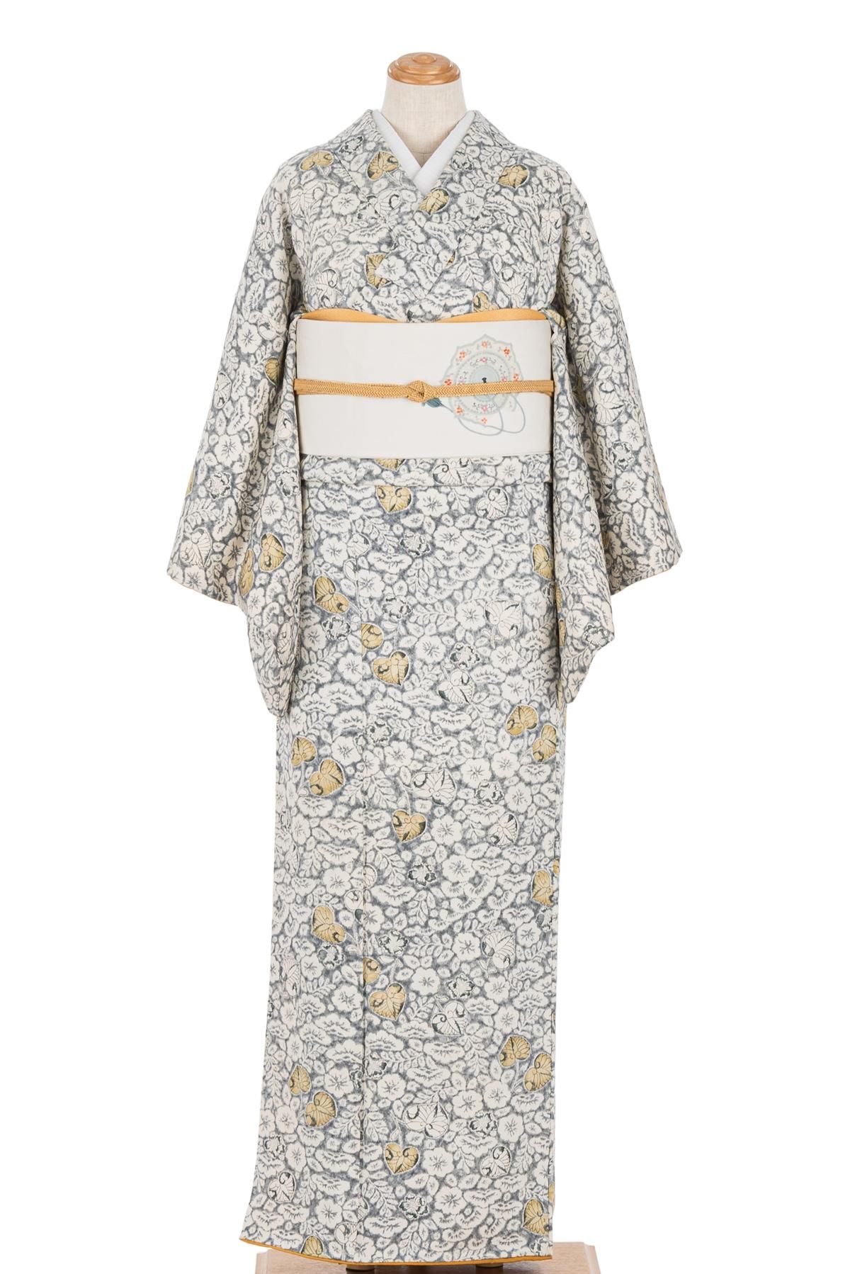 グレー地に白で辻が花模様を染めた小紋の着物です。