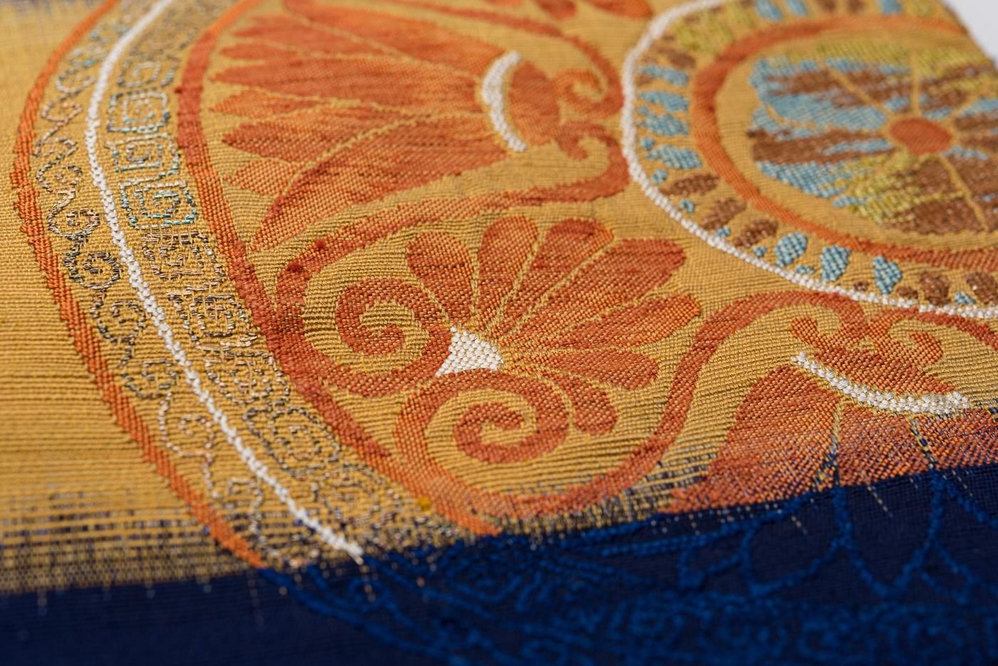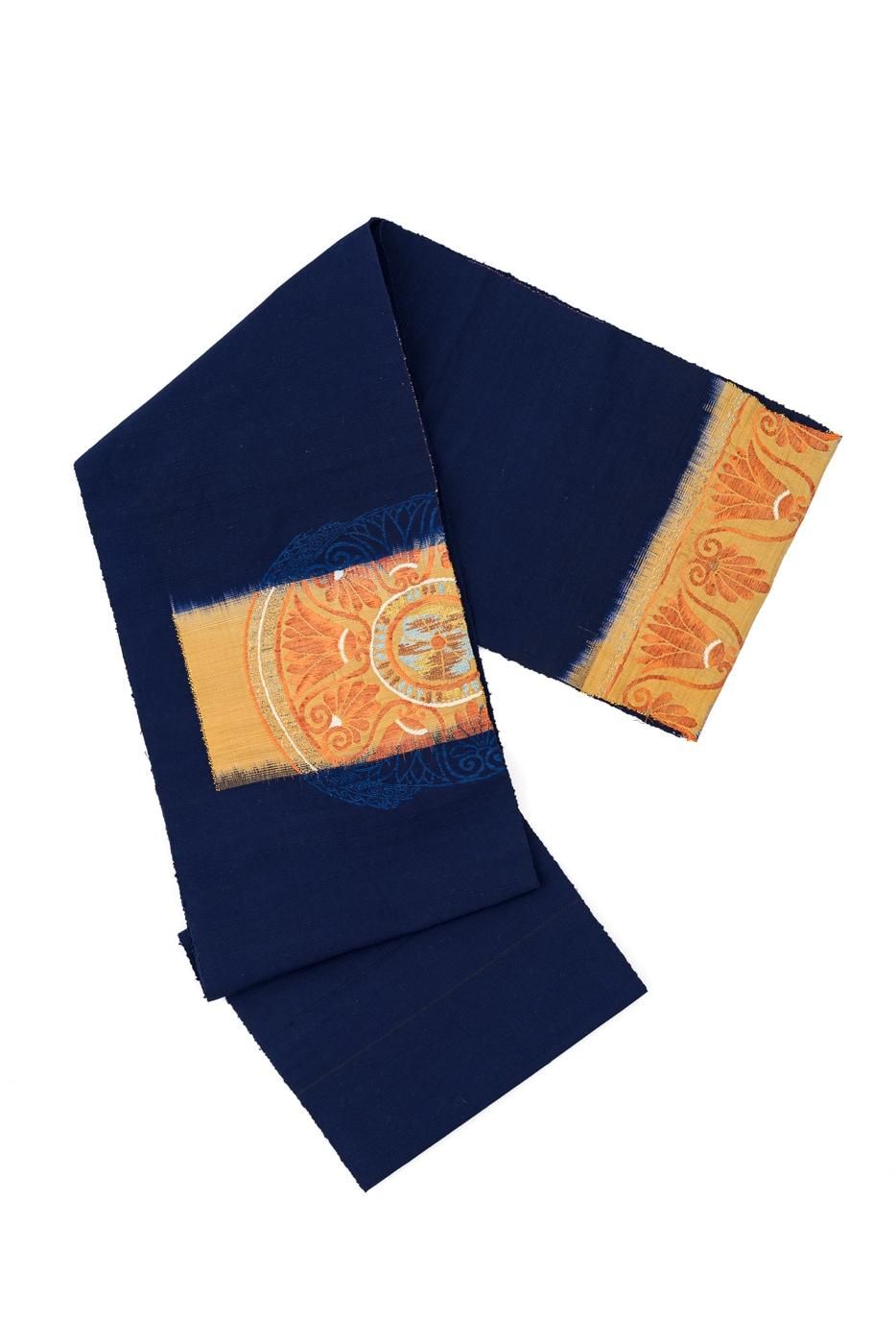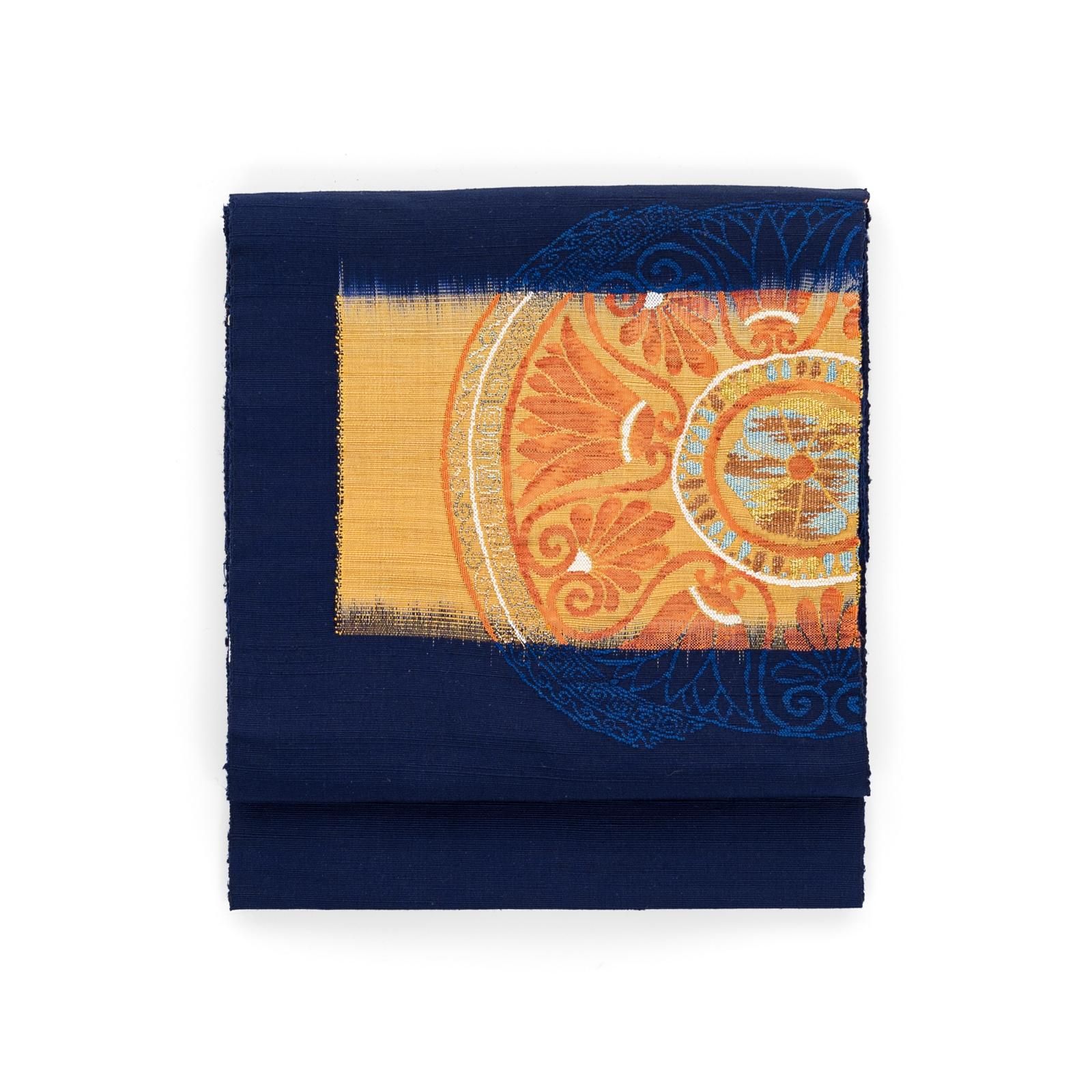 深い藍色の地に大きく花丸模様を織り出した八寸名古屋帯です。