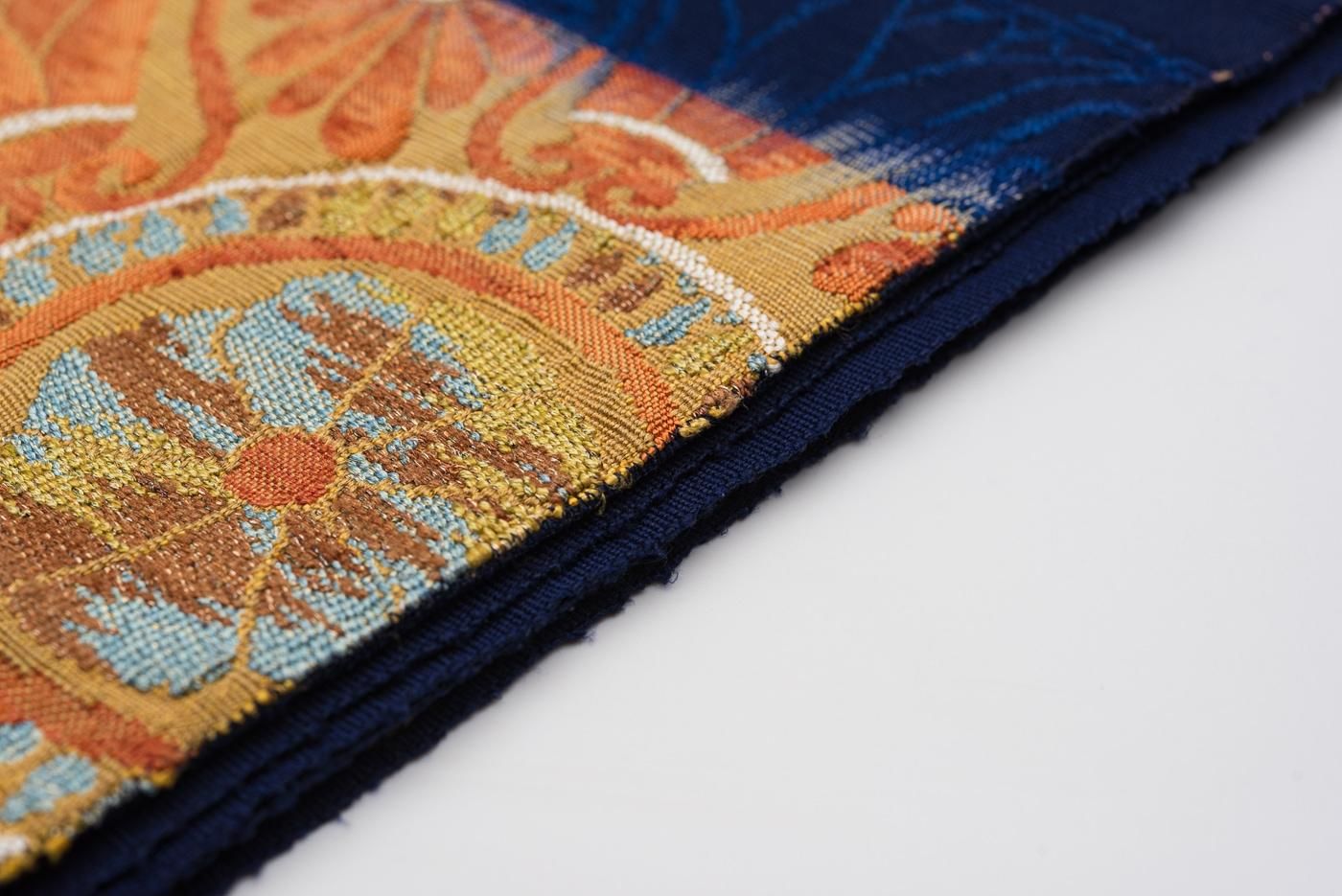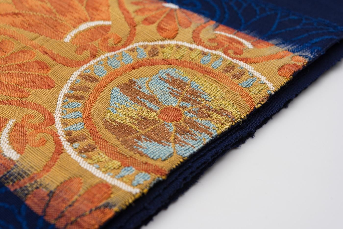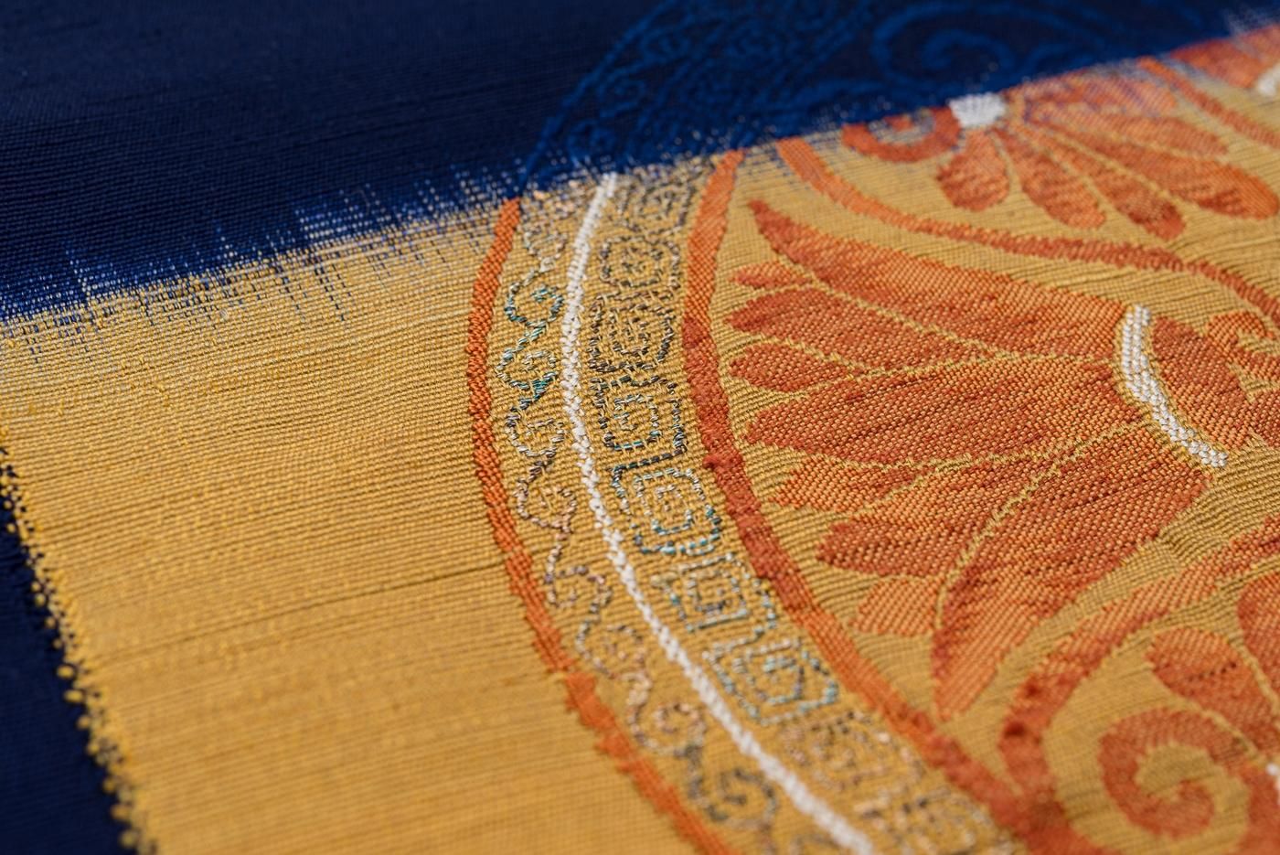 深い藍色の地に大きく花丸模様を織り出した八寸名古屋帯です。