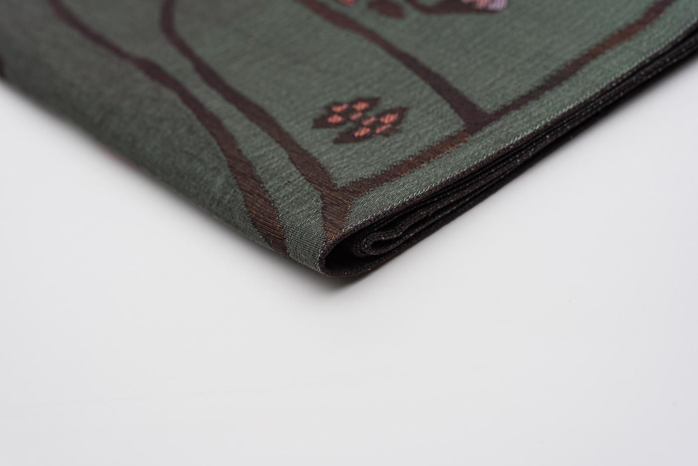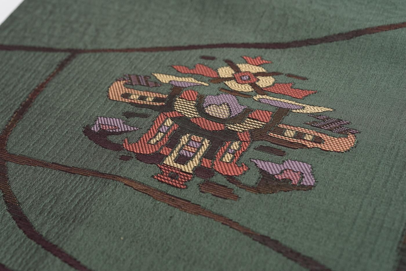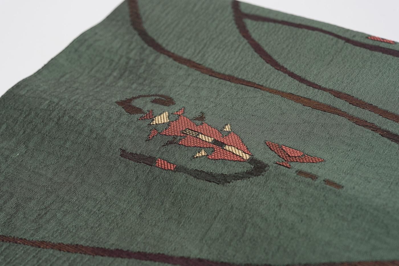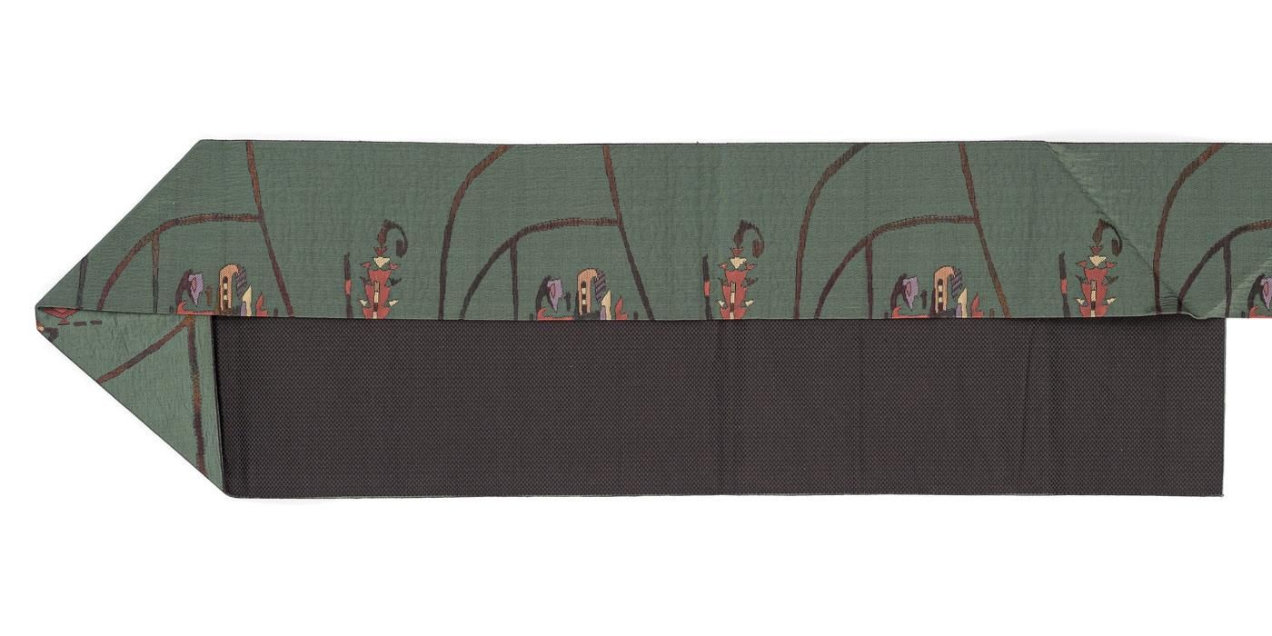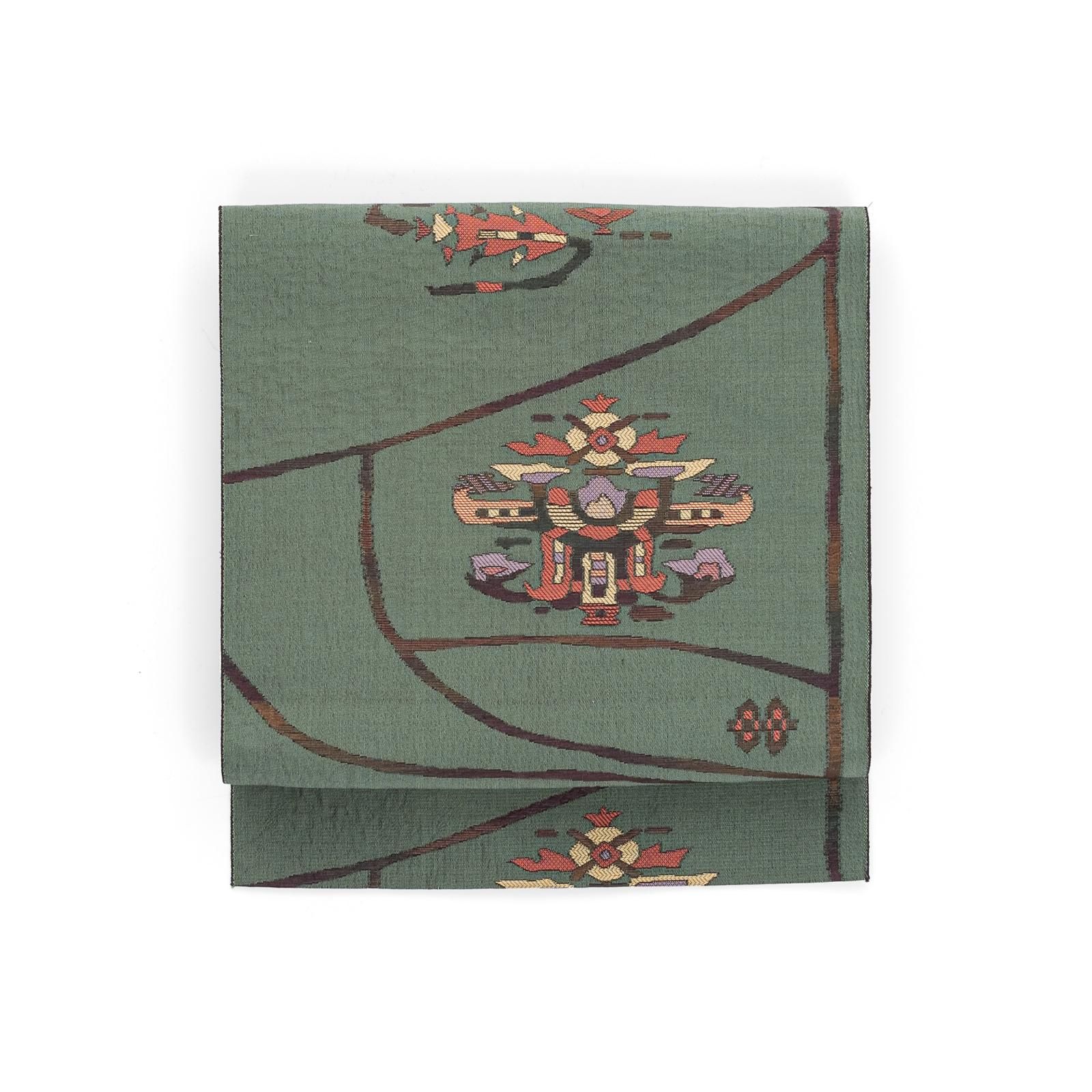 落ち着いた緑色の地に不思議な抽象柄を織り出した八寸名古屋帯です。