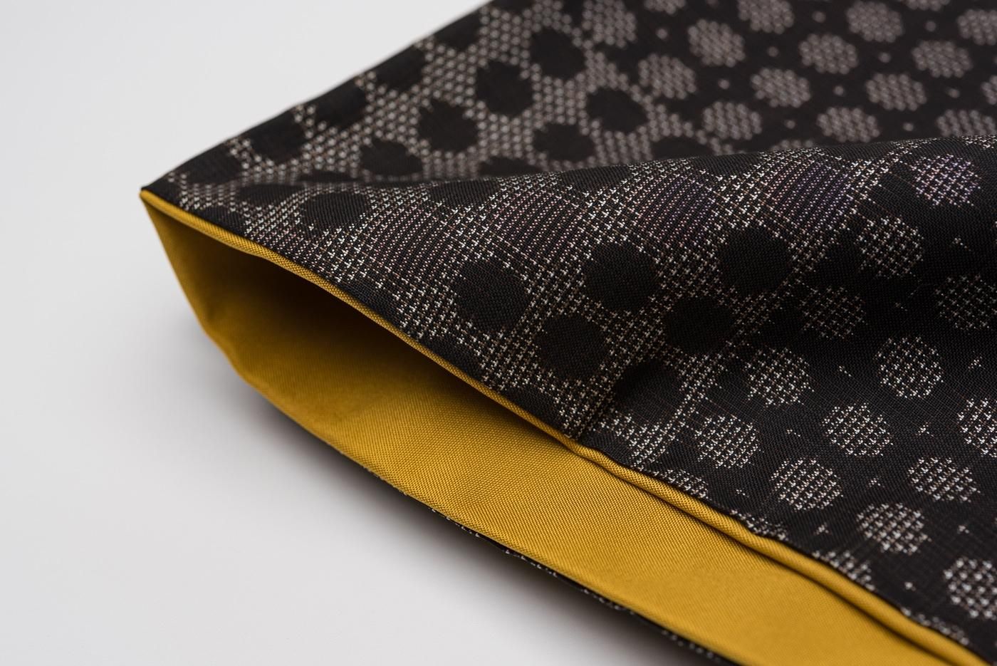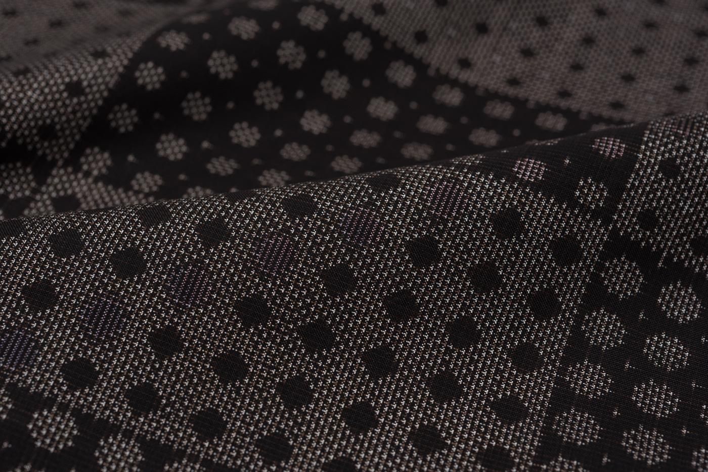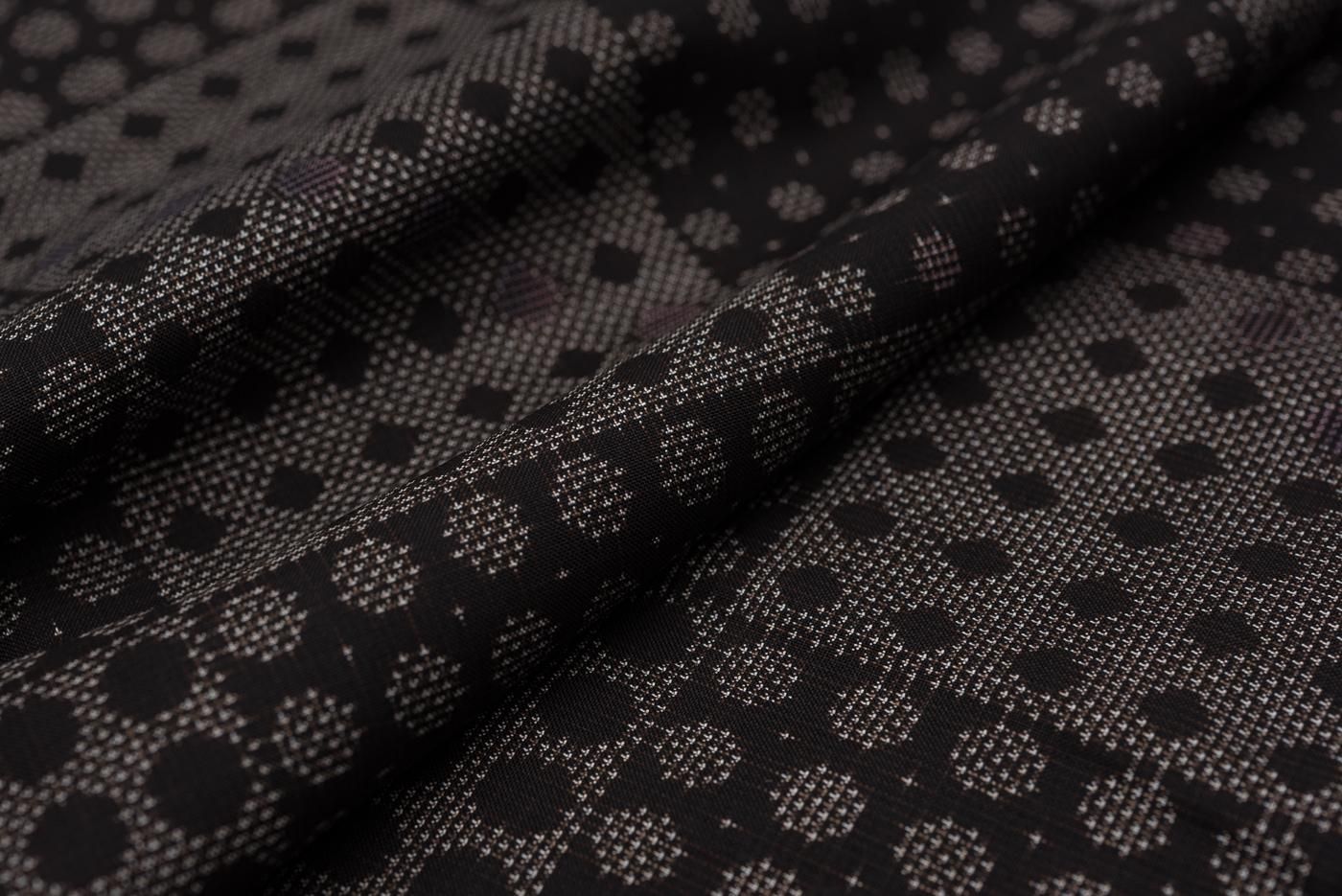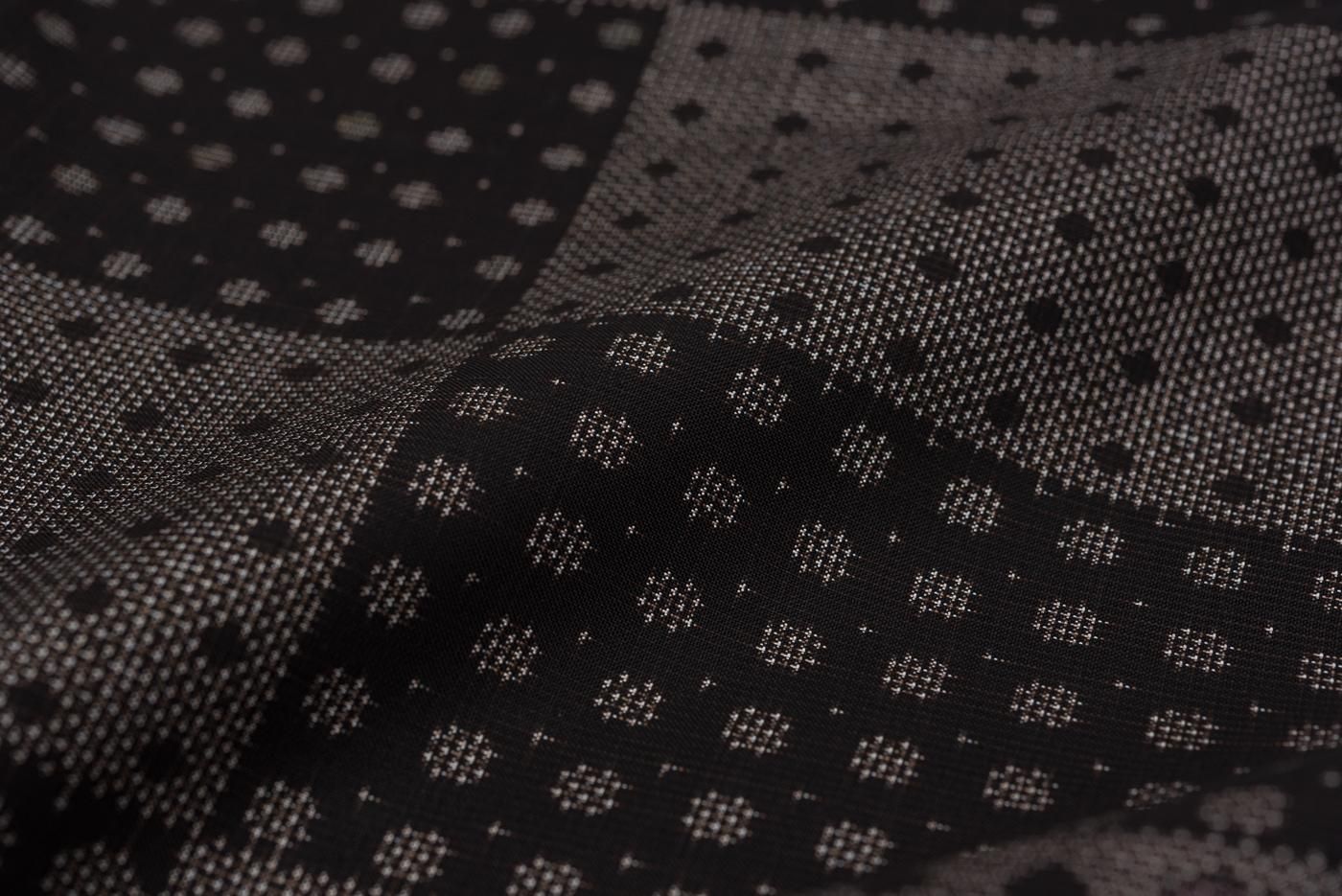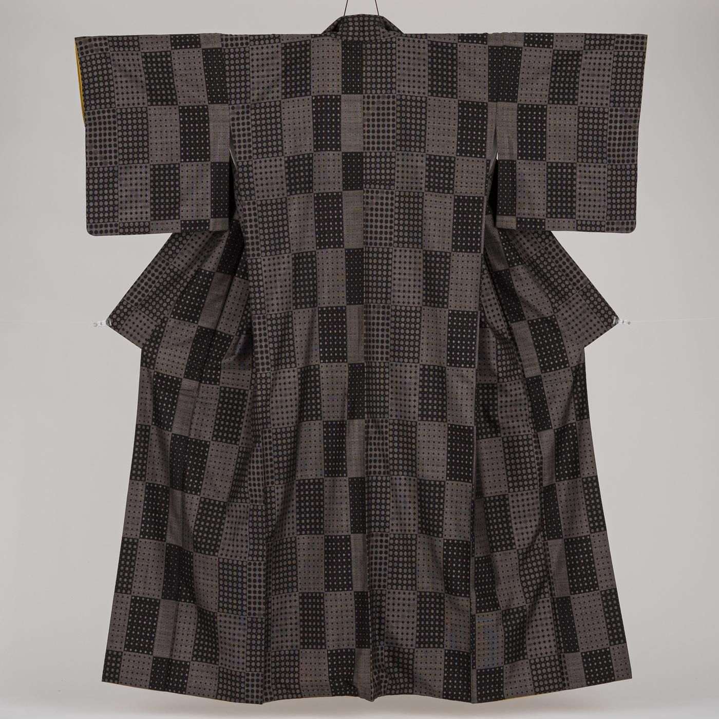 変形の市松に水玉(ドット)模様を織り出した大島紬の着物です。