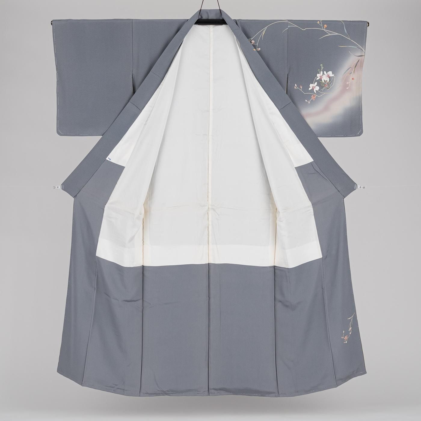 やや紫がかったグレーの地に可憐な花が浮かび上がるエレガントなデザインです。