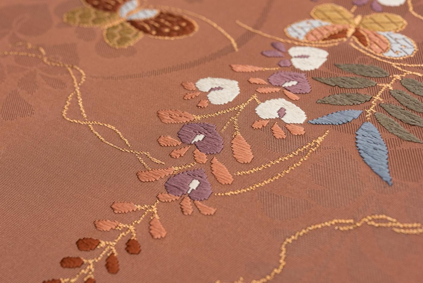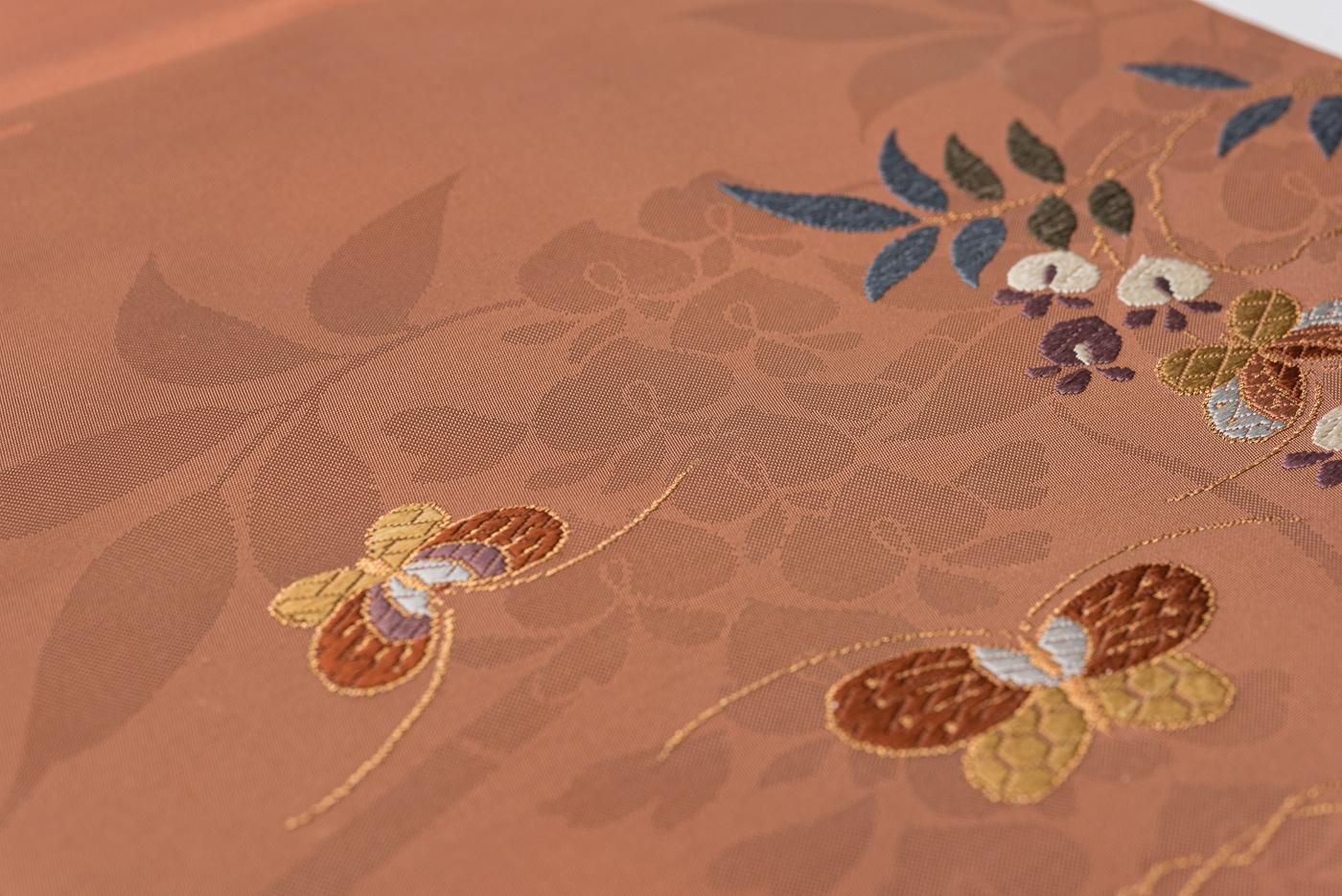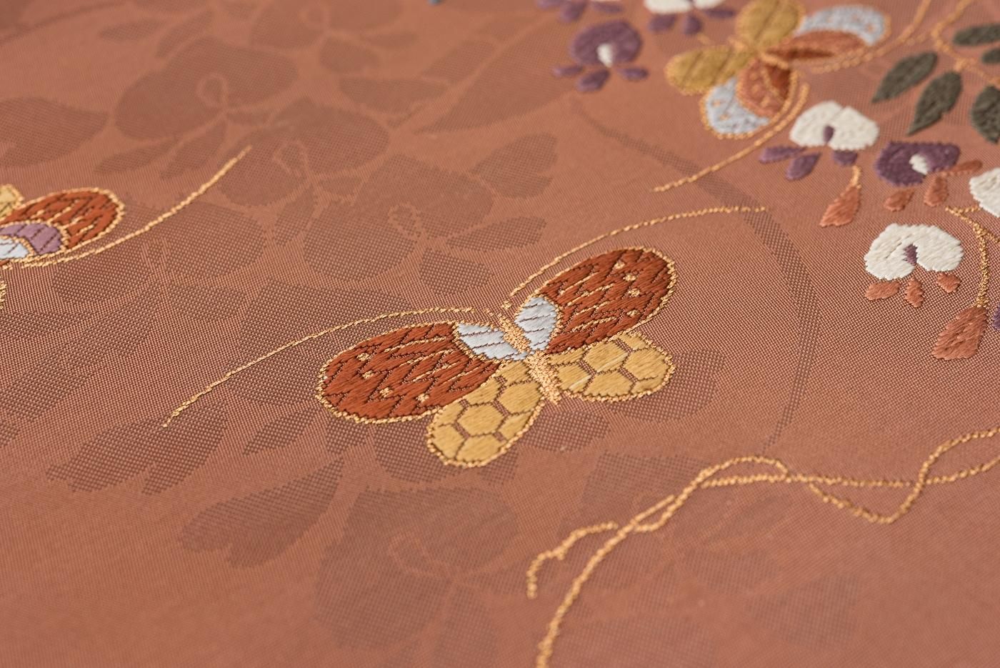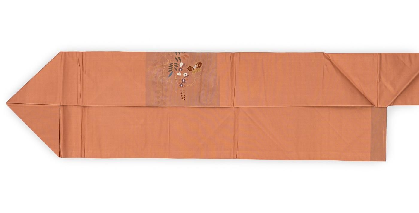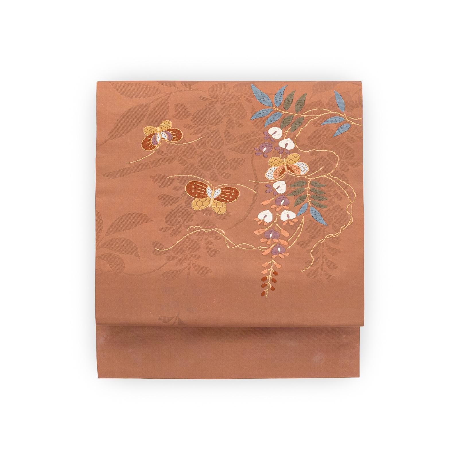 ゆらり揺れる藤のはなに小さな蝶々が戯れる九寸名古屋帯です。