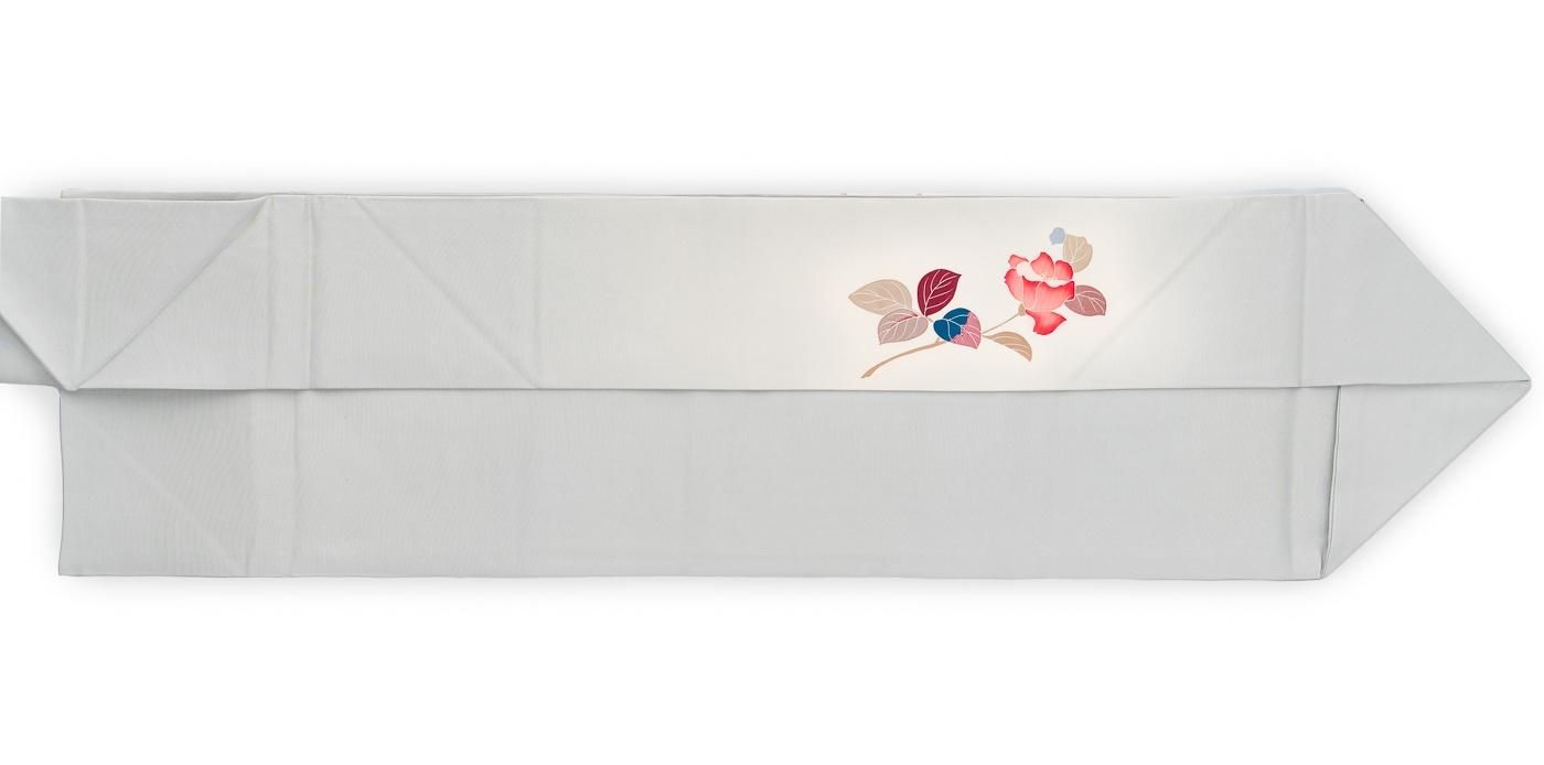 淡いグレーの地に薔薇にも似た花を一輪描いた塩瀬の九寸名古屋帯です。