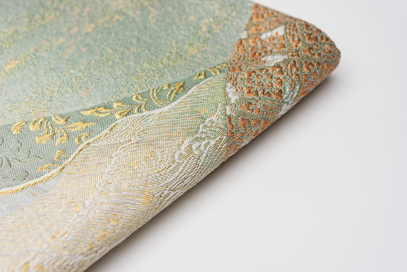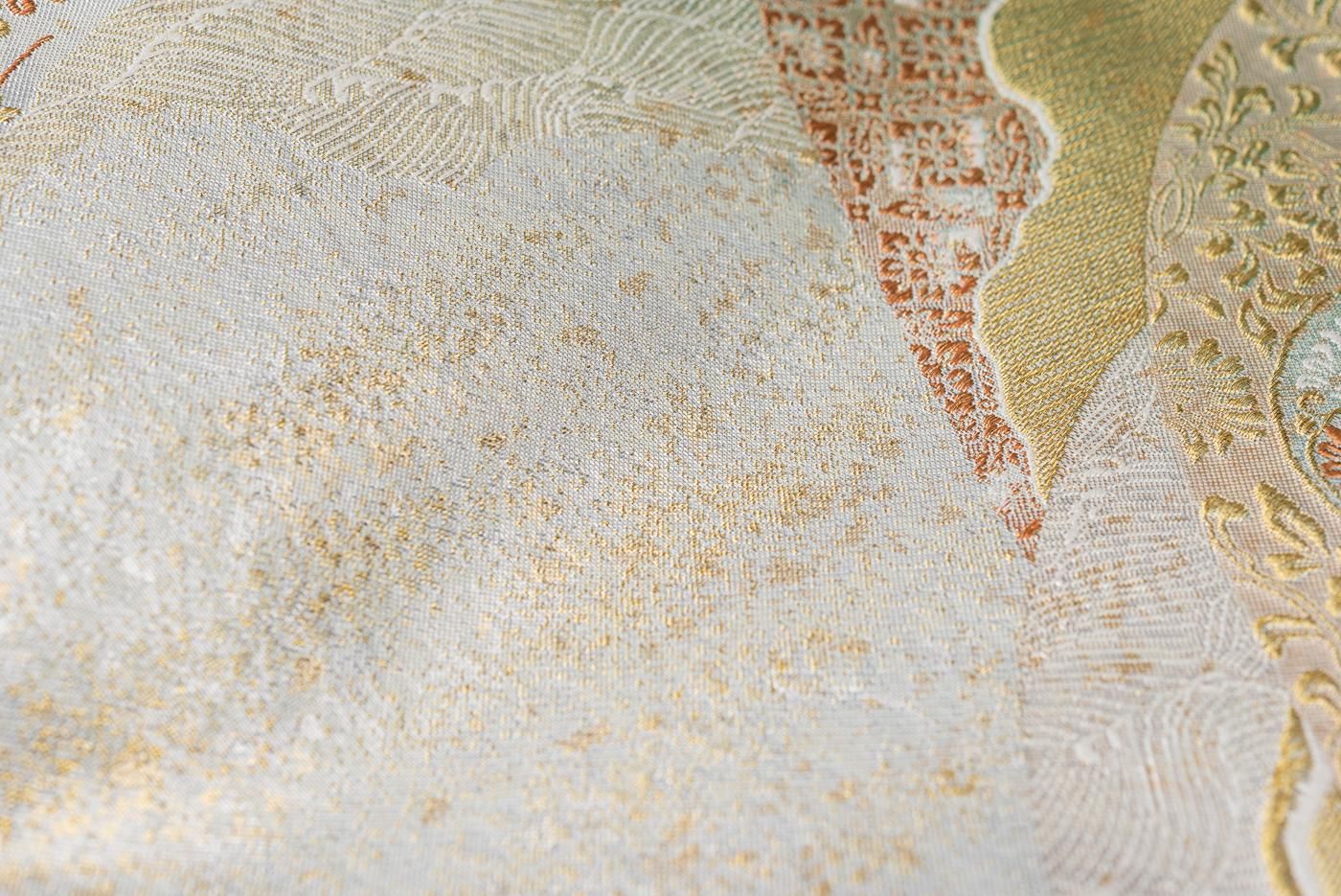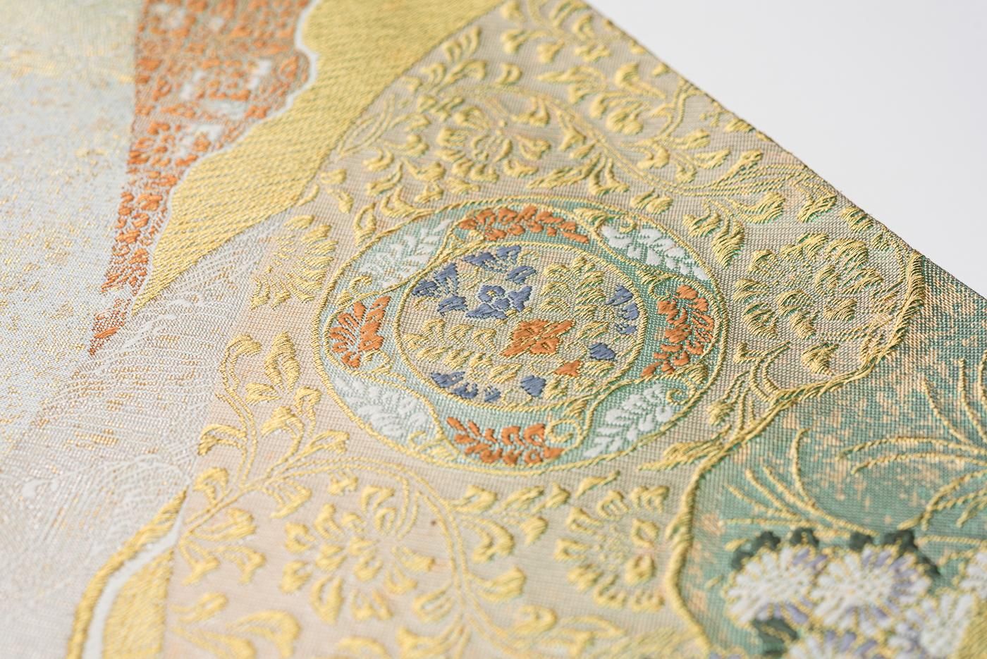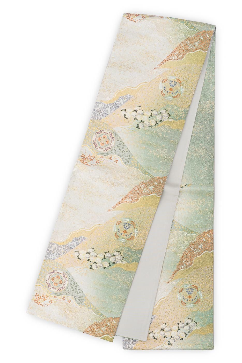淡い色彩の道長取りに華紋や白菊などを添えた袋帯です。