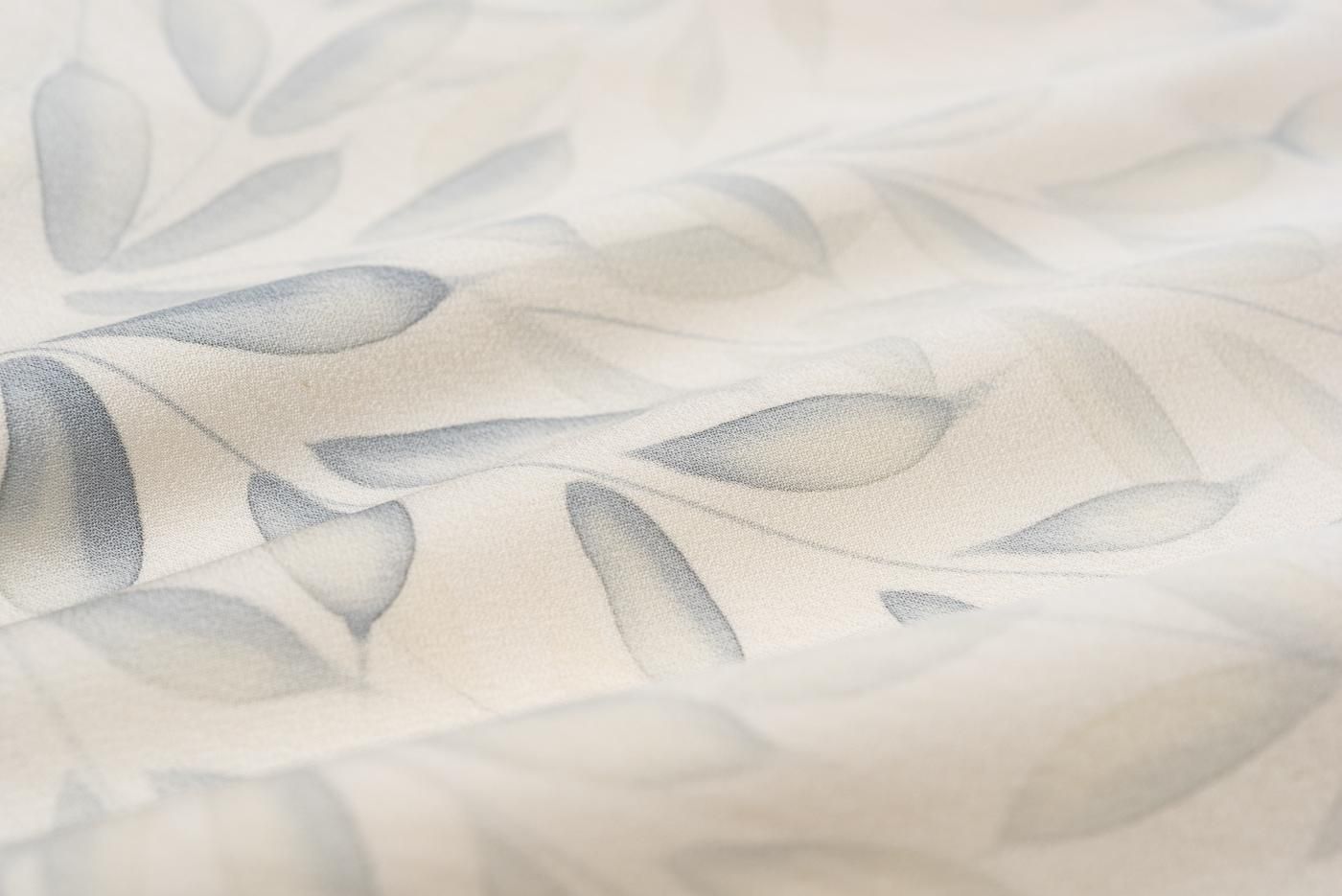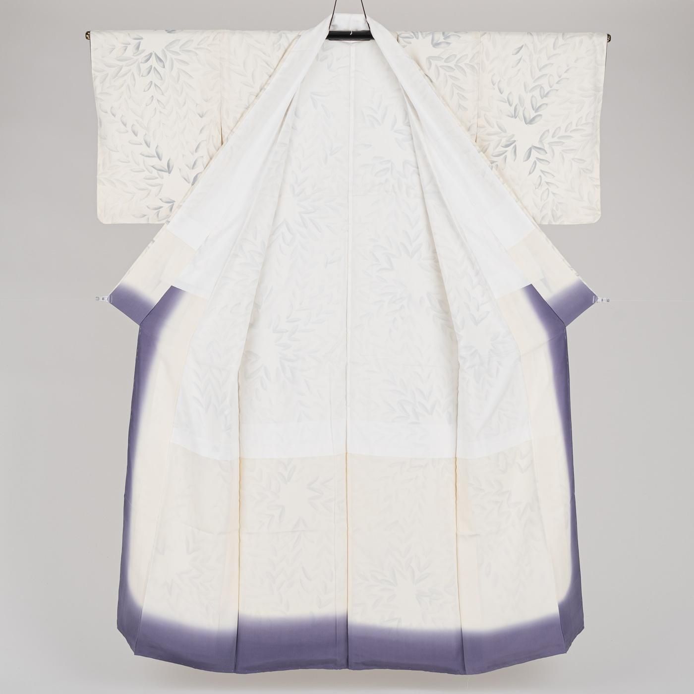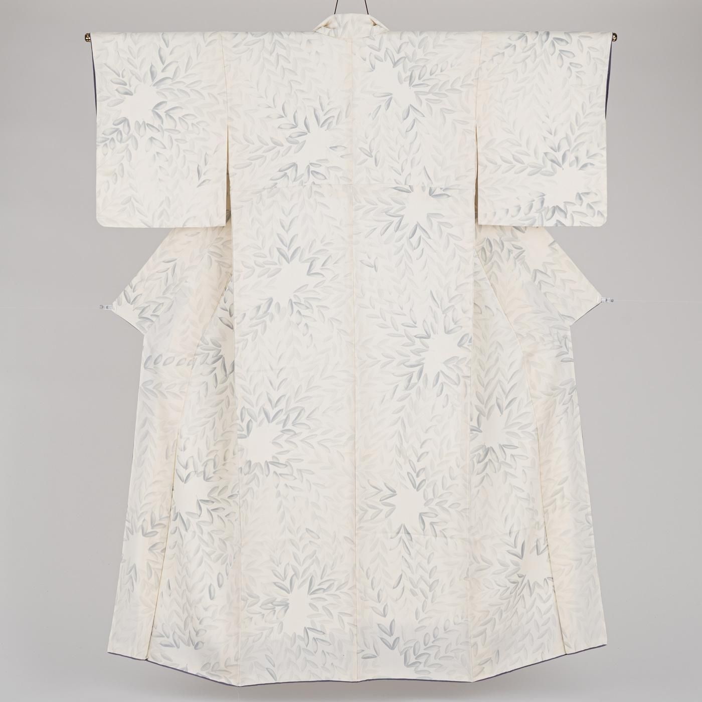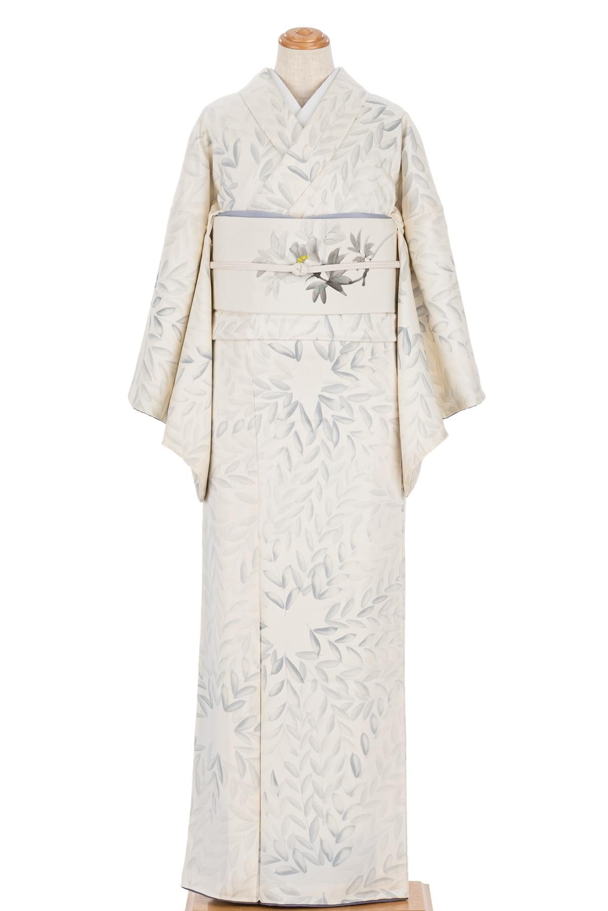 パールホワイトの地にグレーの葉を染めた小紋の着物です。