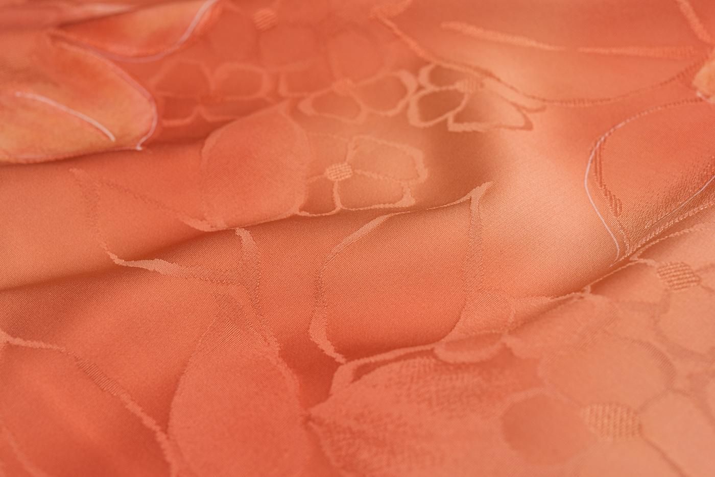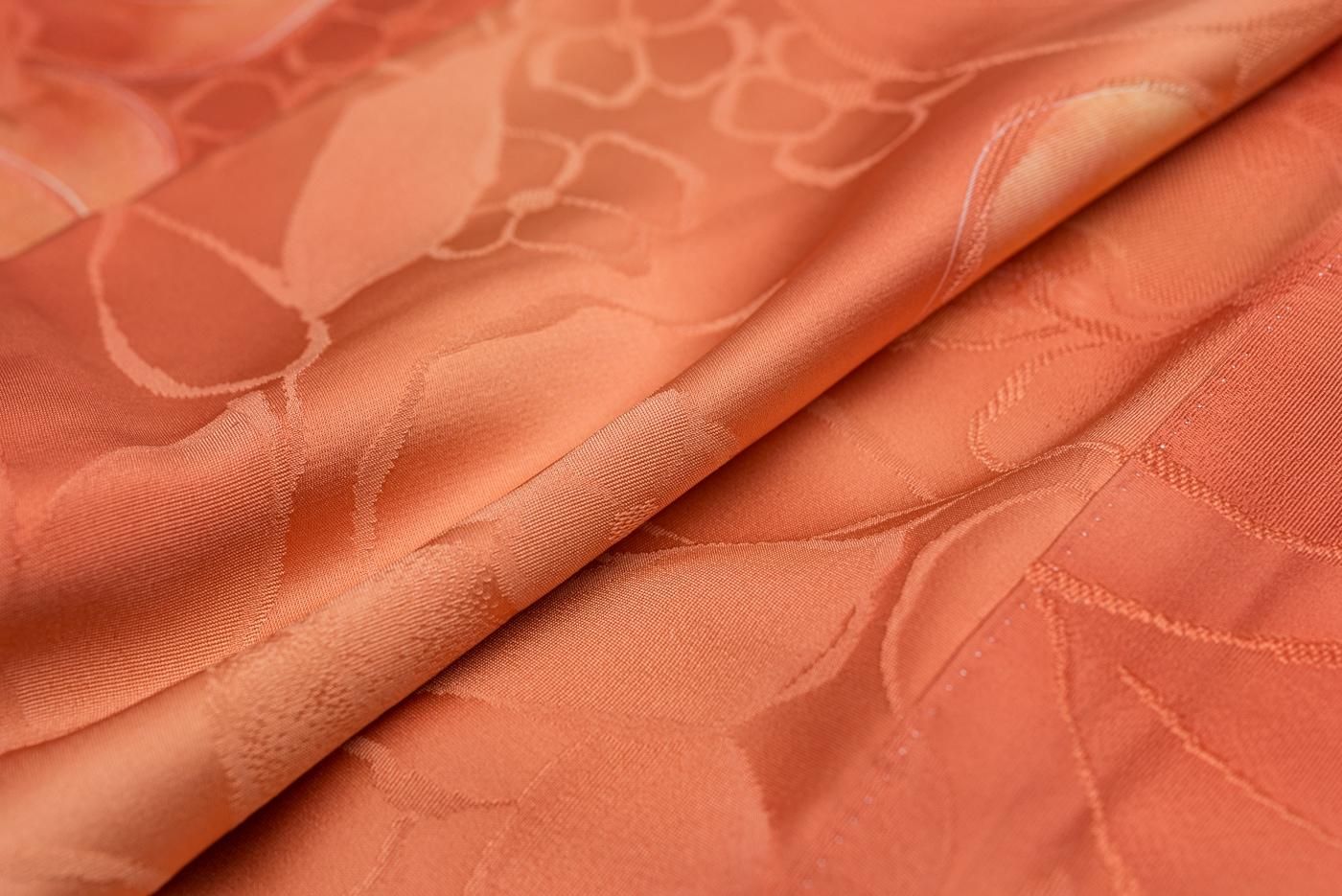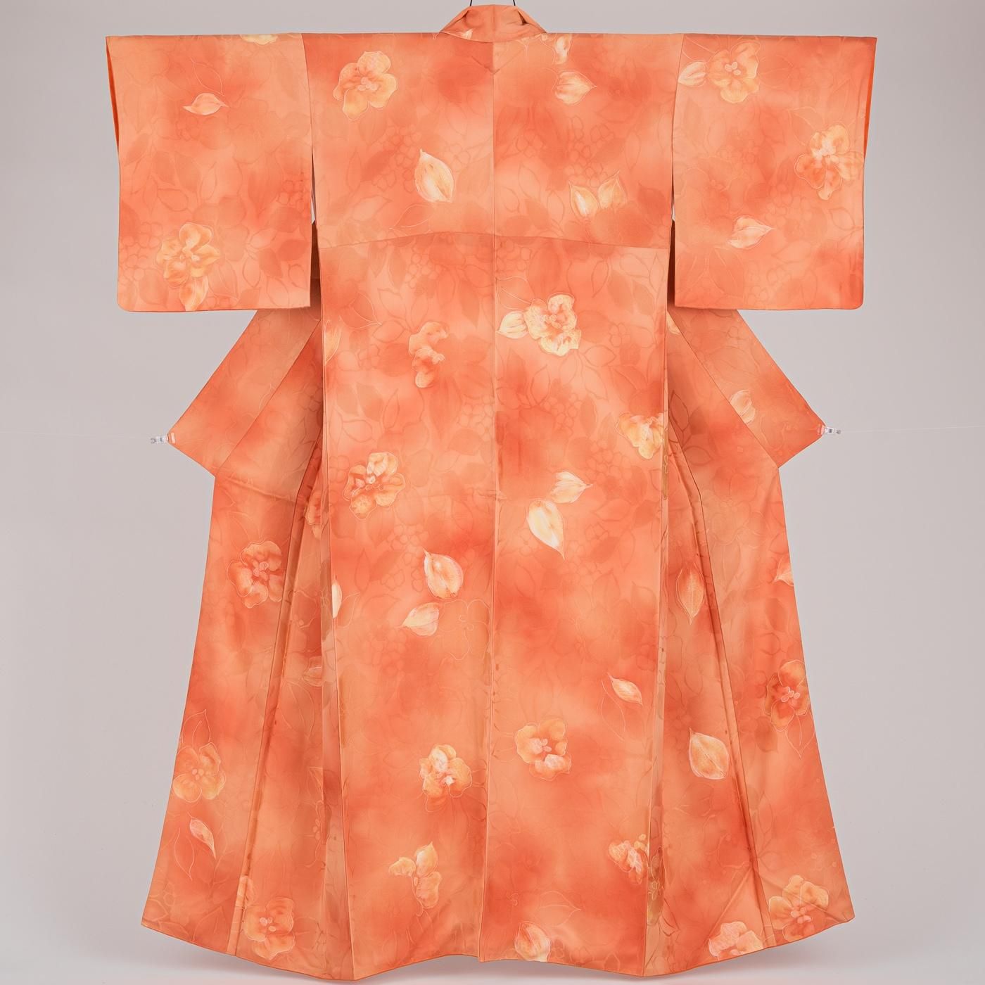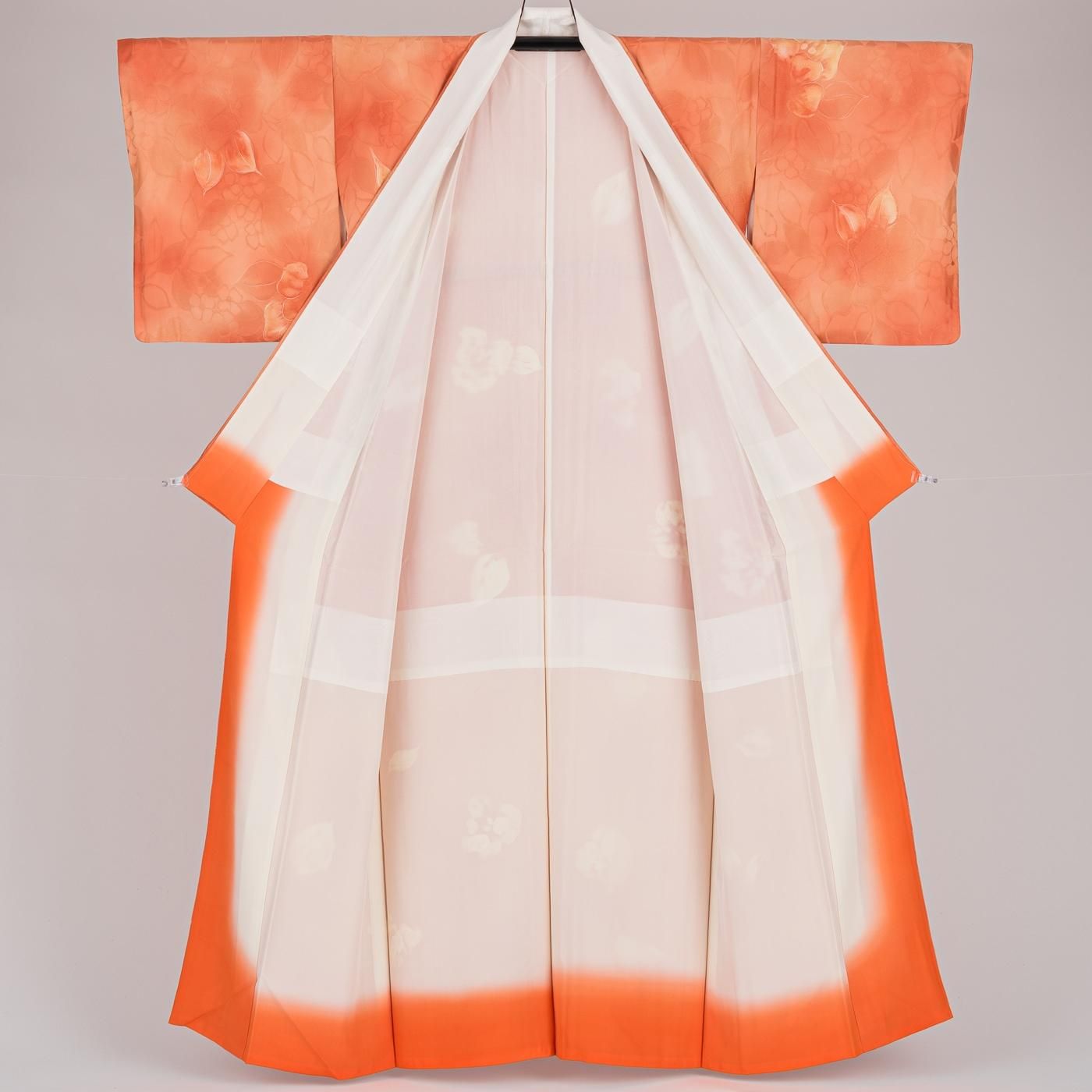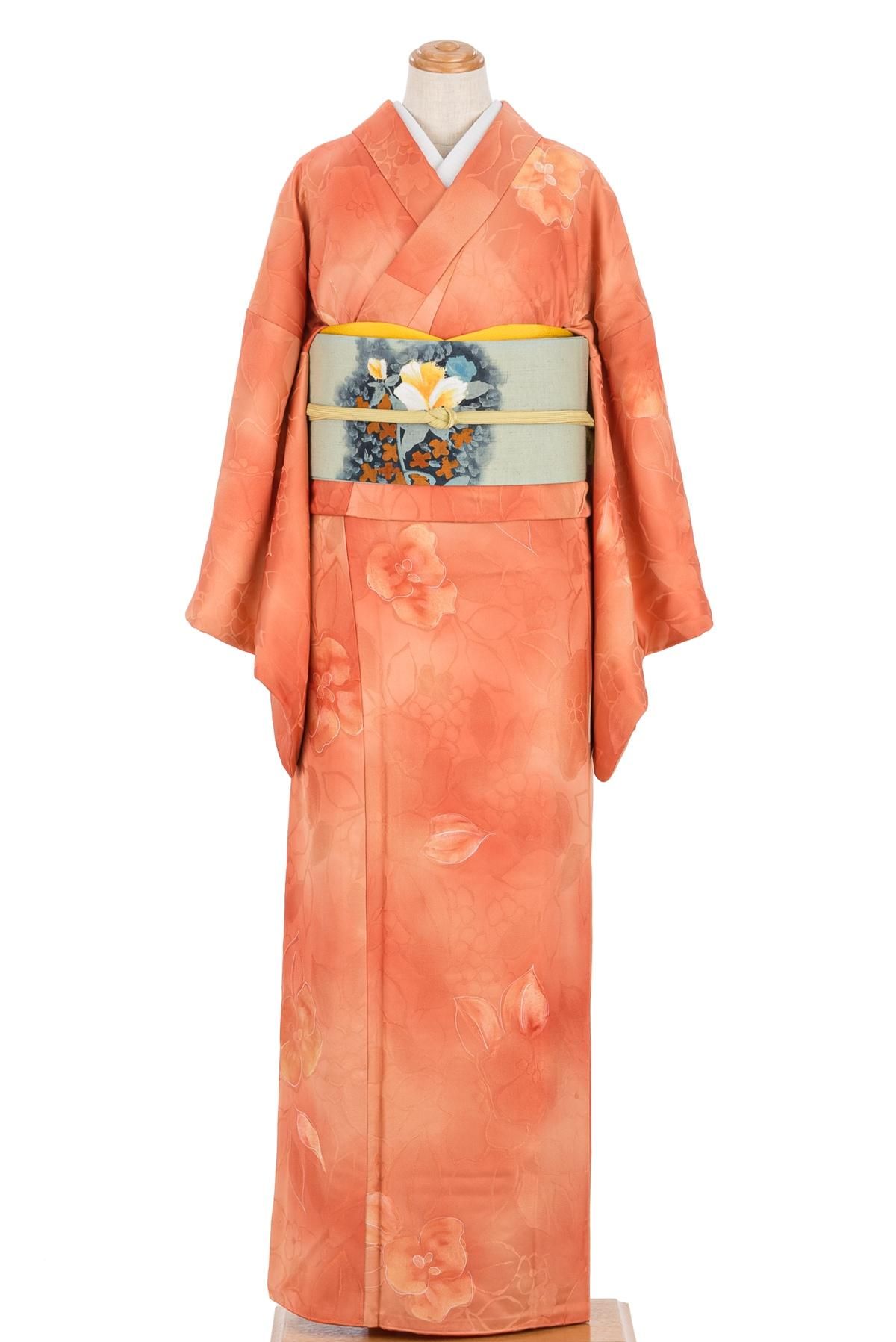 オレンジ色の暈し地に地紋起こしの花模様が広がる小紋の着物です。
