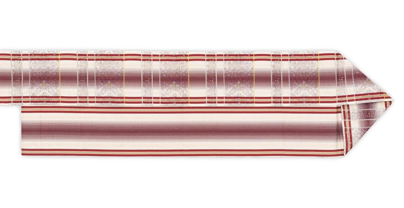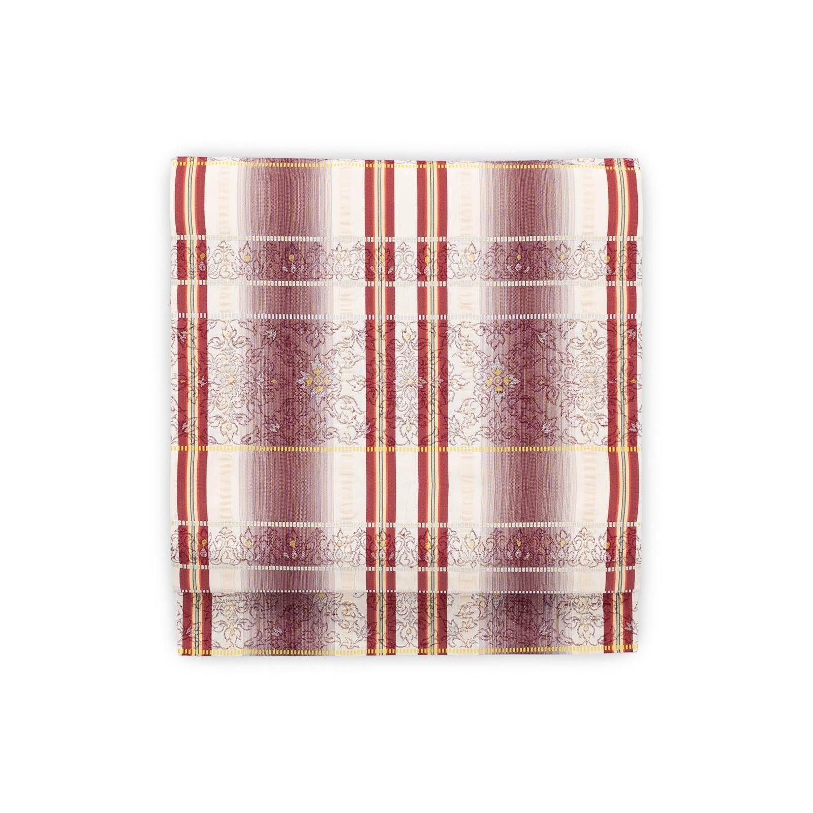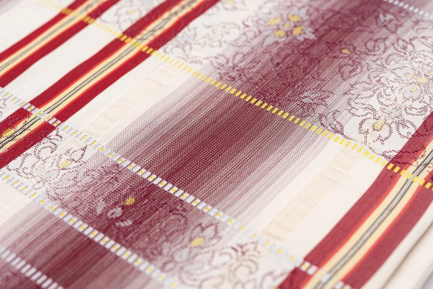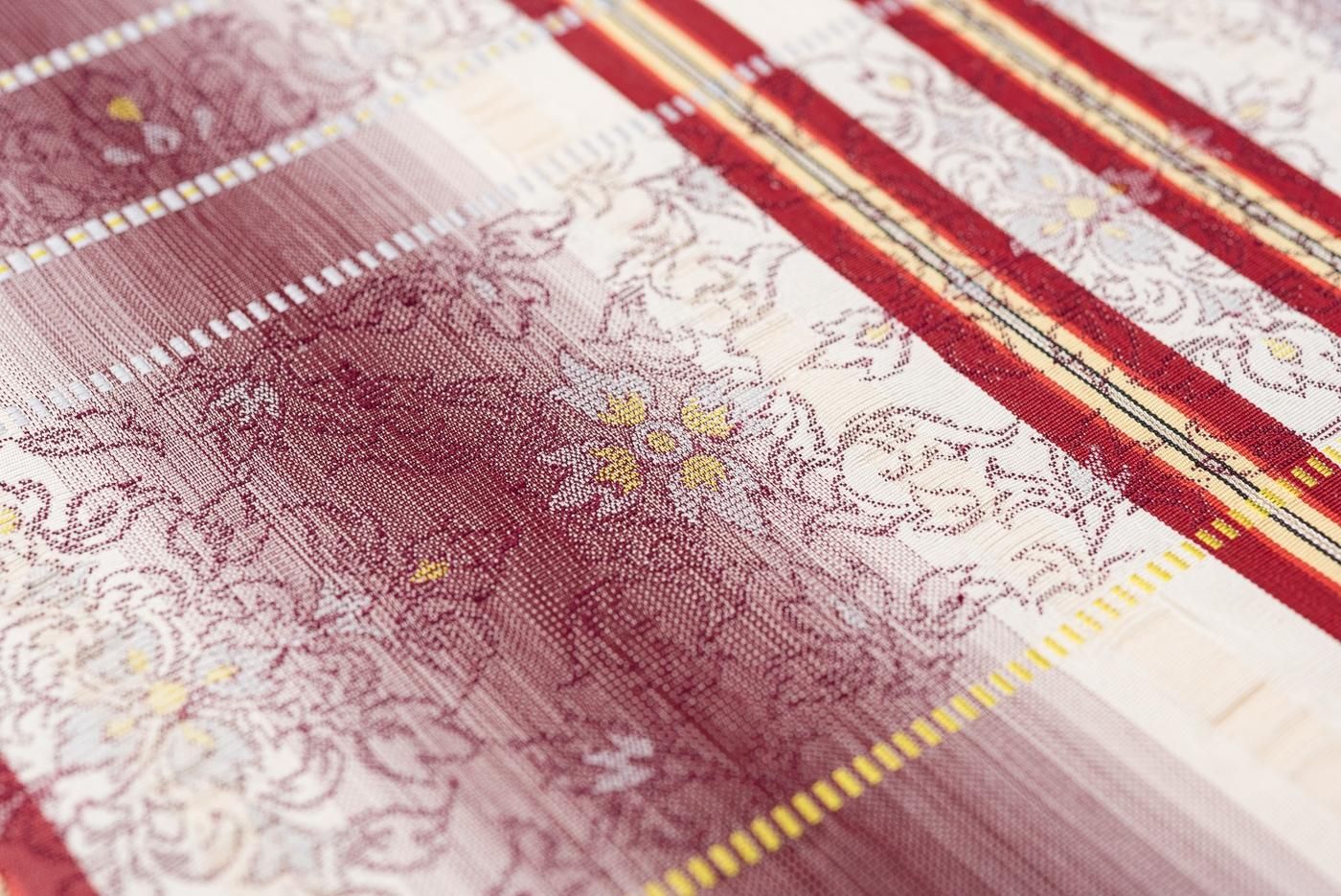 深緋色の縞の奥に繊細な唐花模様を重ねた九寸名古屋帯です。