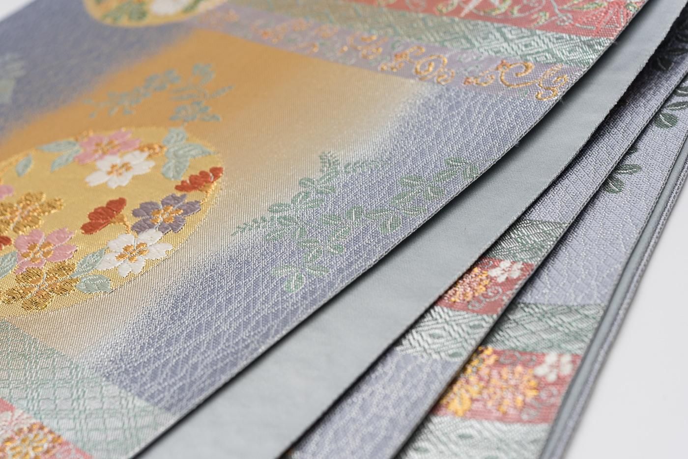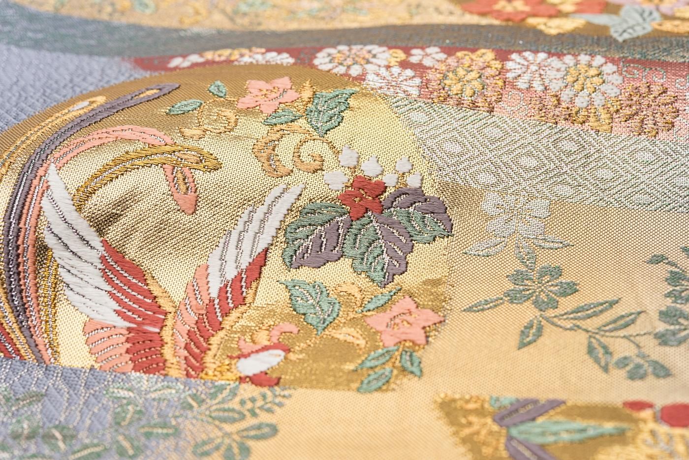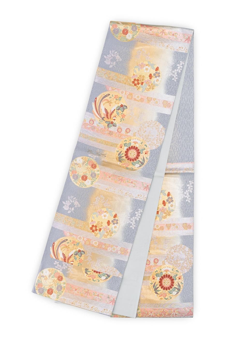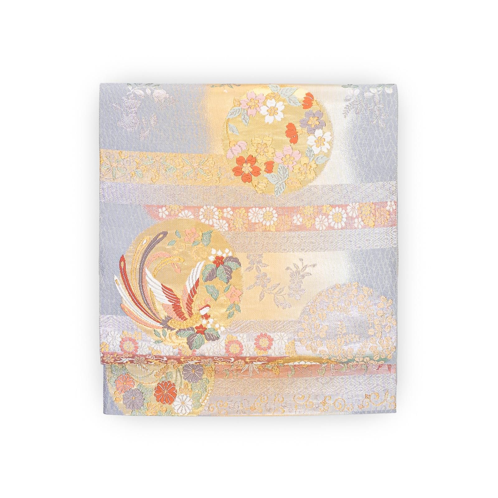 満月のような金の丸に鳳凰と花を織り出した袋帯です。