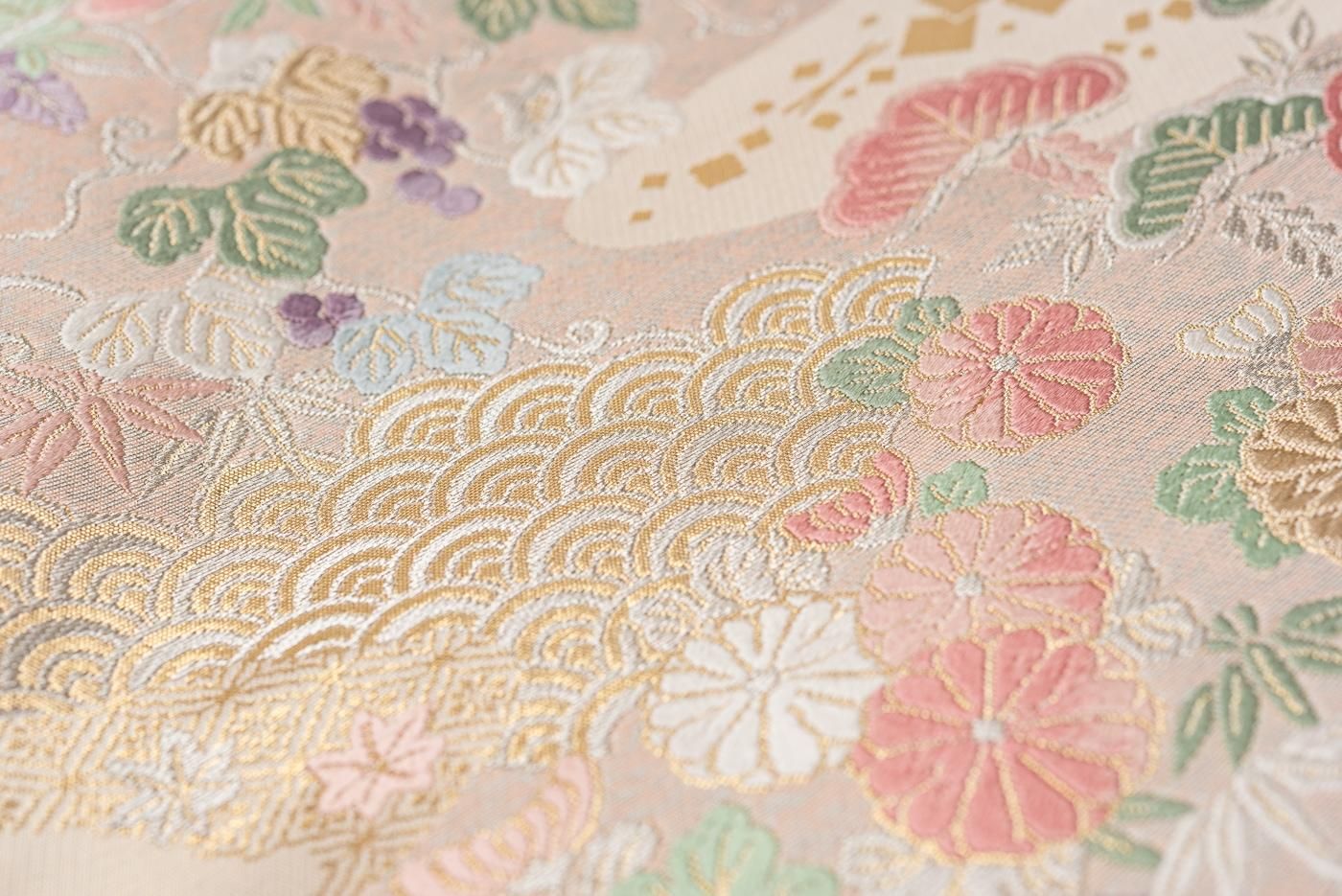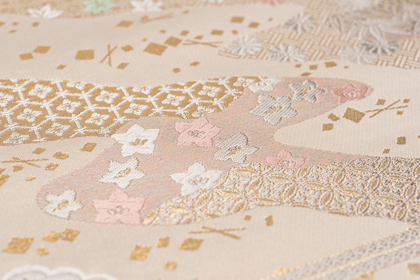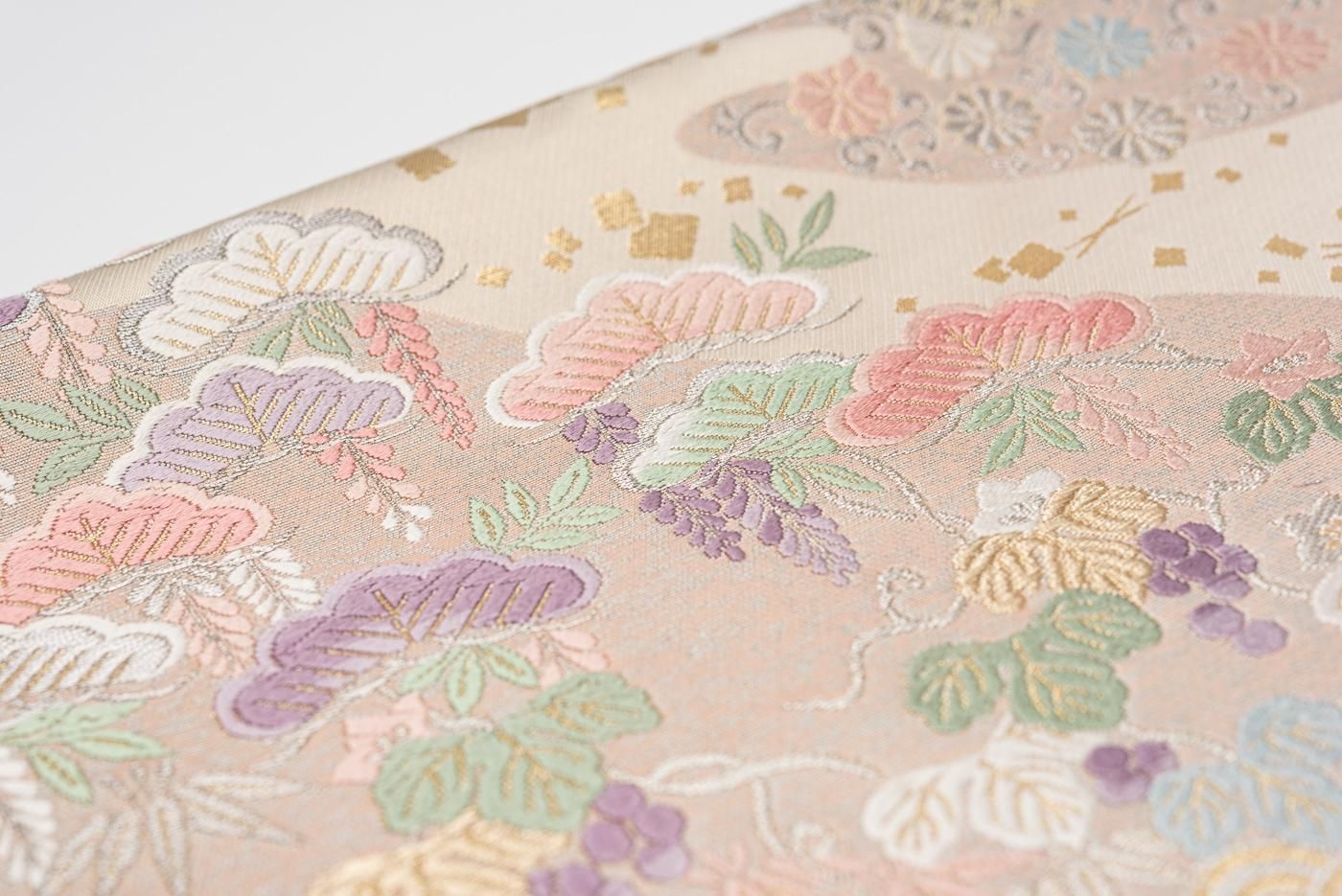 花と共に織り出した金の七宝、青海波、花菱が華やかなアクセントになっていますね。