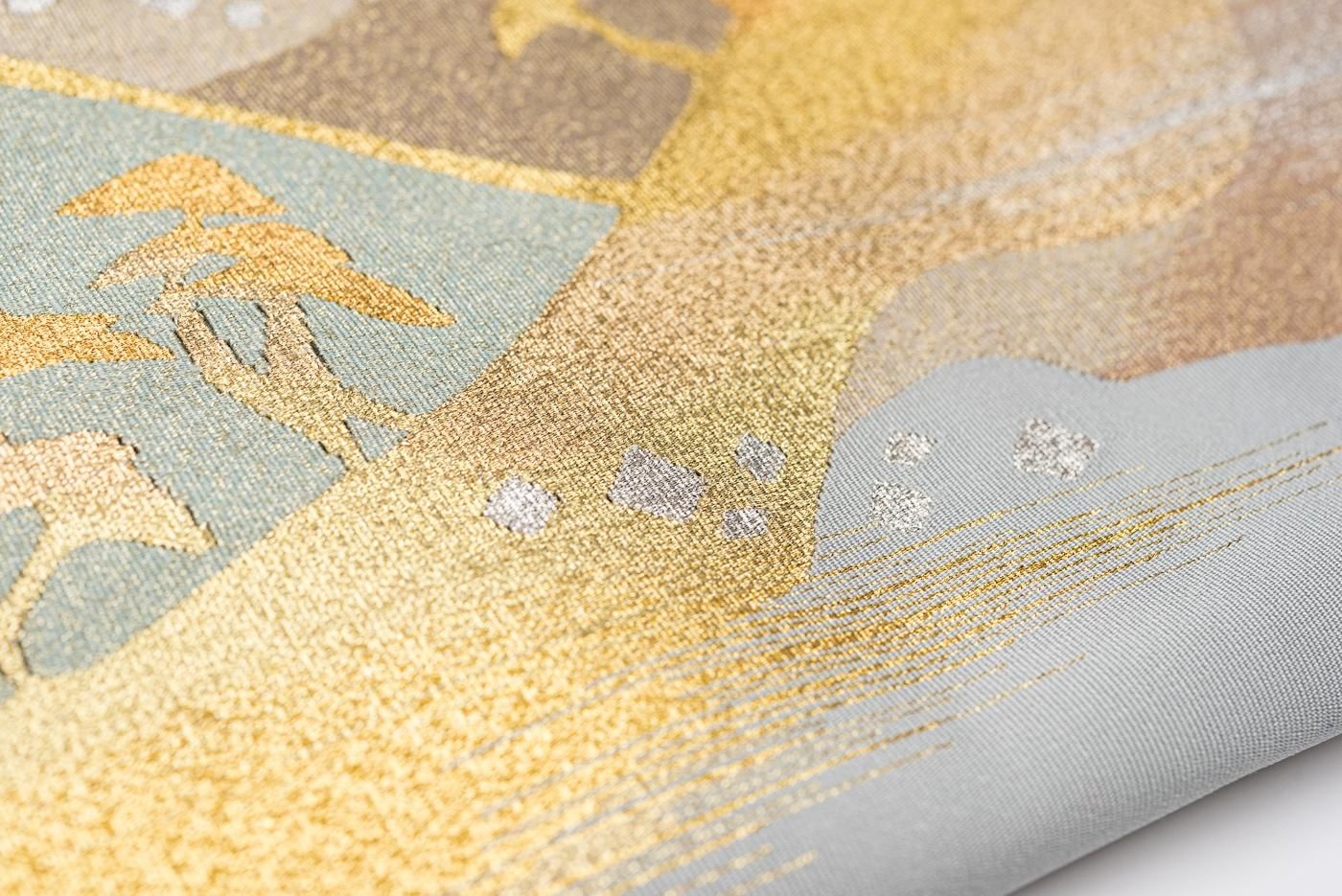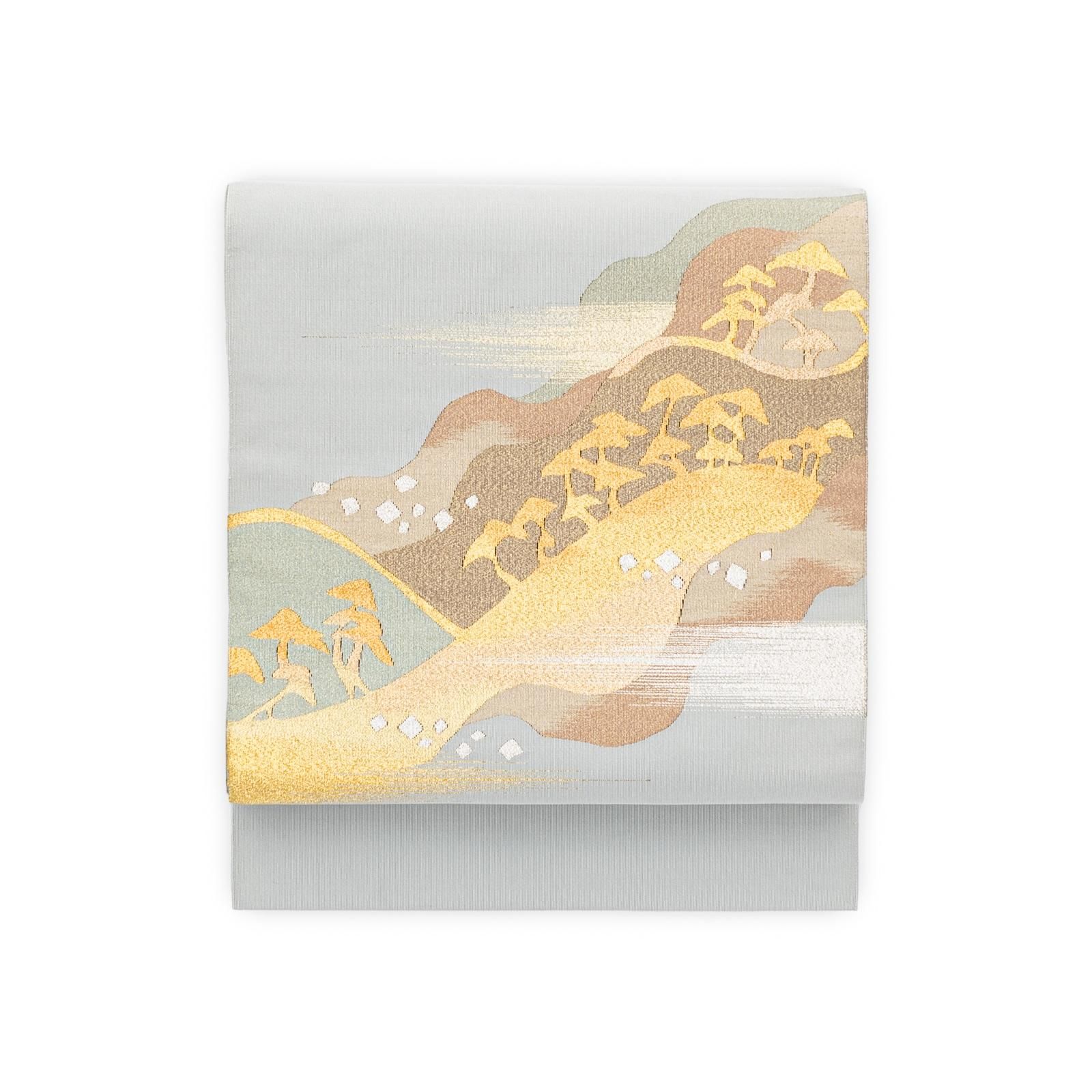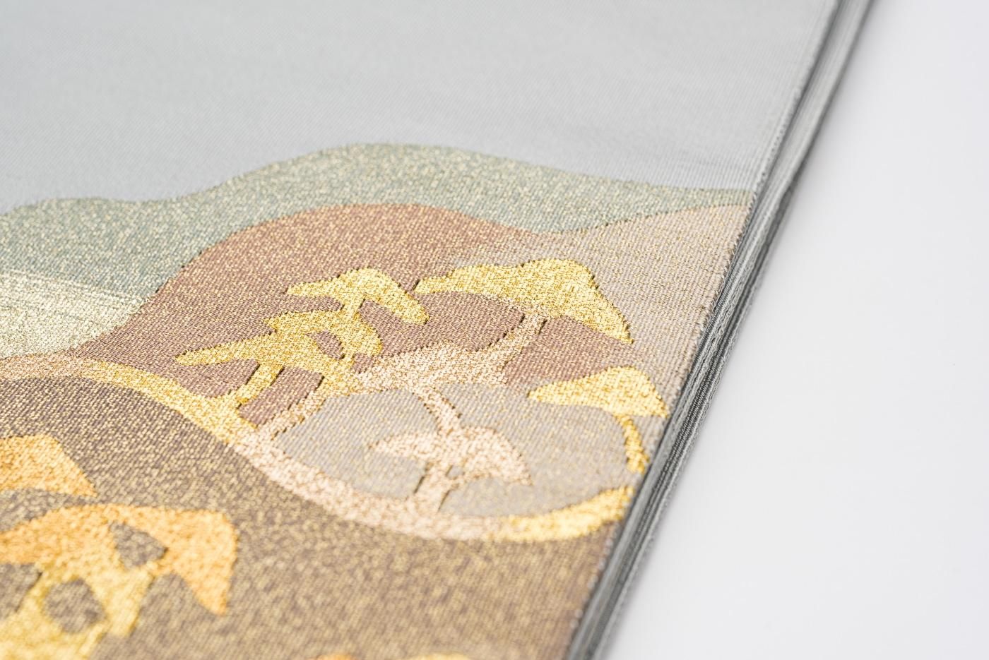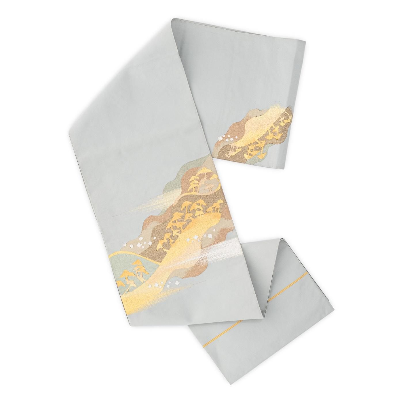霞の奥に松の木が揺れる本綴れの八寸名古屋帯です。