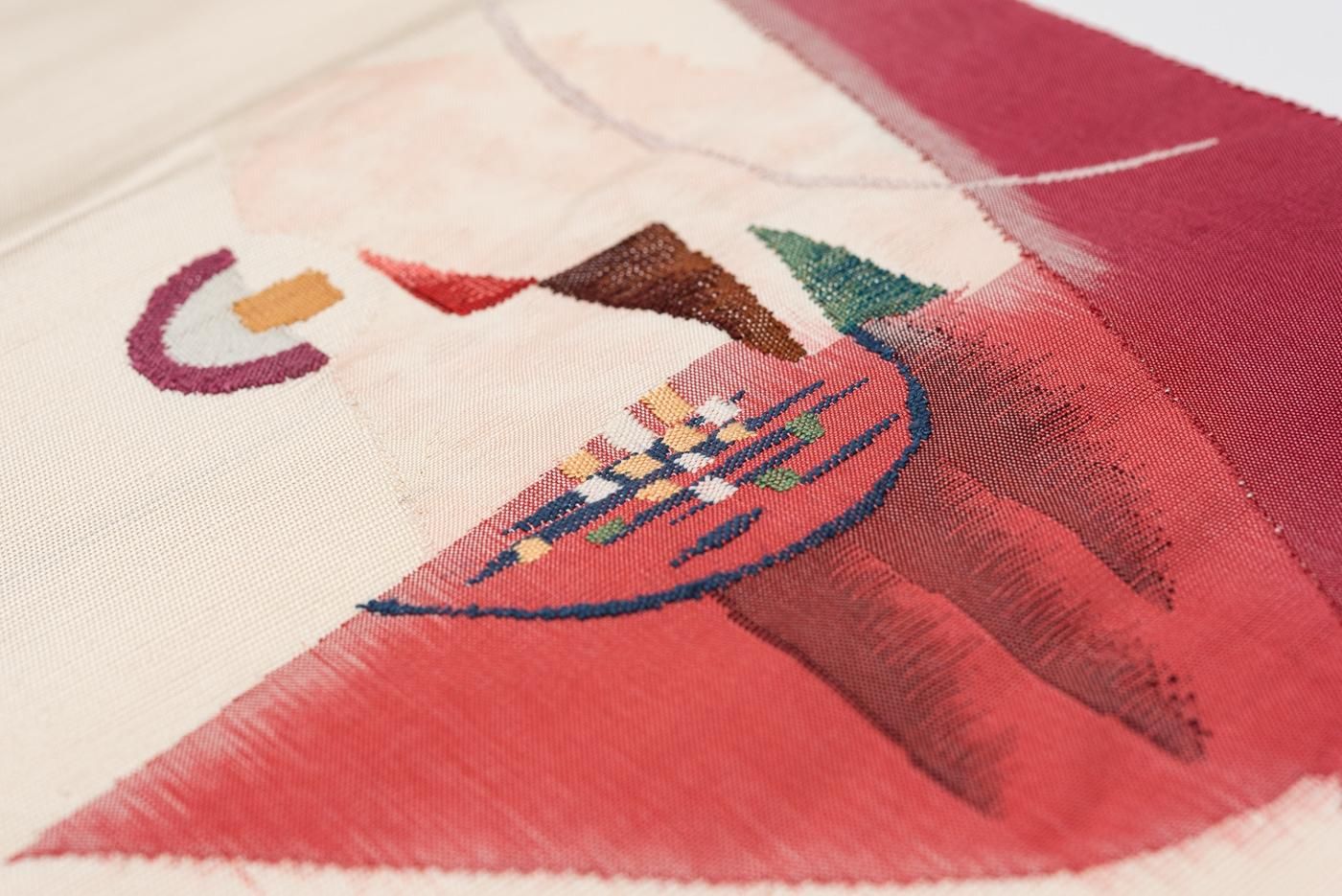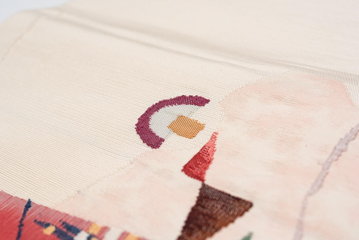 カラフルな抽象的を織り出した紬地の八寸名古屋帯です。