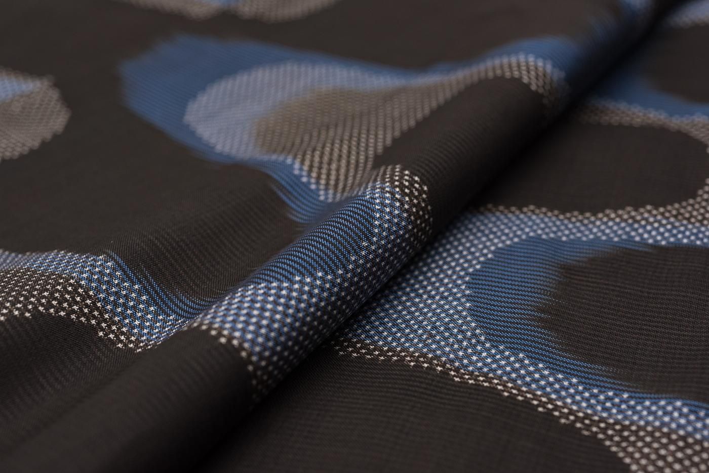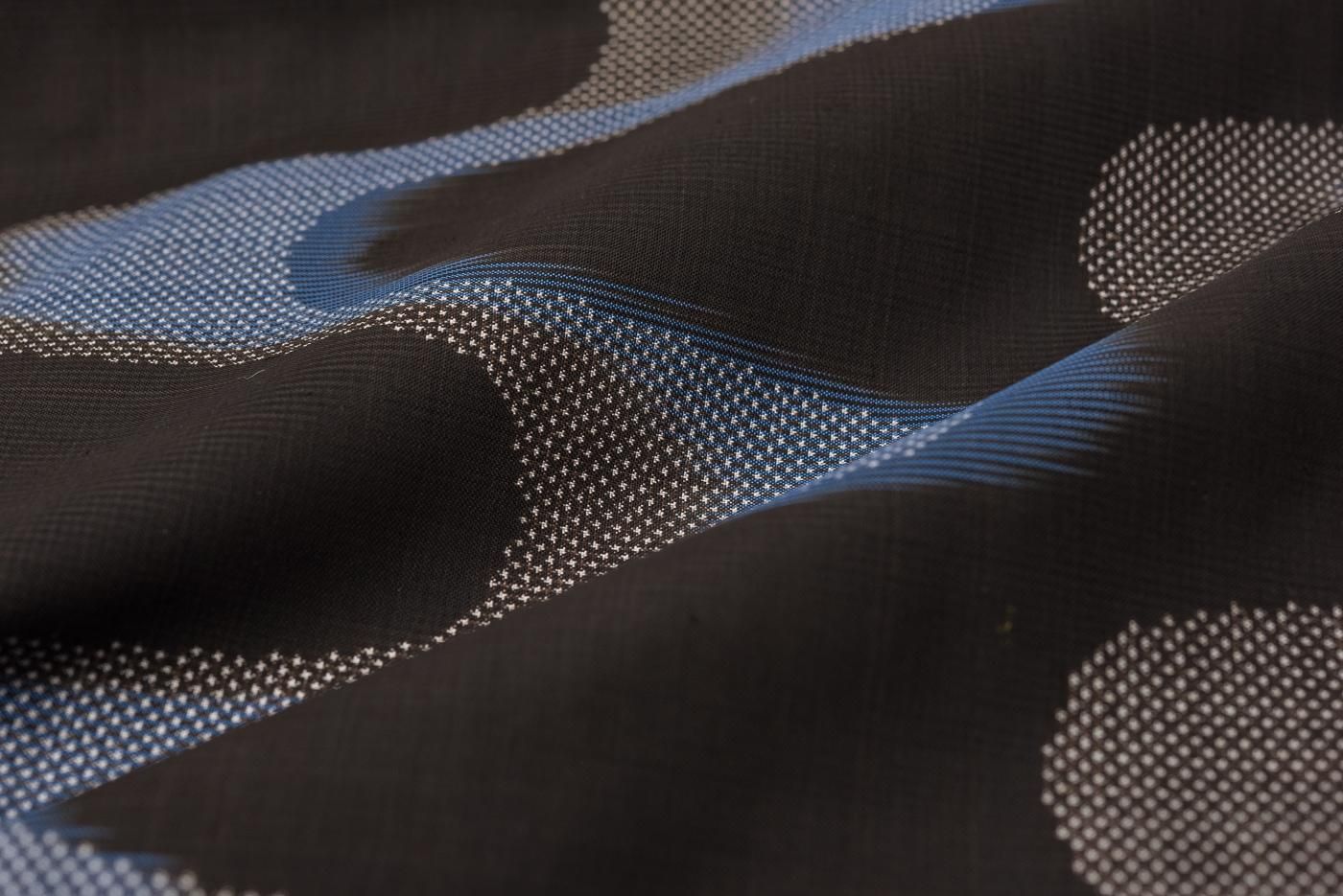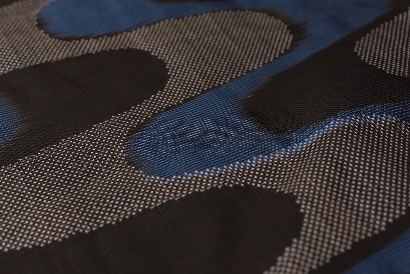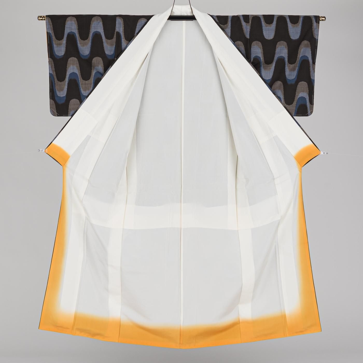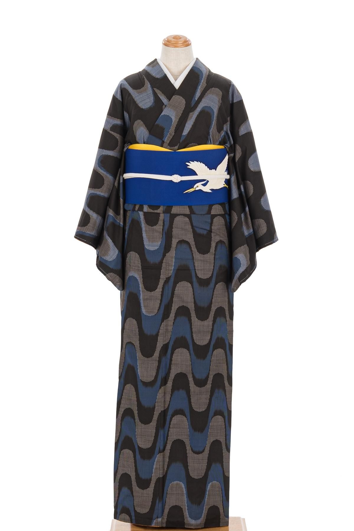 ぐにゃりと歪んだユニークな曲線模様を織り出した大島紬の着物です。