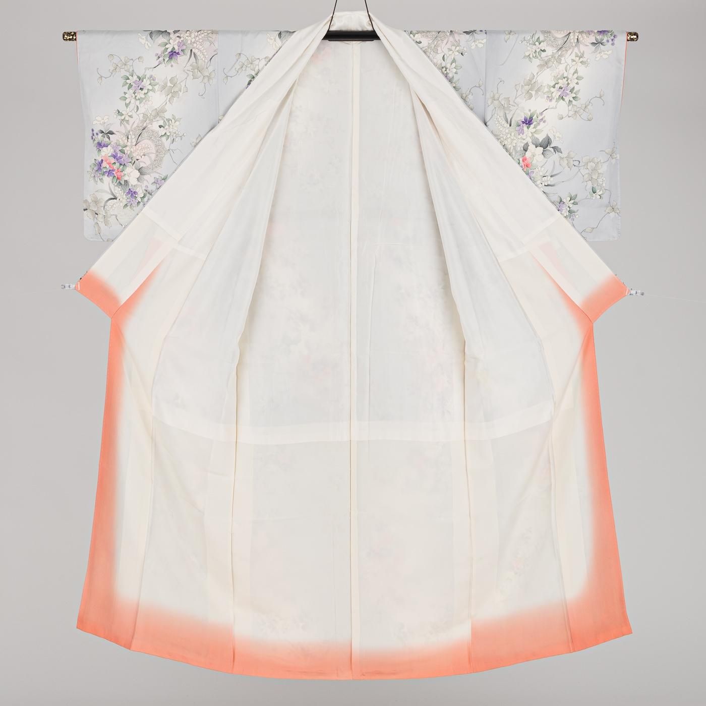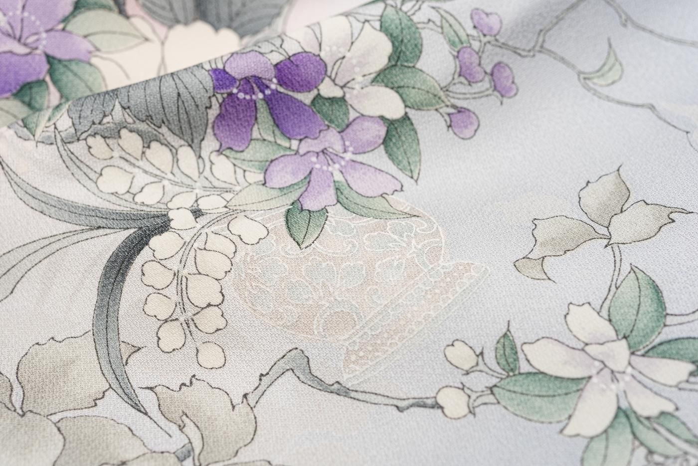 ブルーグレーの暈し地に色鮮やかな洋花を染めた小紋の着物です。