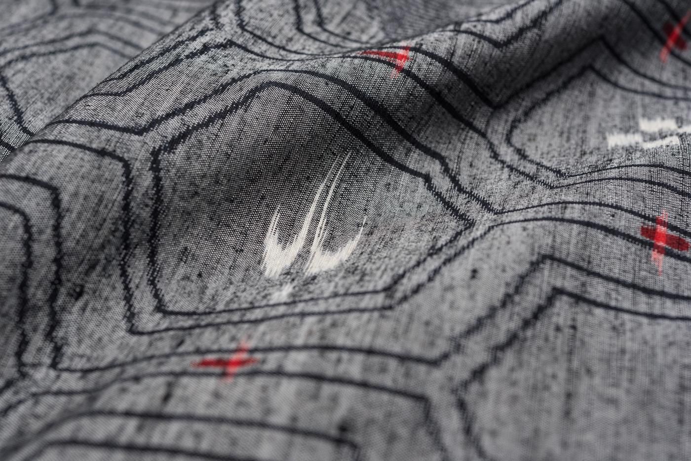 濃いグレーの地に亀甲と絣柄を織り紬の着物です。