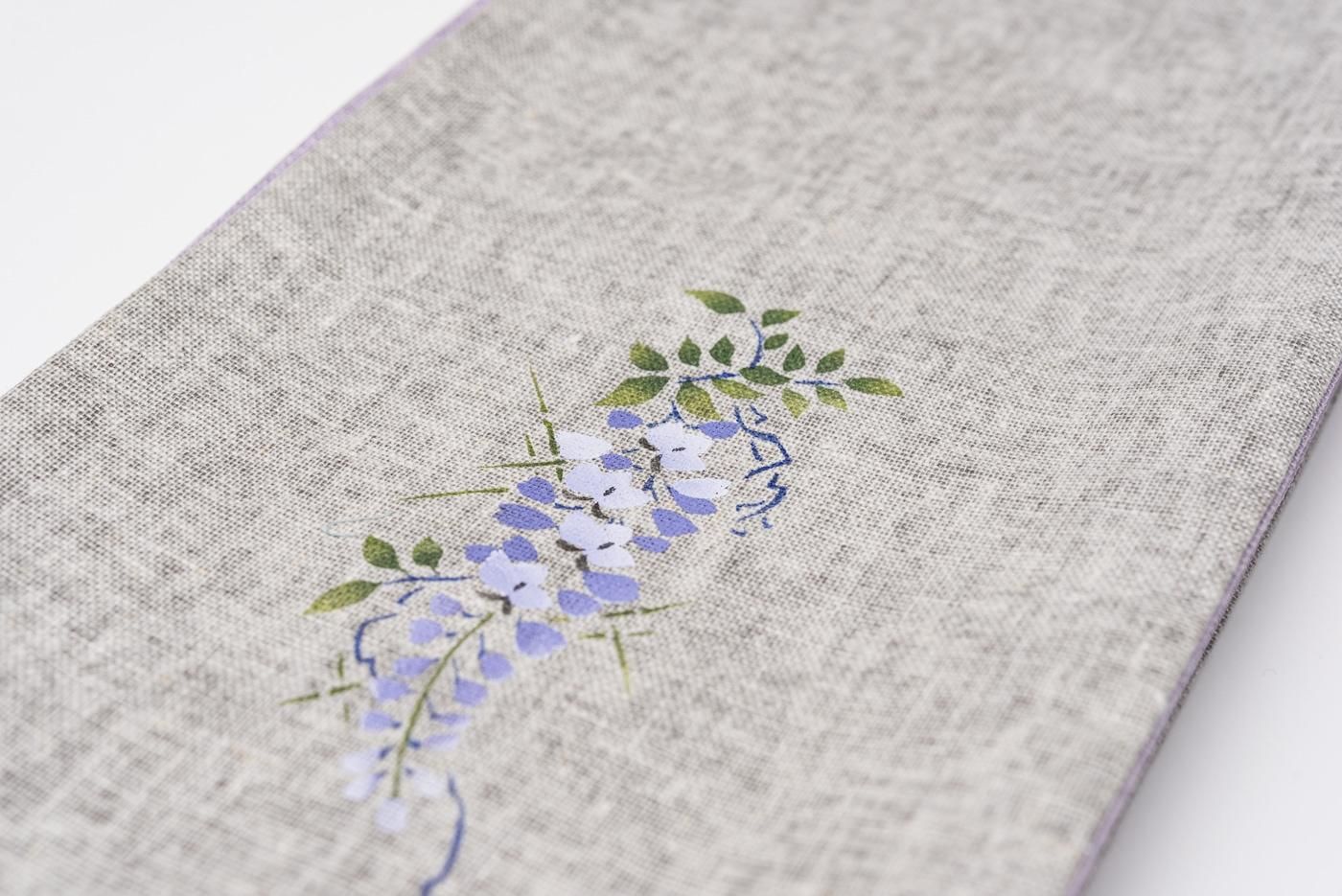 締めると前側に藤の柄が出て、背中側は無地となります。