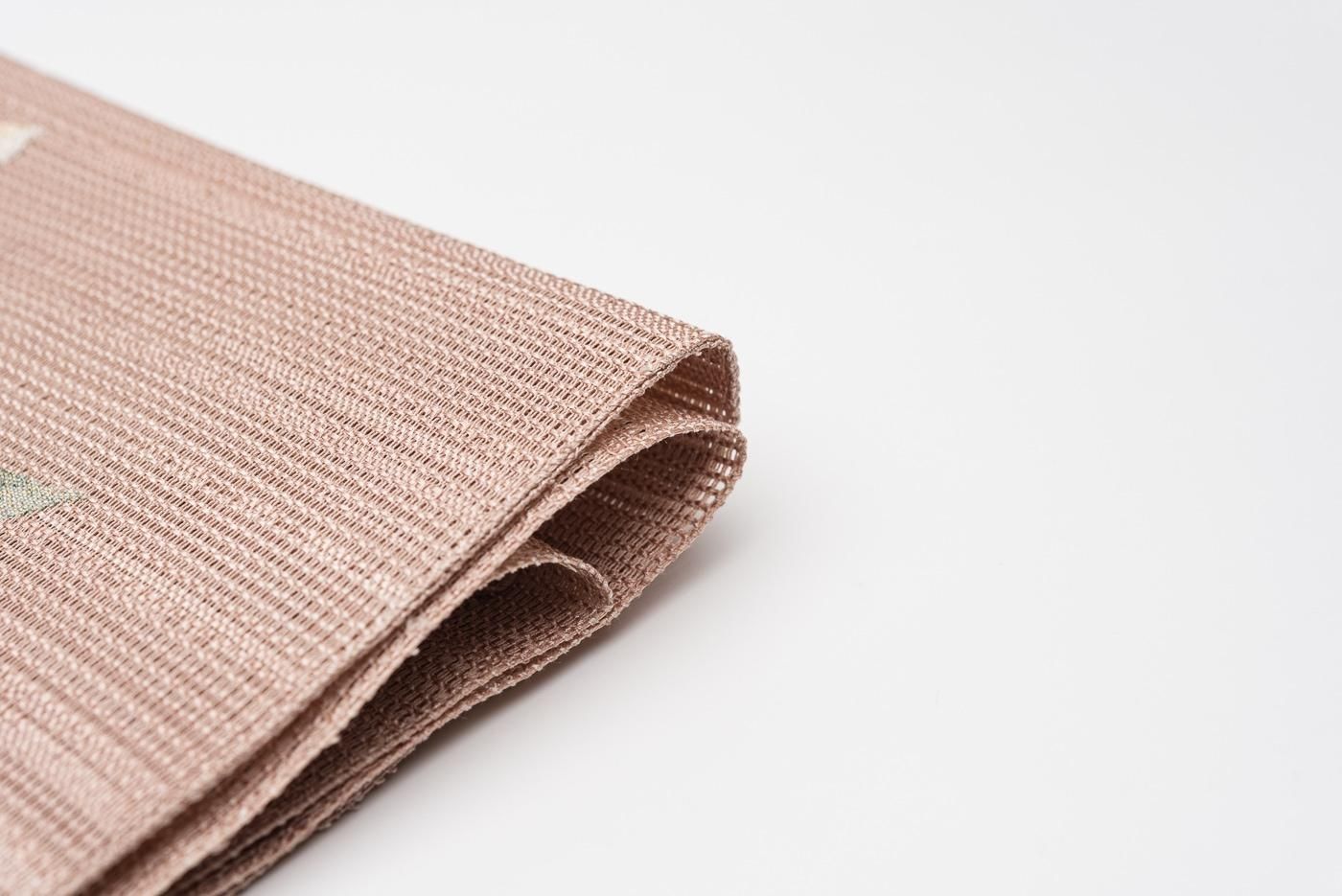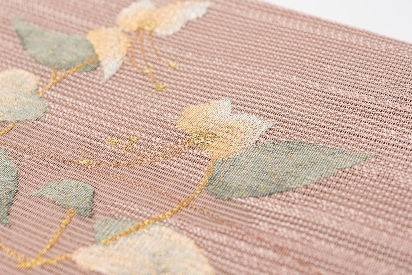 淡いベージュブラウンの地に小ぶりの葉模様を織り出した夏帯です。