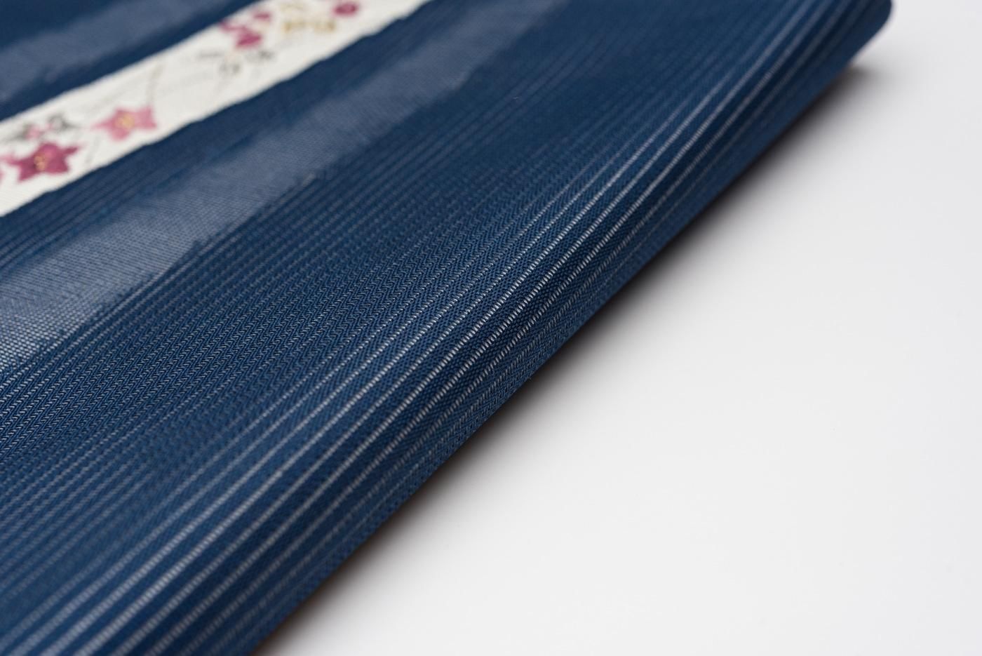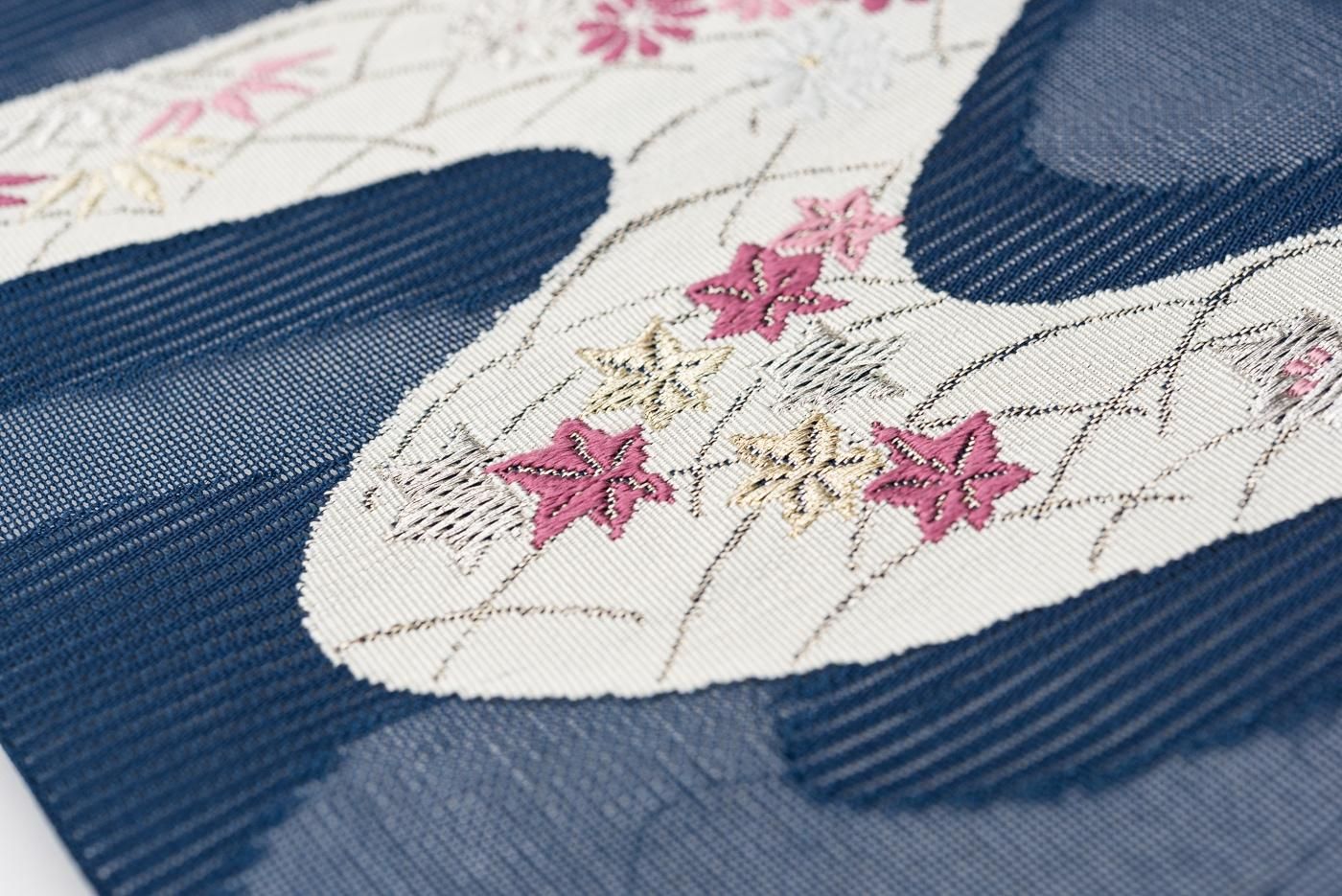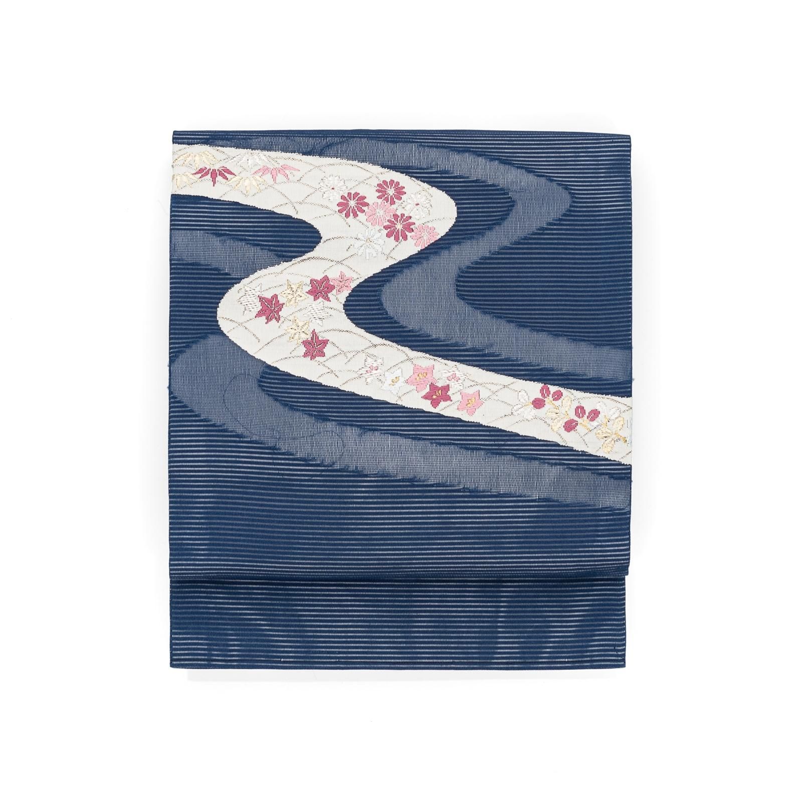 落ち着いた青地に流水模様を織り出した絽の九寸名古屋帯です。